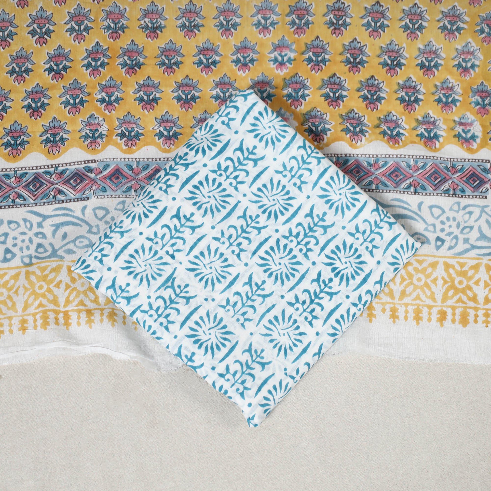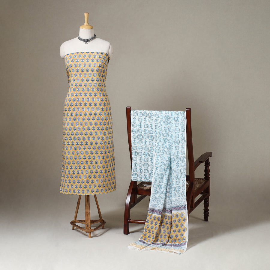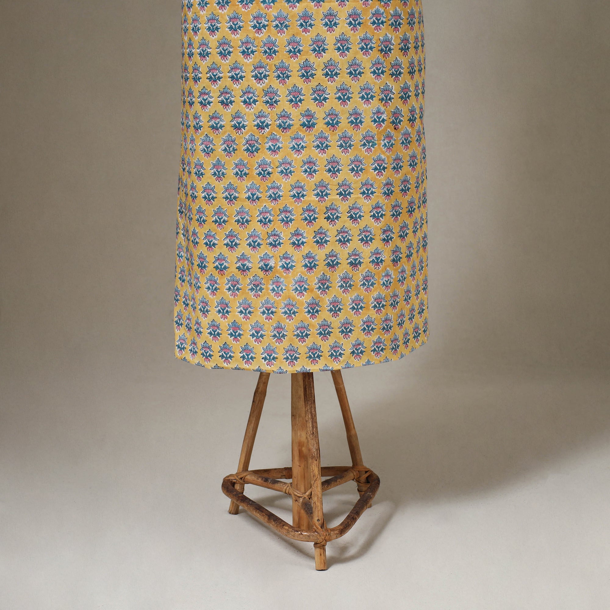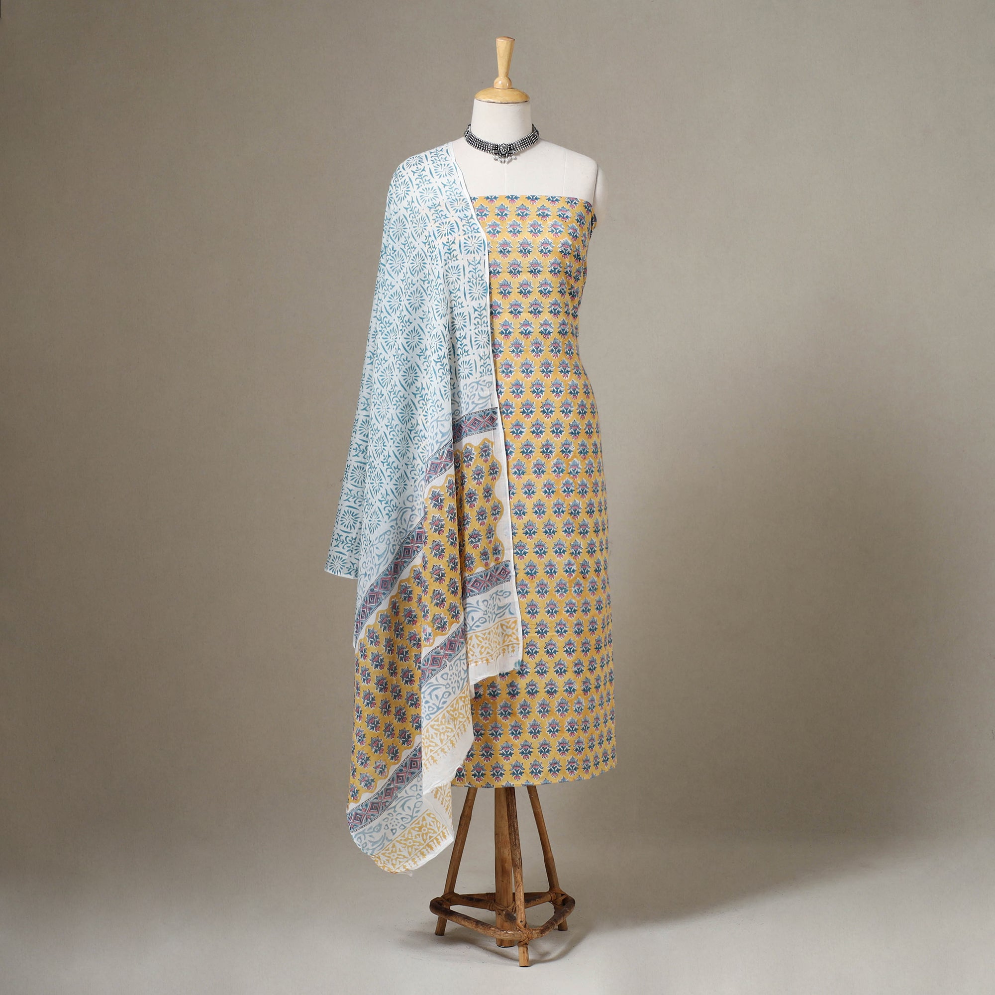 This yellow 3pc sanganeri cotton dress material is crafted using traditional hand block printing from Sanganer, a village located in the southern part of Jaipur, Rajasthan. The set includes fabric for a kurta, bottom, and dupatta, making it ideal for custom tailoring. Its soft cotton base and intricate floral patterns offer both everyday comfort and festive charm.