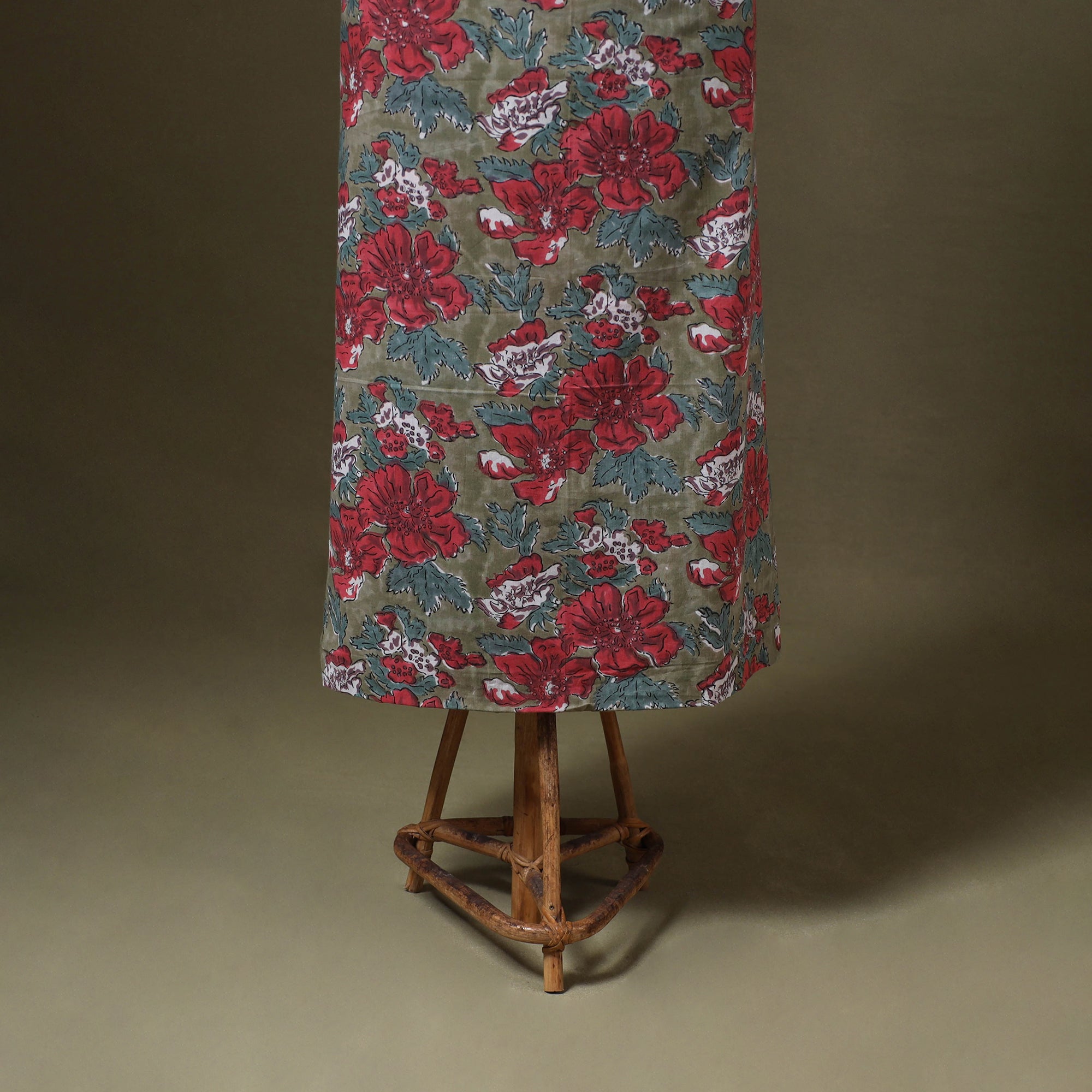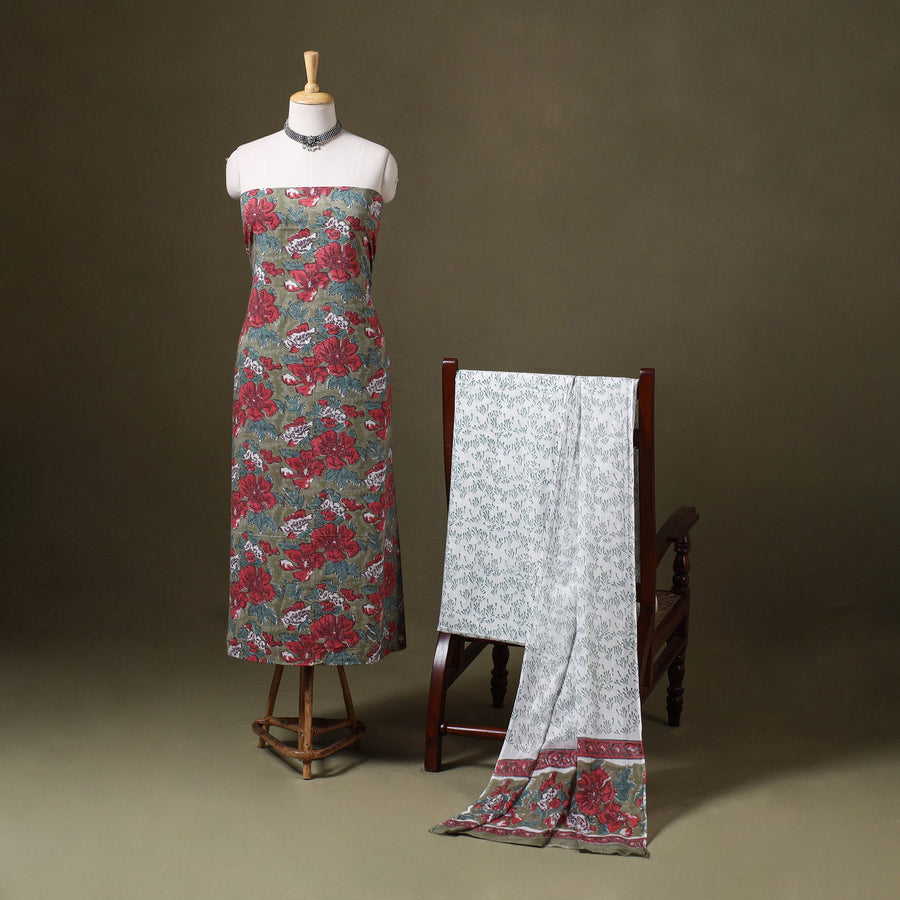 This green 3pc sanganeri cotton dress material is crafted using traditional hand block printing from Sanganer, a town in the southern part of Jaipur, Rajasthan. The set includes a kurta fabric, bottom fabric, and a dupatta, perfect for custom tailoring. The soft cotton and intricate floral motifs make it ideal for everyday comfort as well as festive occasions.