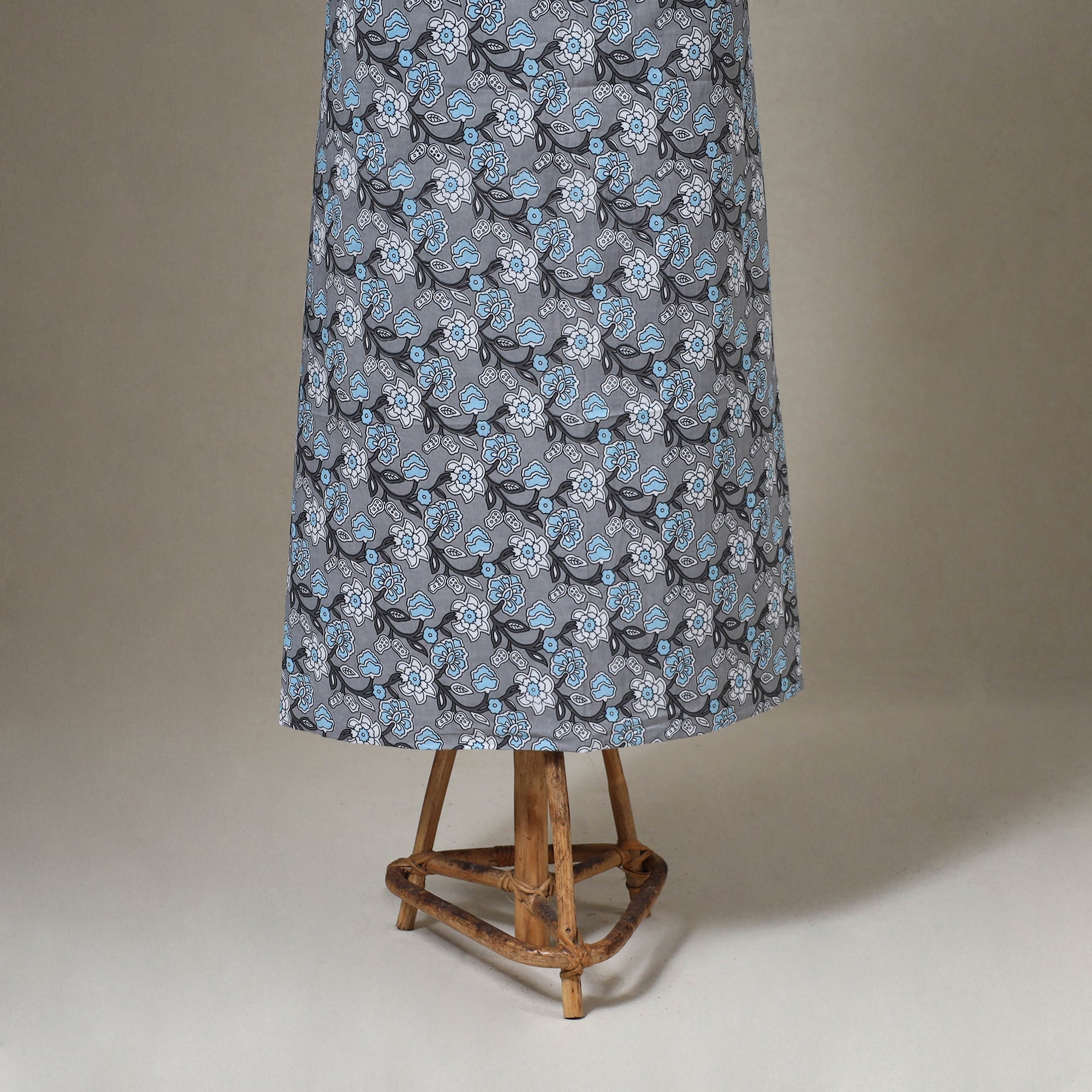 This grey 3pc sanganeri cotton dress material is crafted using traditional hand block printing from Sanganer, a village located in the southern part of Jaipur, Rajasthan. The set includes fabric for a kurta, bottom, and dupatta, making it ideal for custom tailoring. Its soft cotton base and intricate floral patterns offer both everyday comfort and festive charm.
