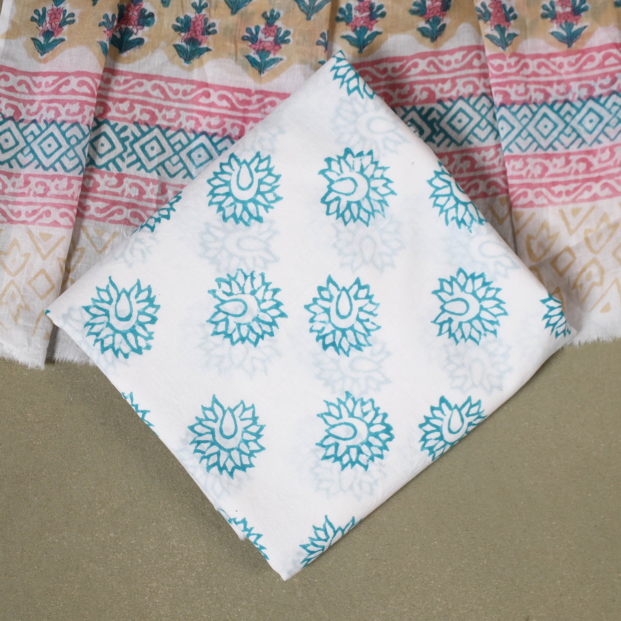 This beige 3pc sanganeri cotton dress material is crafted using traditional hand block printing from Sanganer, a town in the southern part of Jaipur, Rajasthan. The set includes a kurta fabric, bottom fabric, and a dupatta, perfect for custom tailoring. The soft cotton and intricate floral motifs make it ideal for everyday comfort as well as festive occasions.