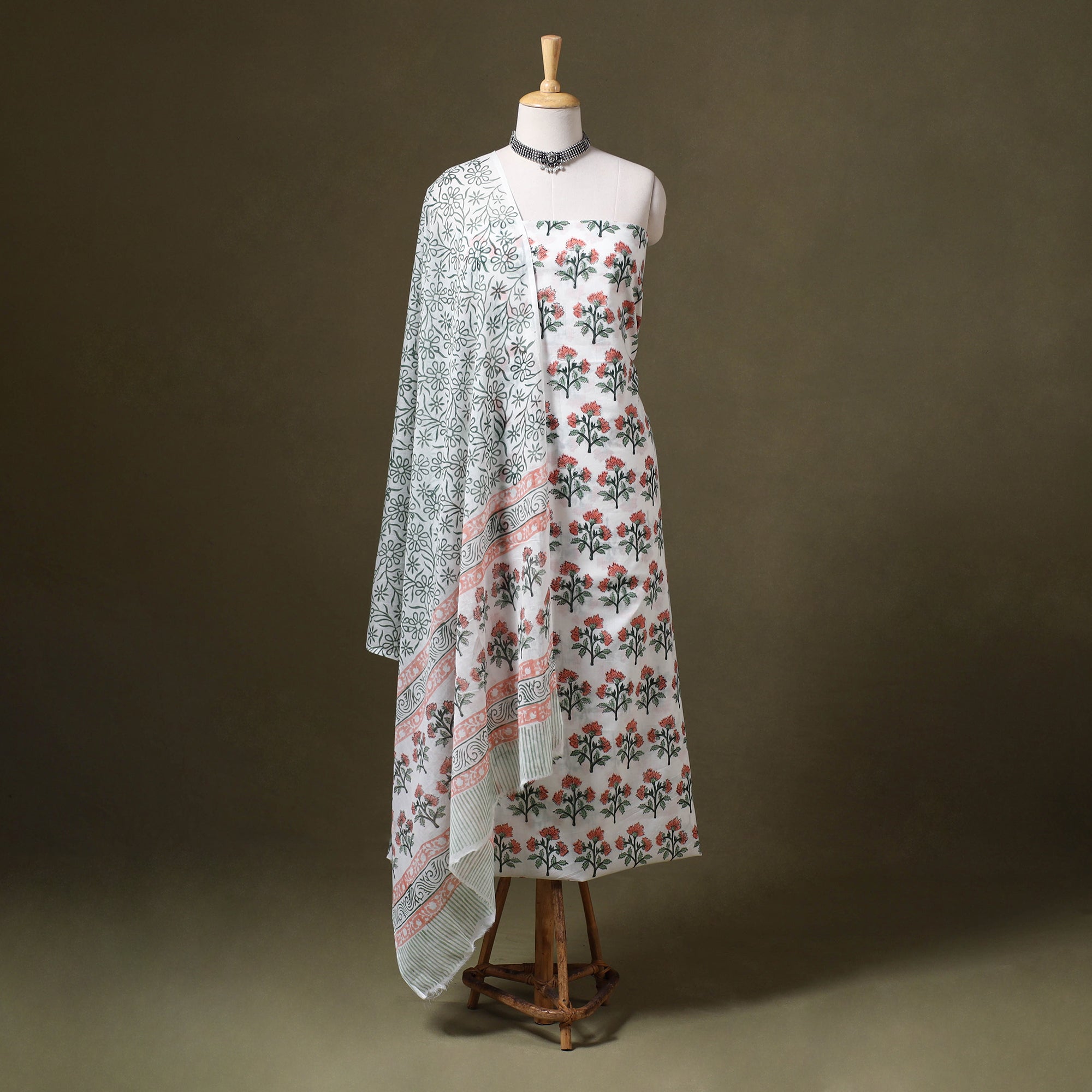 This white 3pc sanganeri cotton dress material is crafted using traditional hand block printing from Sanganer, a town in the southern part of Jaipur, Rajasthan. The set includes a kurta fabric, bottom fabric, and a dupatta, perfect for custom tailoring. The soft cotton and intricate floral motifs make it ideal for everyday comfort as well as festive occasions.