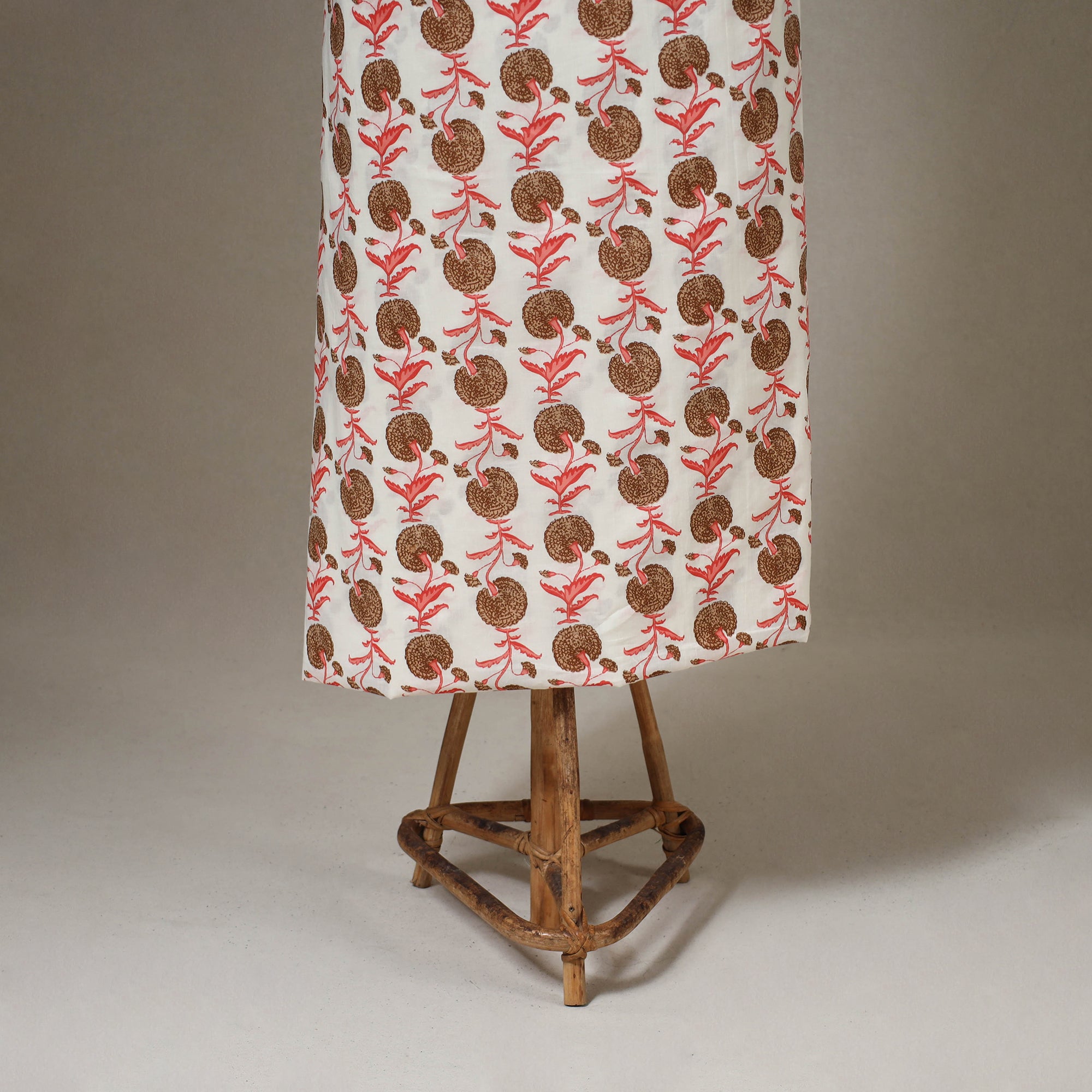 This beige 3pc sanganeri cotton dress material is crafted using traditional hand block printing from Sanganer, a village located in the southern part of Jaipur, Rajasthan. The set includes fabric for a kurta, bottom, and dupatta, making it ideal for custom tailoring. Its soft cotton base and intricate floral patterns offer both everyday comfort and festive charm.