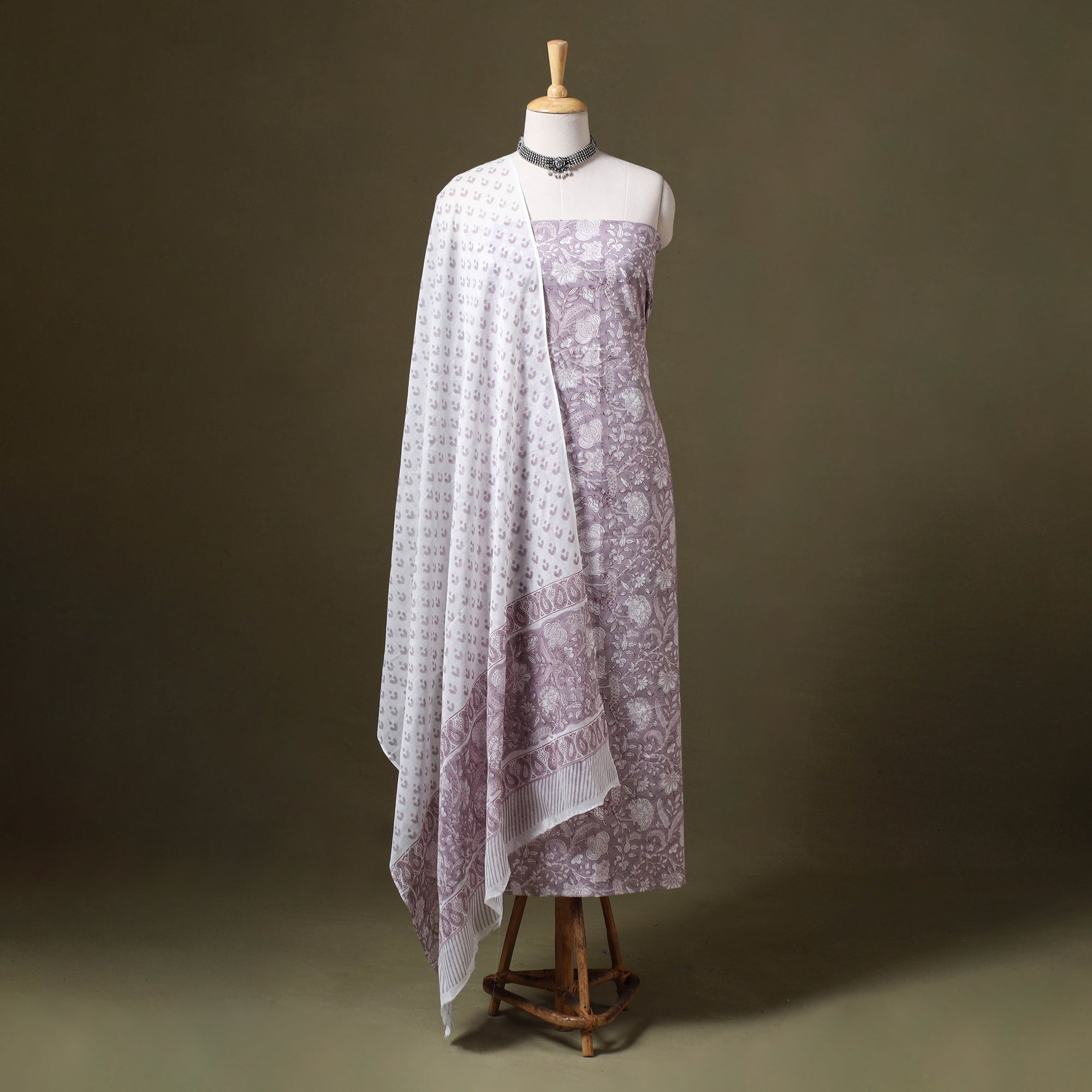 This purple 3pc sanganeri cotton dress material is crafted using traditional hand block printing from Sanganer, a town in the southern part of Jaipur, Rajasthan. The set includes a kurta fabric, bottom fabric, and a dupatta, perfect for custom tailoring. The soft cotton and intricate floral motifs make it ideal for everyday comfort as well as festive occasions.