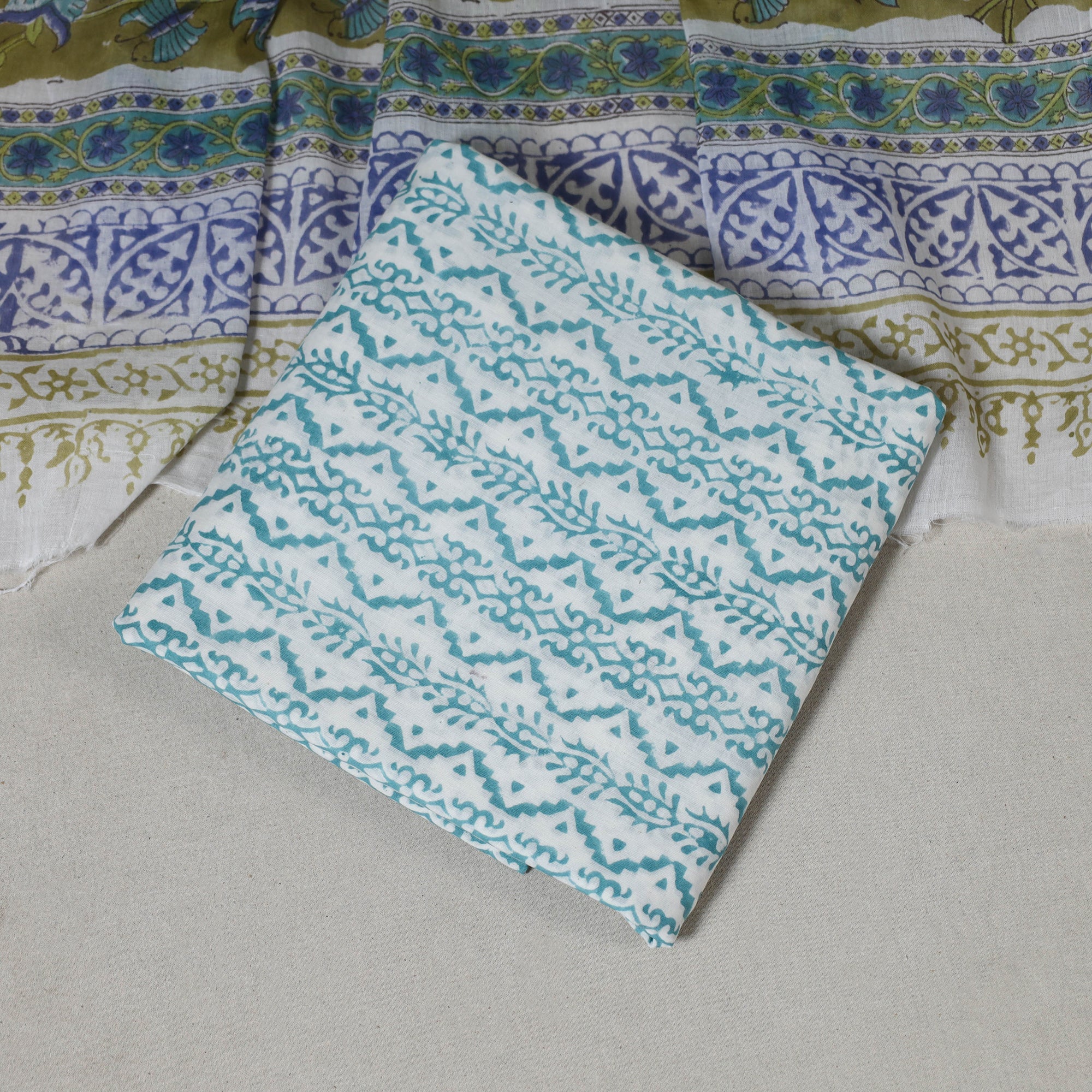 This green 3pc sanganeri cotton dress material is crafted using traditional hand block printing from Sanganer, a village located in the southern part of Jaipur, Rajasthan. The set includes fabric for a kurta, bottom, and dupatta, making it ideal for custom tailoring. Its soft cotton base and intricate floral patterns offer both everyday comfort and festive charm.