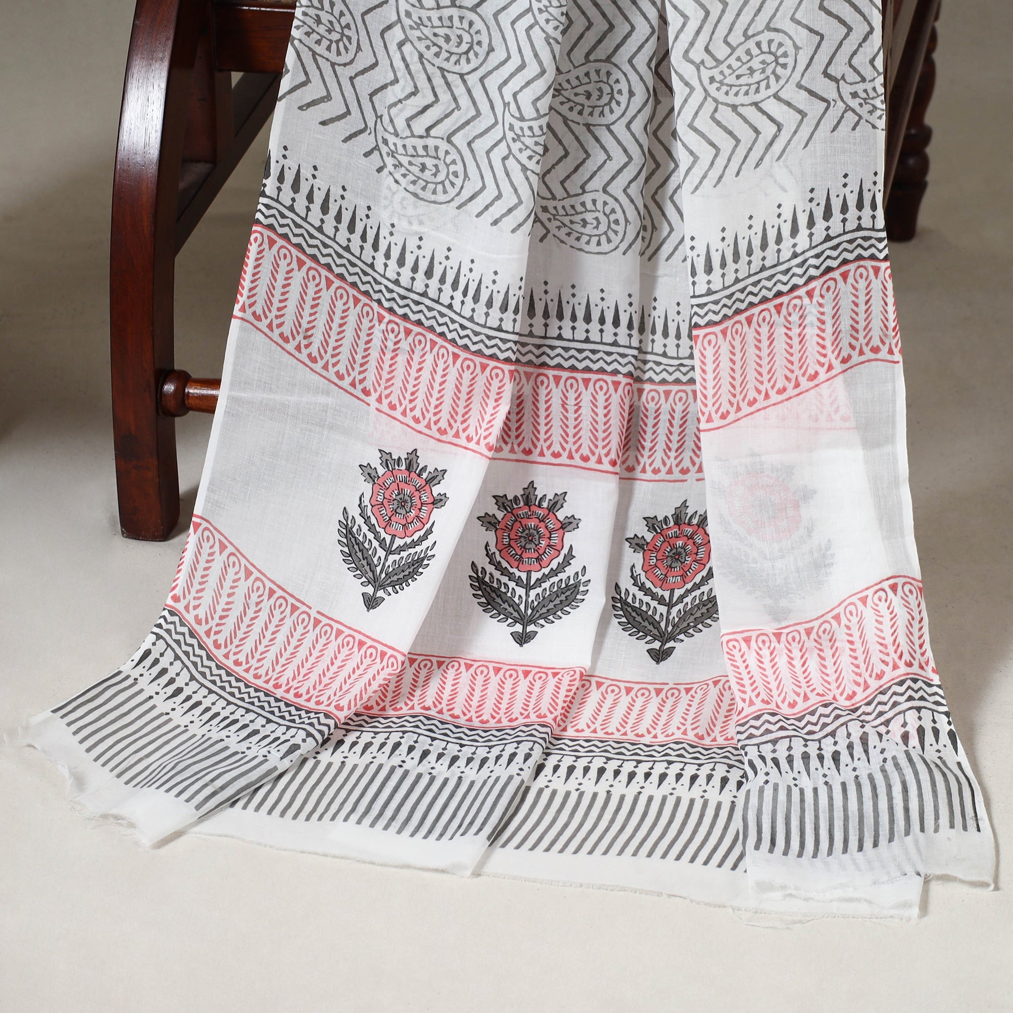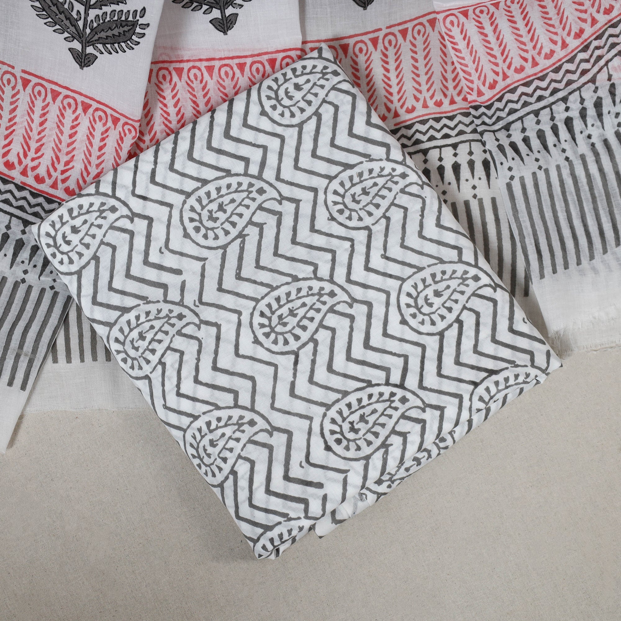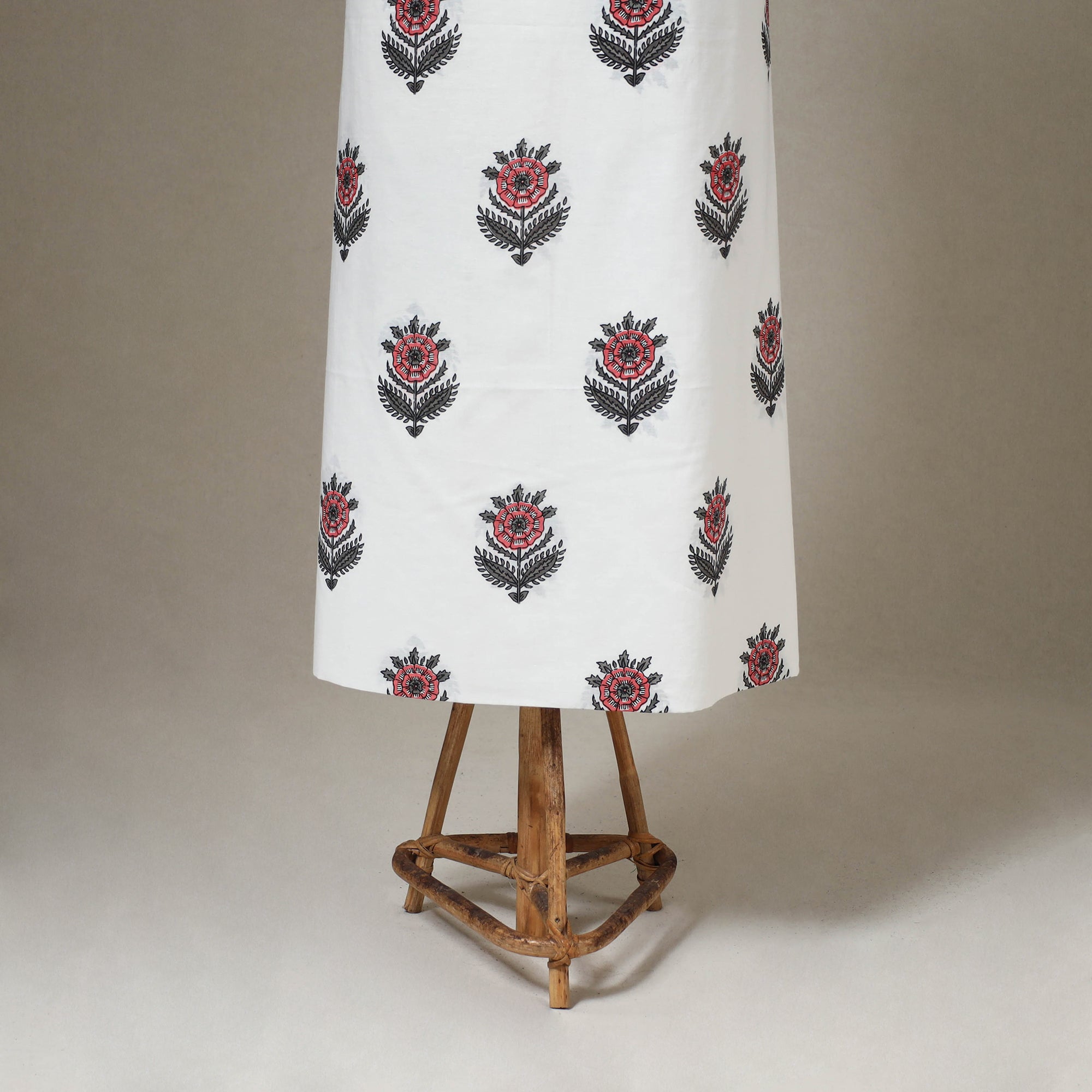 This white 3pc sanganeri cotton dress material is crafted using traditional hand block printing from Sanganer, a village located in the southern part of Jaipur, Rajasthan. The set includes fabric for a kurta, bottom, and dupatta, making it ideal for custom tailoring. Its soft cotton base and intricate floral patterns offer both everyday comfort and festive charm.