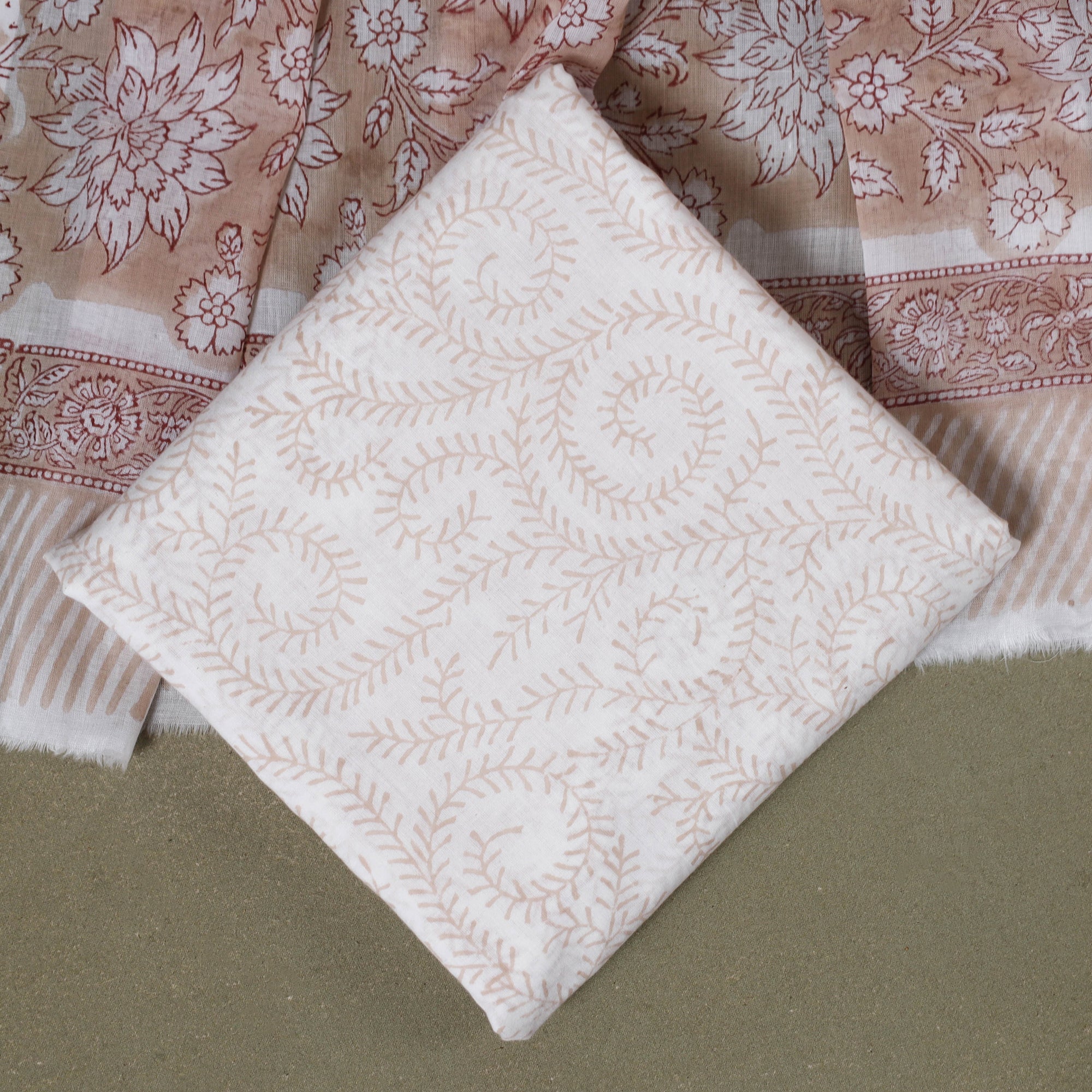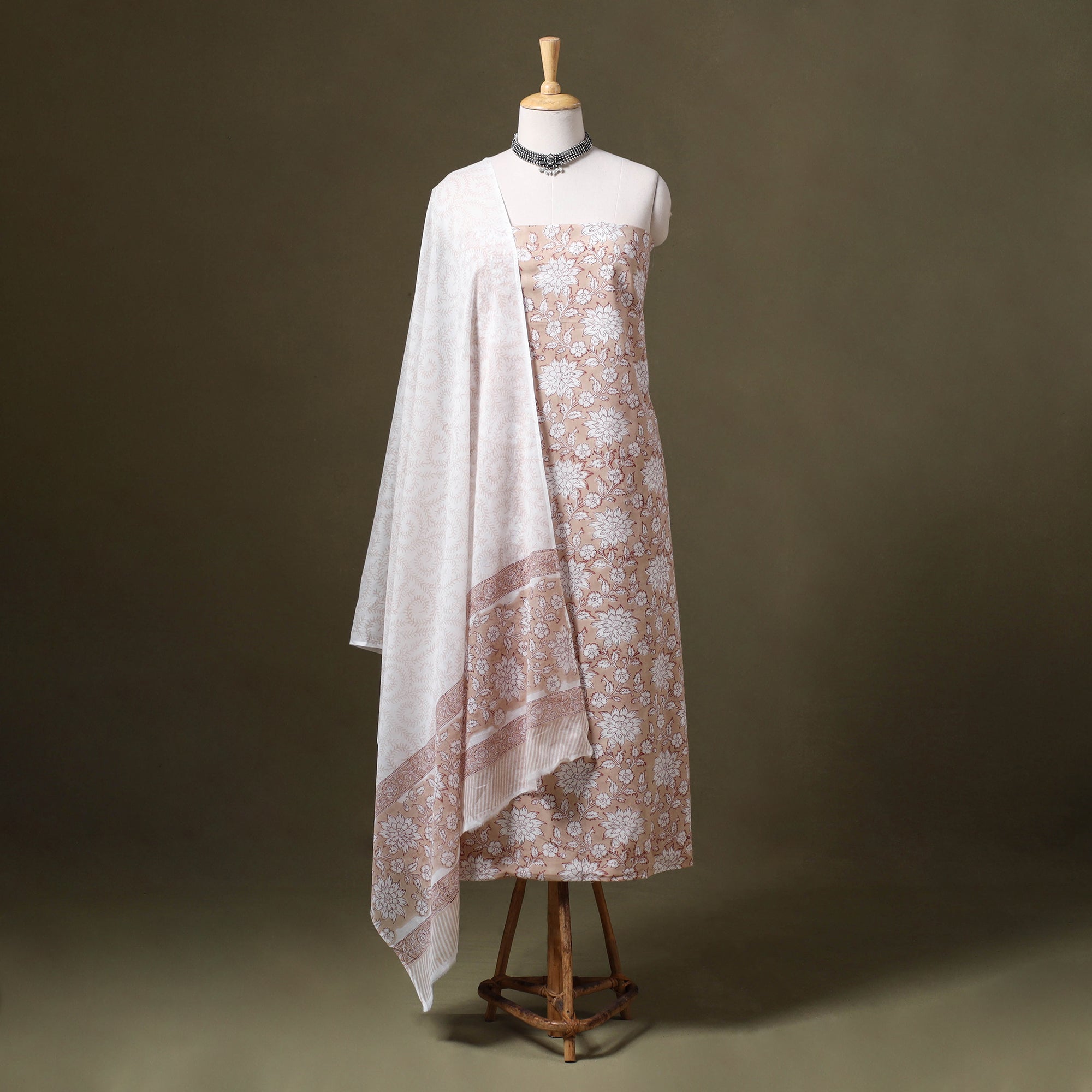 This brown 3pc sanganeri cotton dress material is crafted using traditional hand block printing from Sanganer, a town in the southern part of Jaipur, Rajasthan. The set includes a kurta fabric, bottom fabric, and a dupatta, perfect for custom tailoring. The soft cotton and intricate floral motifs make it ideal for everyday comfort as well as festive occasions.