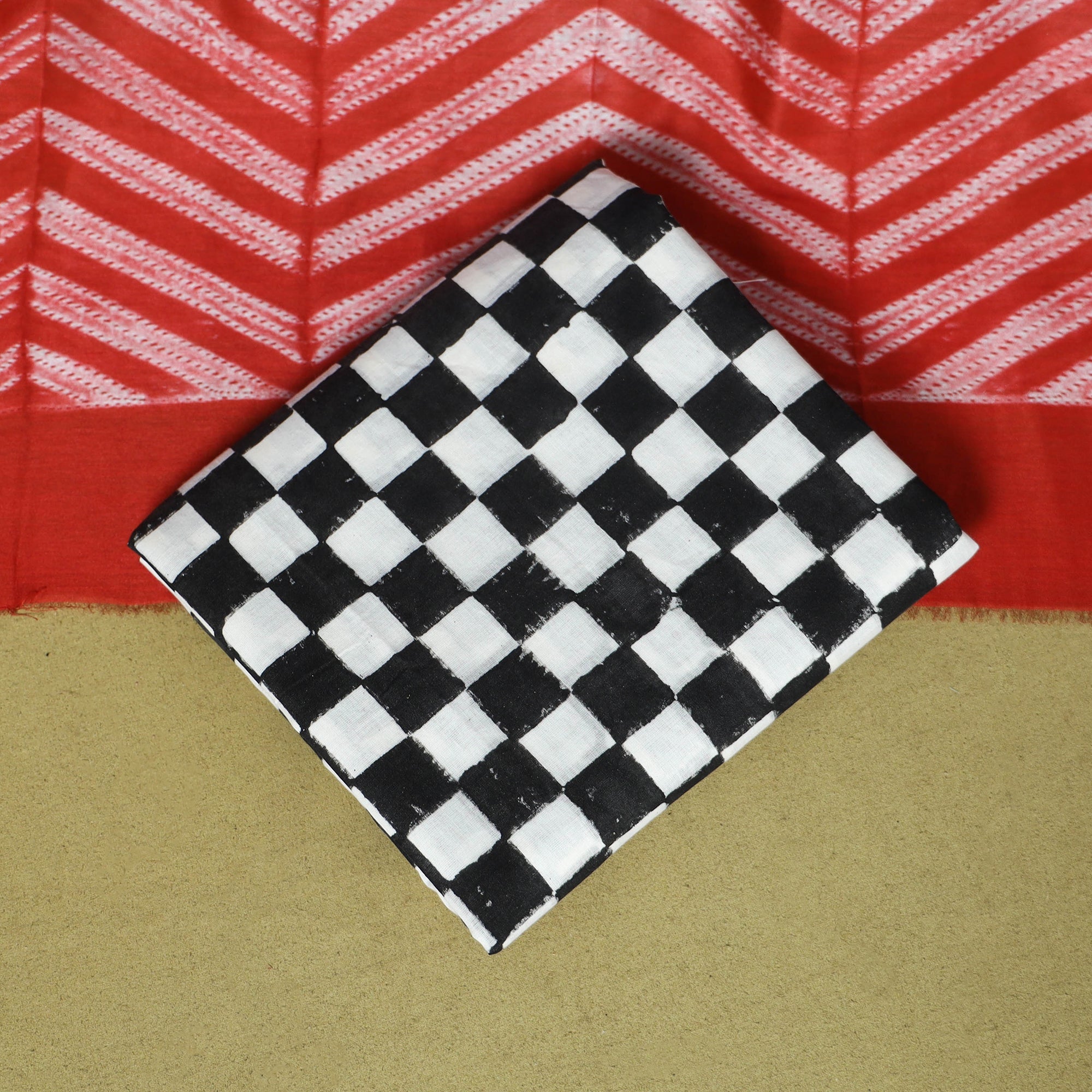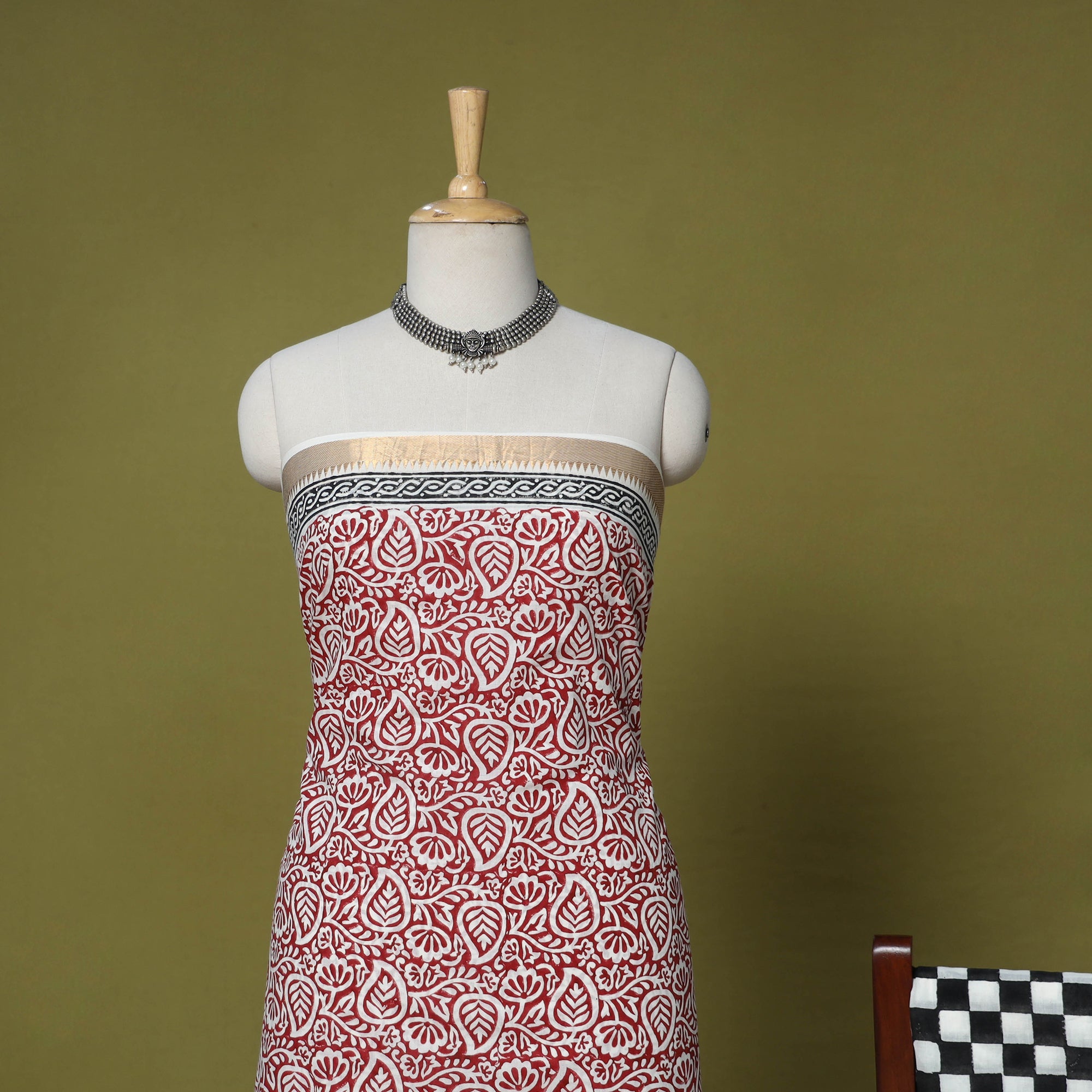 Elevate your wardrobe with this maroon 3pc block print cotton mangalagiri dress material set from Andhra Pradesh. Known for its softness and durability, both the kurta and dupatta feature a zari border, while the set comes paired with a matching plain bottom. Perfect for both special occasions and casual outings.