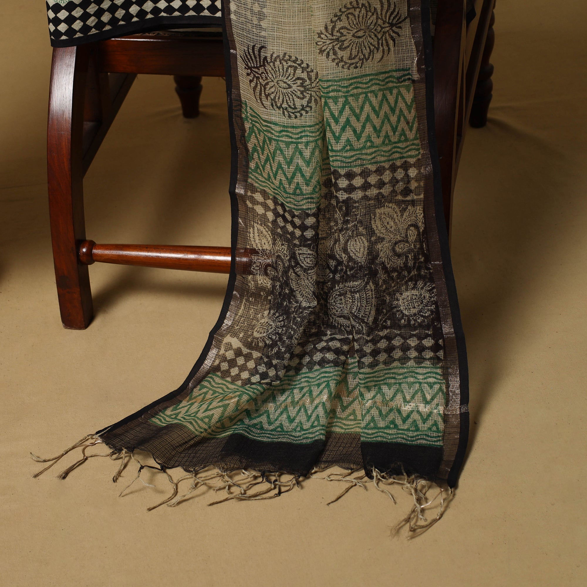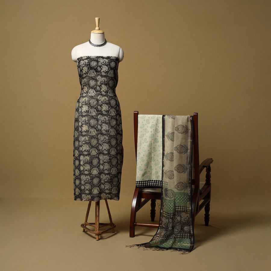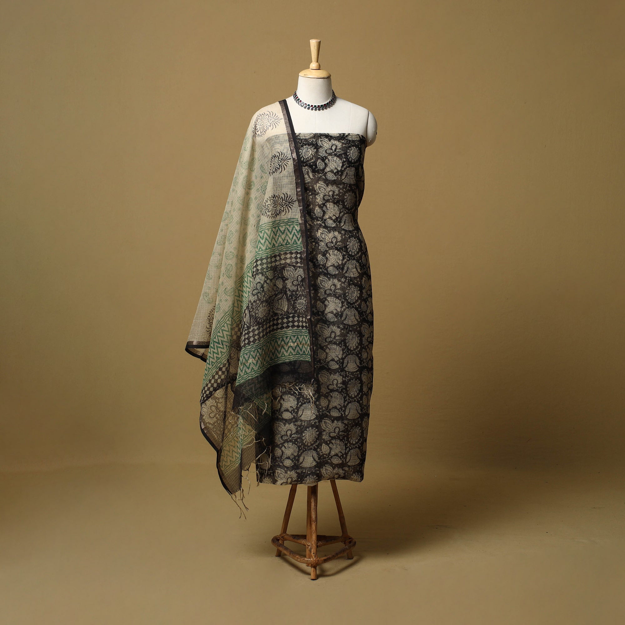 3pc bagru dress material set blends comfort with traditional Rajasthani artistry. The kurta fabric and dupatta are made from airy Kota Doria, while the bottom is cotton for easy wear. Featuring classic bagru block prints, the fabric is printed by skilled artisans from Rajasthan using hand-carved wooden blocks, creating a graceful look suitable for everyday wear and light festive occasions.