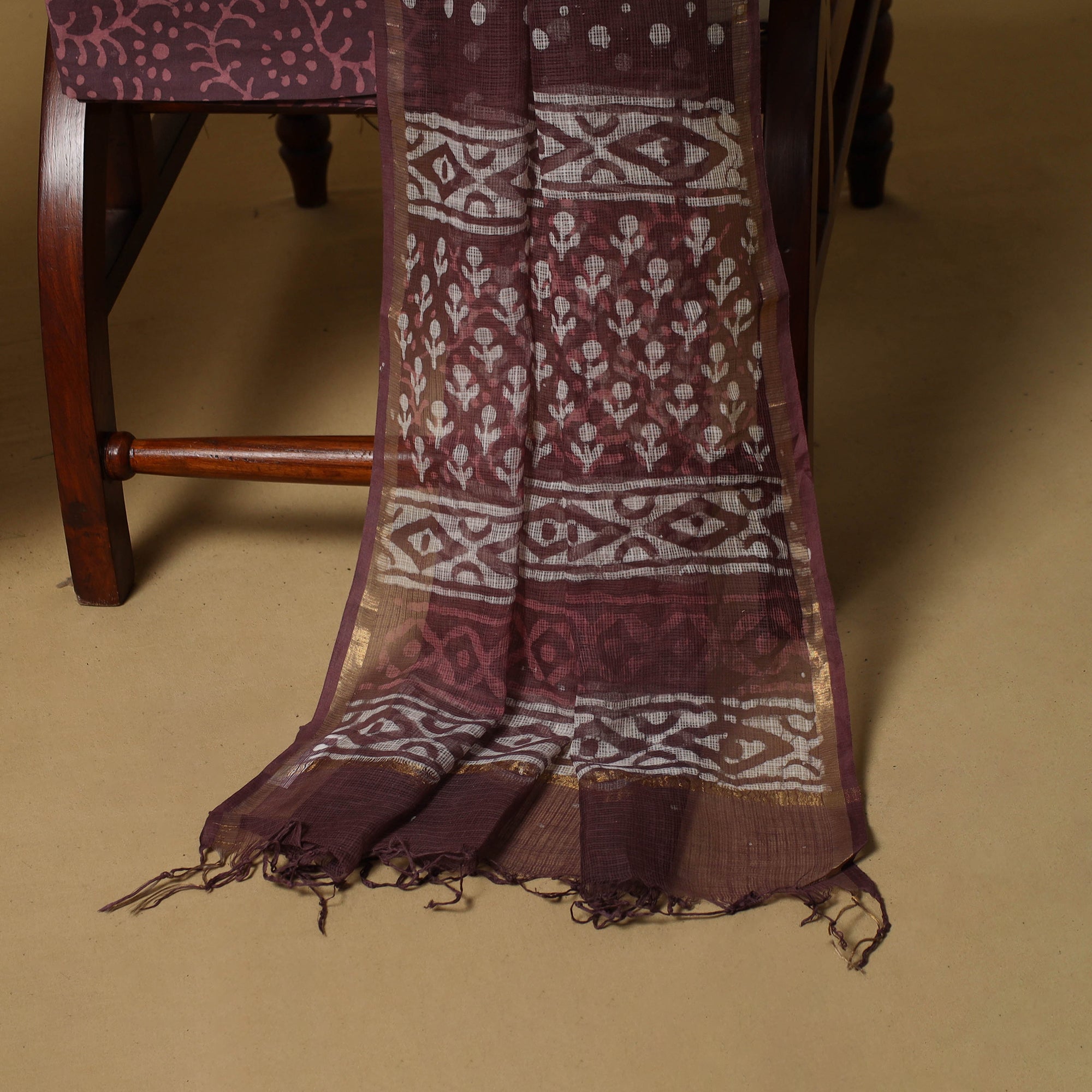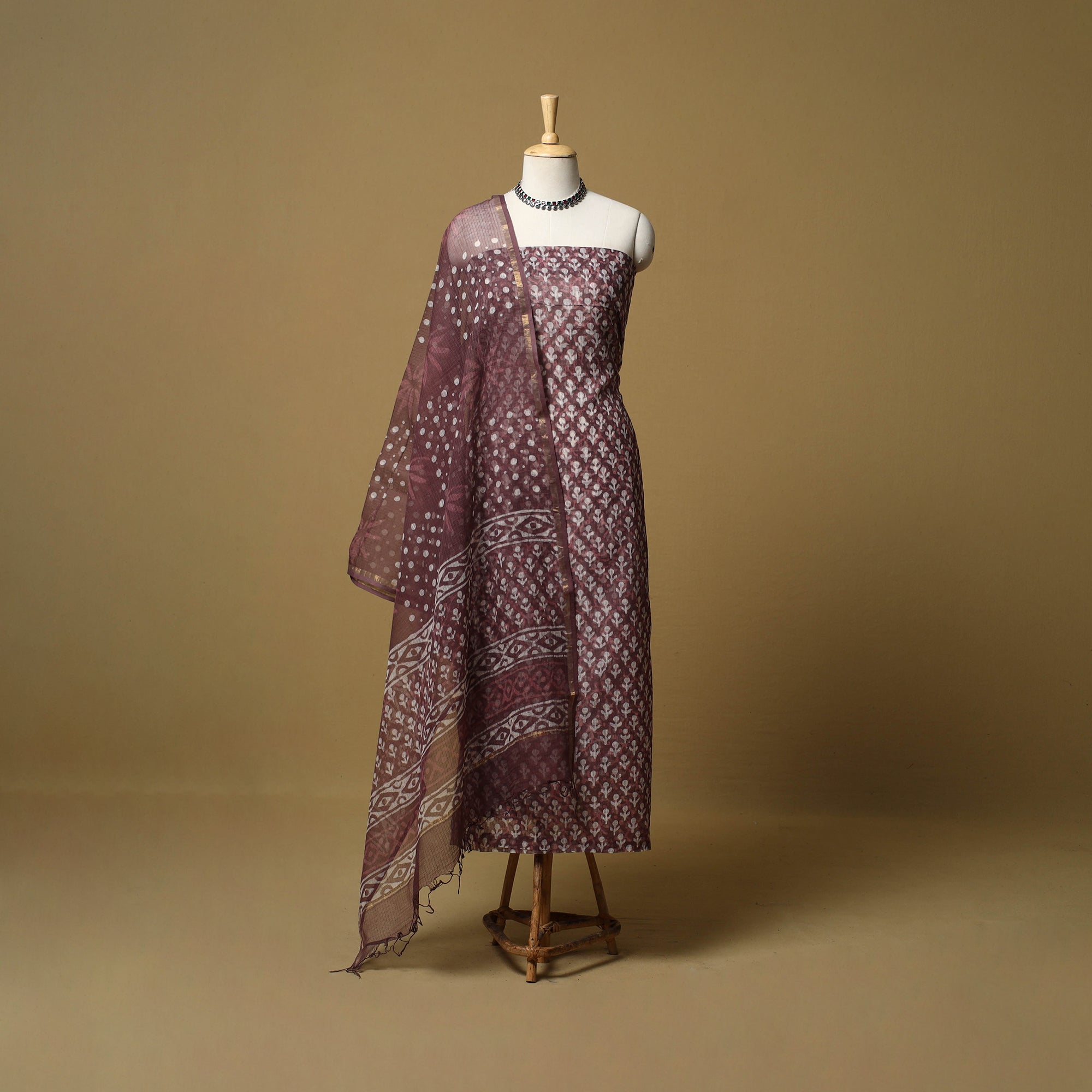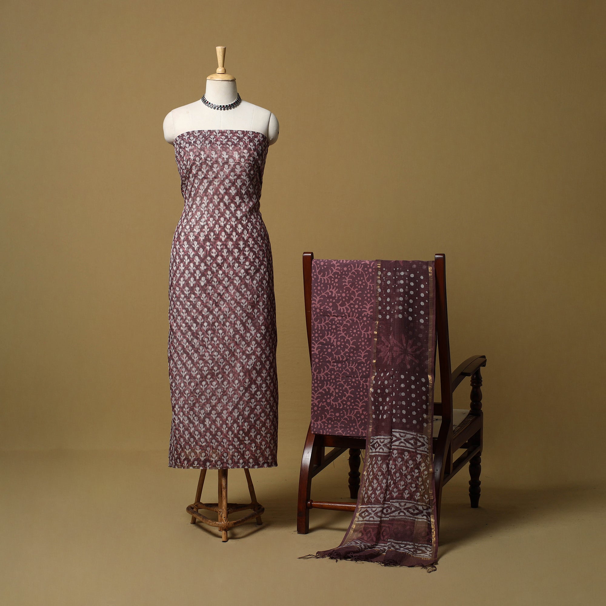 3pc bagru dress material set blends comfort with traditional Rajasthani artistry. The kurta fabric and dupatta are made from airy Kota Doria, while the bottom is cotton for easy wear. Featuring classic bagru block prints, the fabric is printed by skilled artisans from Rajasthan using hand-carved wooden blocks, creating a graceful look suitable for everyday wear and light festive occasions.