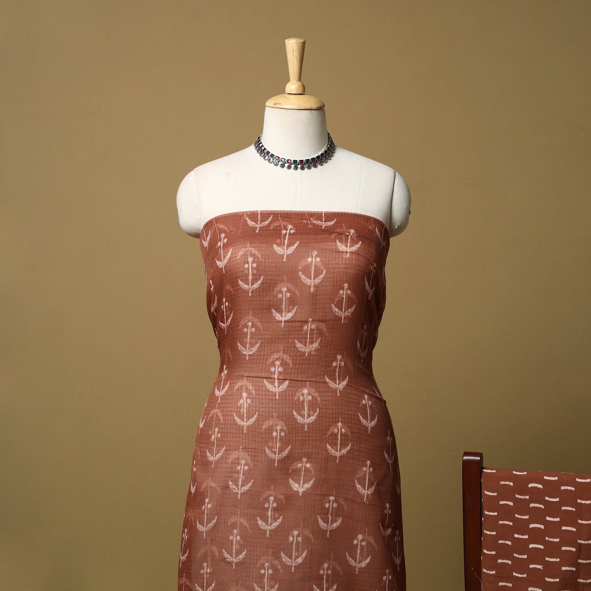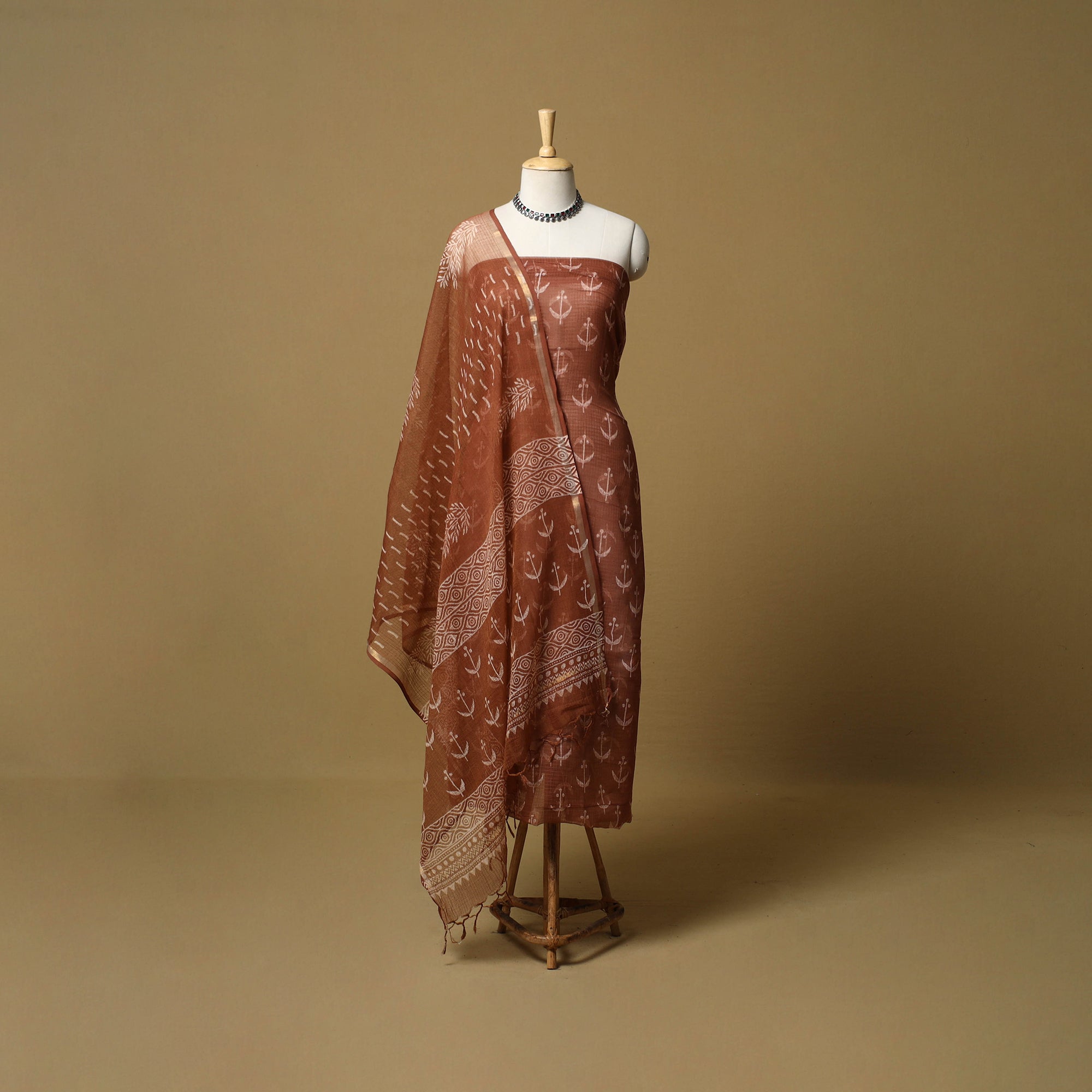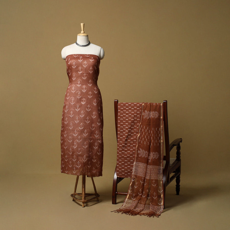 3pc bagru dress material set blends comfort with traditional Rajasthani artistry. The kurta fabric and dupatta are made from airy Kota Doria, while the bottom is cotton for easy wear. Featuring classic bagru block prints, the fabric is printed by skilled artisans from Rajasthan using hand-carved wooden blocks, creating a graceful look suitable for everyday wear and light festive occasions.