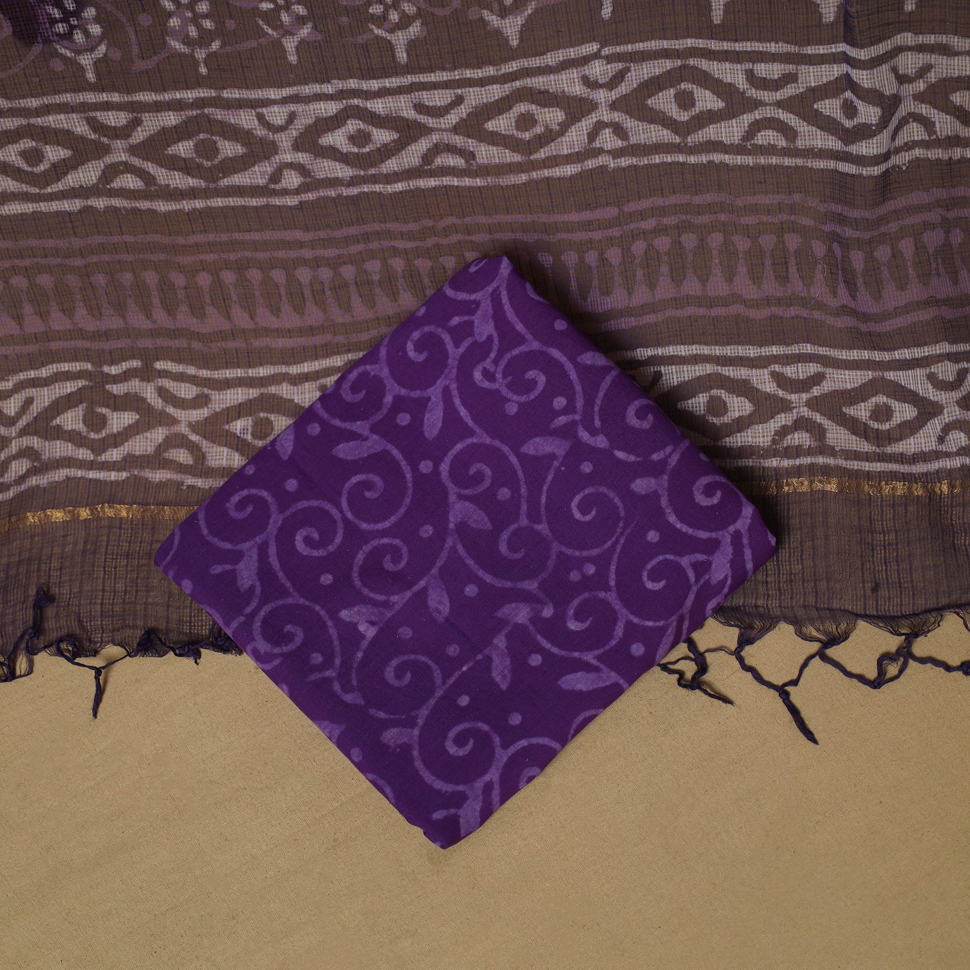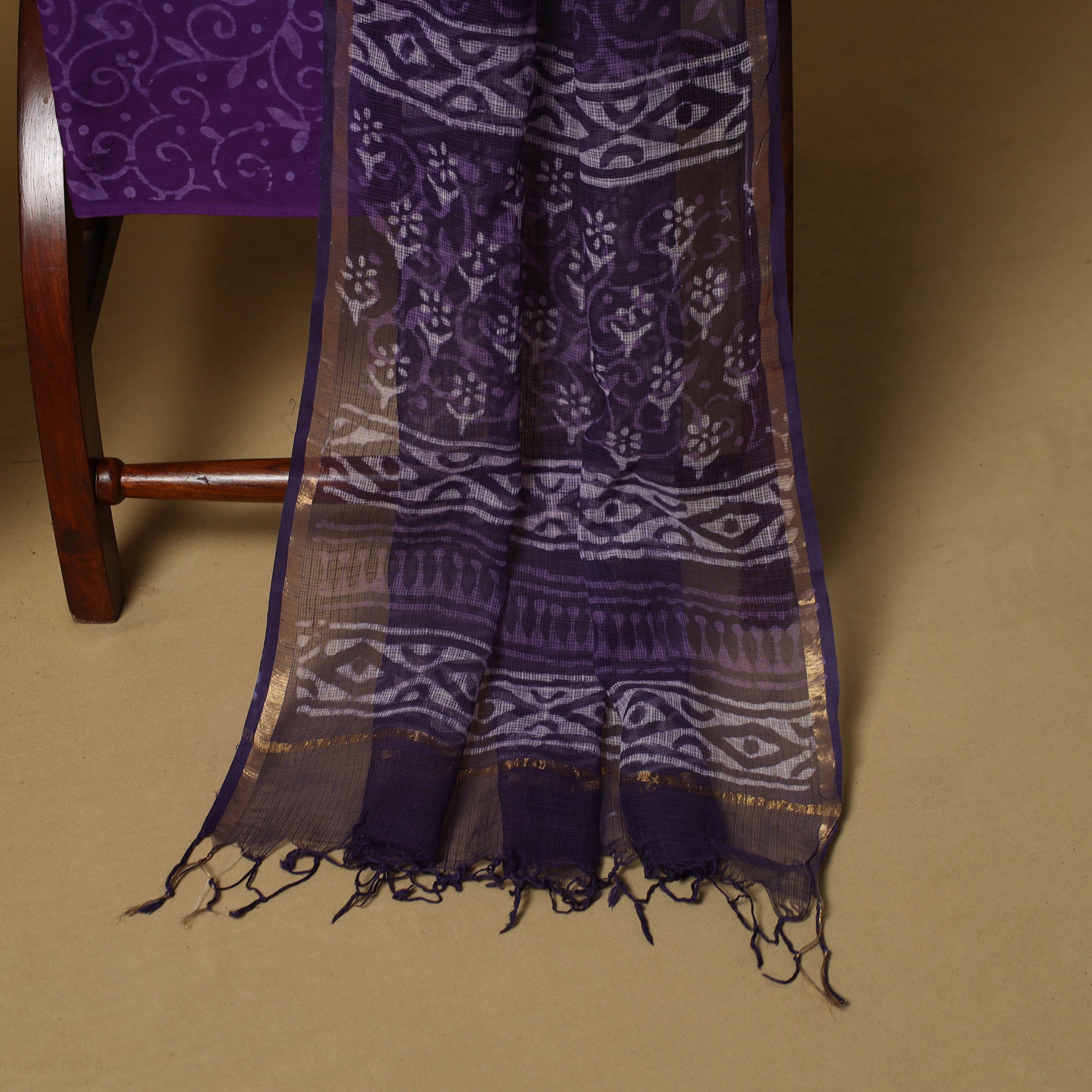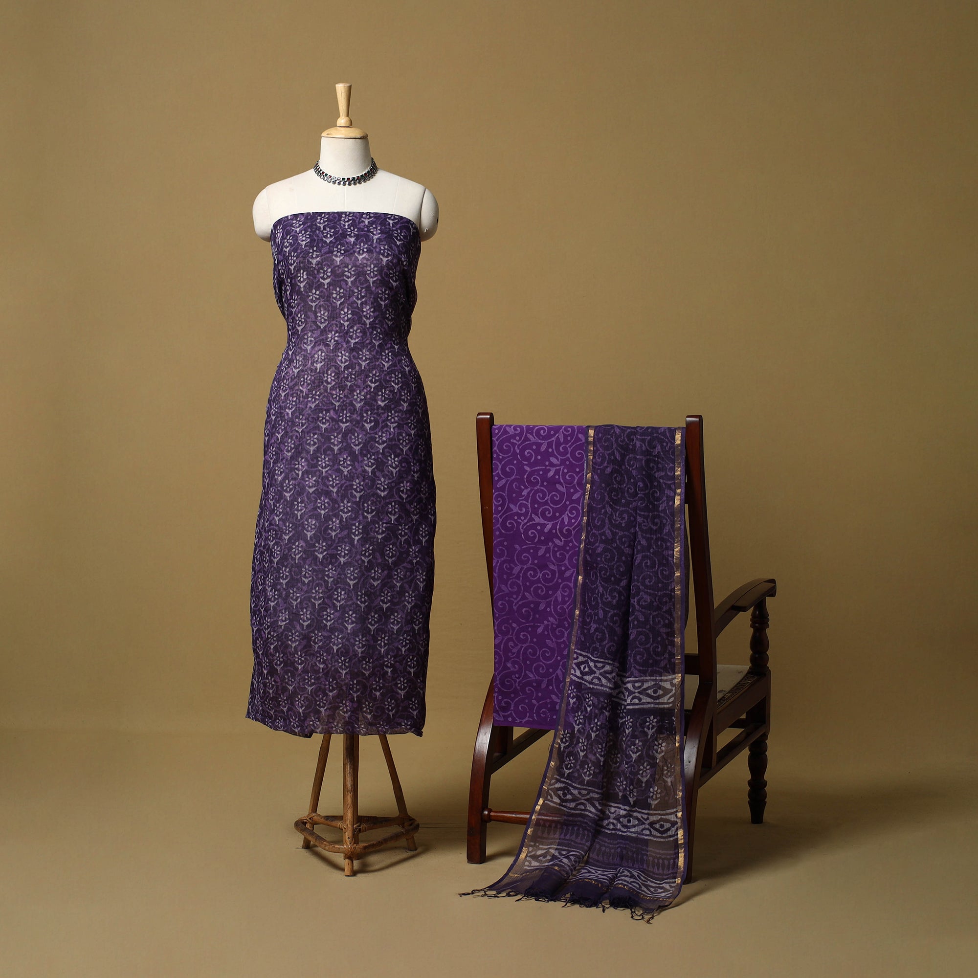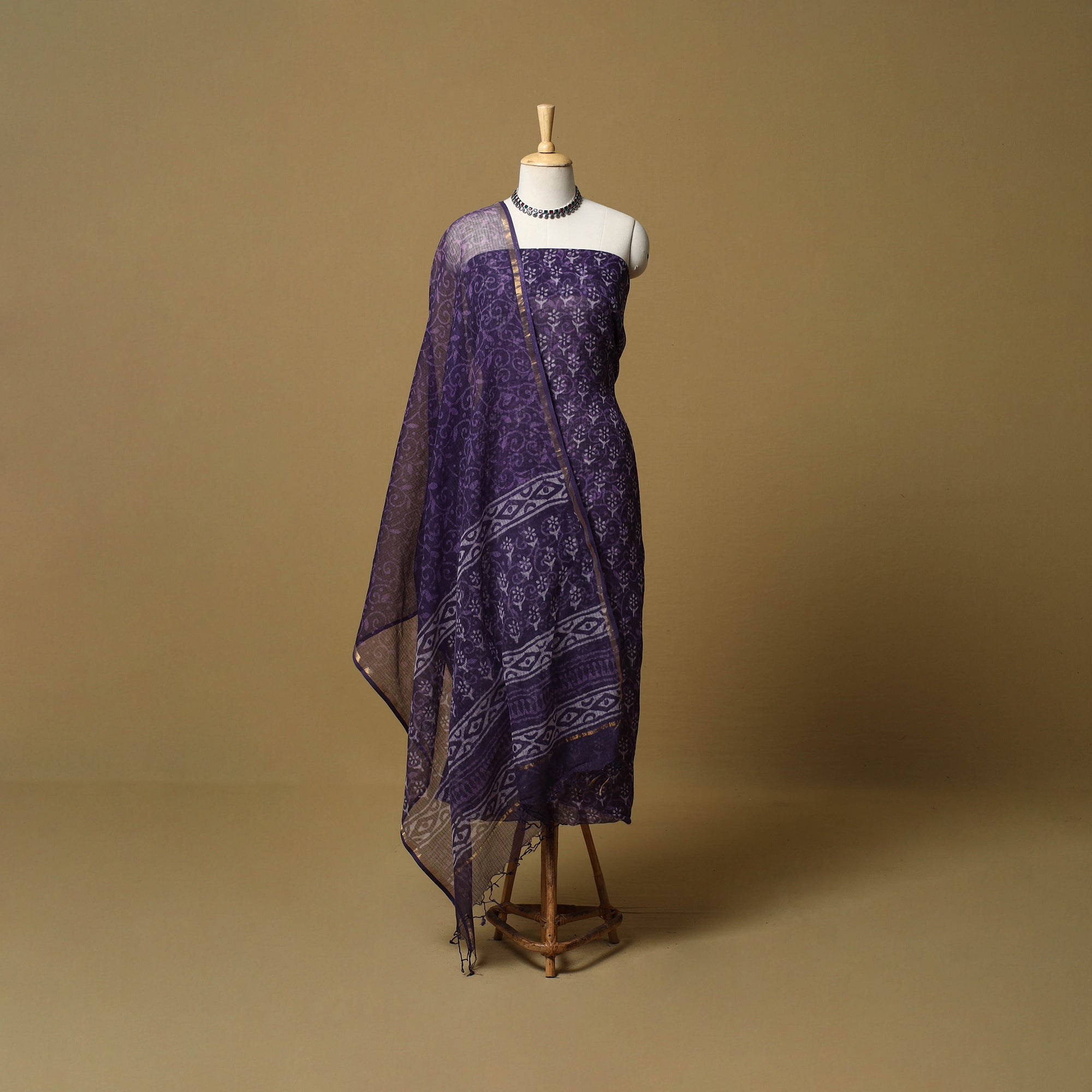 3pc bagru dress material set blends comfort with traditional Rajasthani artistry. The kurta fabric and dupatta are made from airy Kota Doria, while the bottom is cotton for easy wear. Featuring classic bagru block prints, the fabric is printed by skilled artisans from Rajasthan using hand-carved wooden blocks, creating a graceful look suitable for everyday wear and light festive occasions.