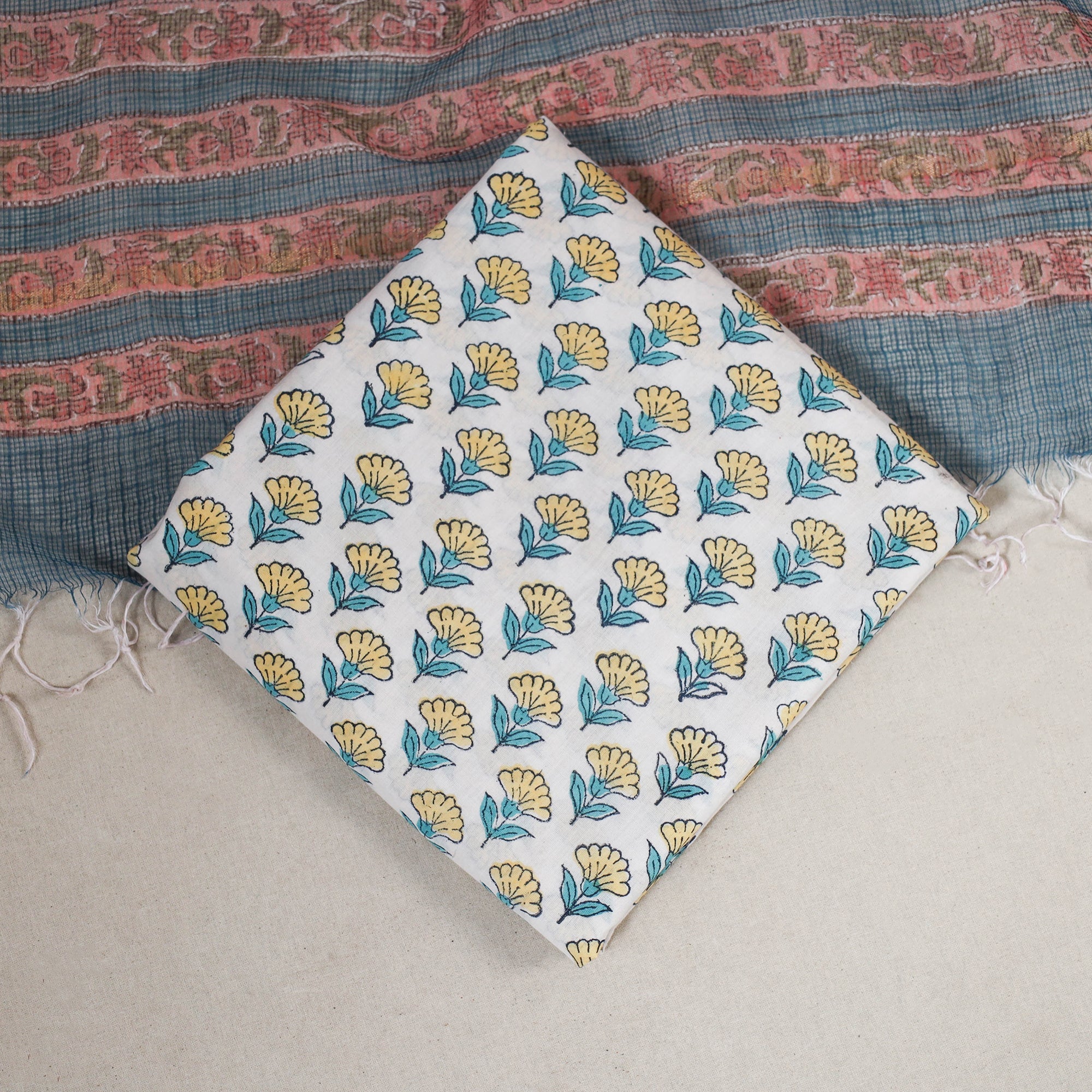 This blue 3pc sanganeri kota doria cotton dress material is crafted using traditional hand block printing from Sanganer, a town in the southern part of Jaipur, Rajasthan. The set includes a kurta, zari-bordered dupatta, and a cotton bottom fabric, perfect for custom tailoring. The soft cotton base and intricate floral motifs make it ideal for everyday comfort as well as festive styling.Blue