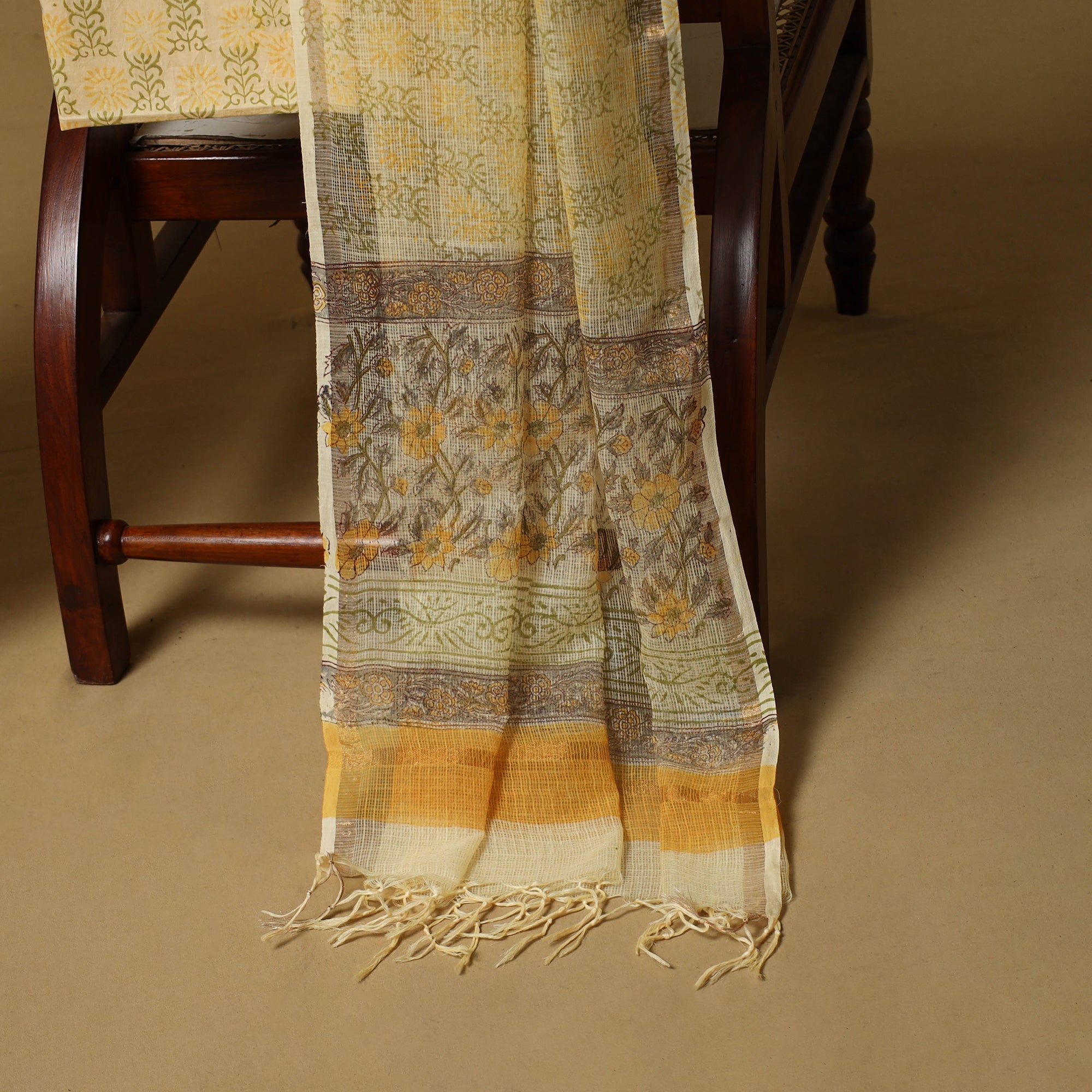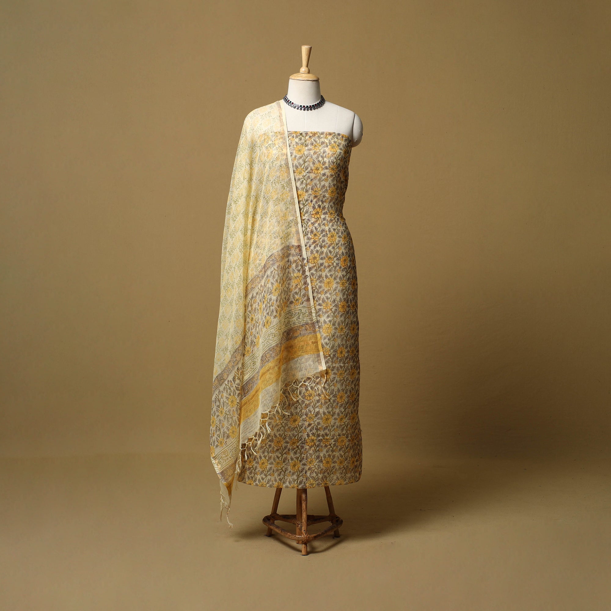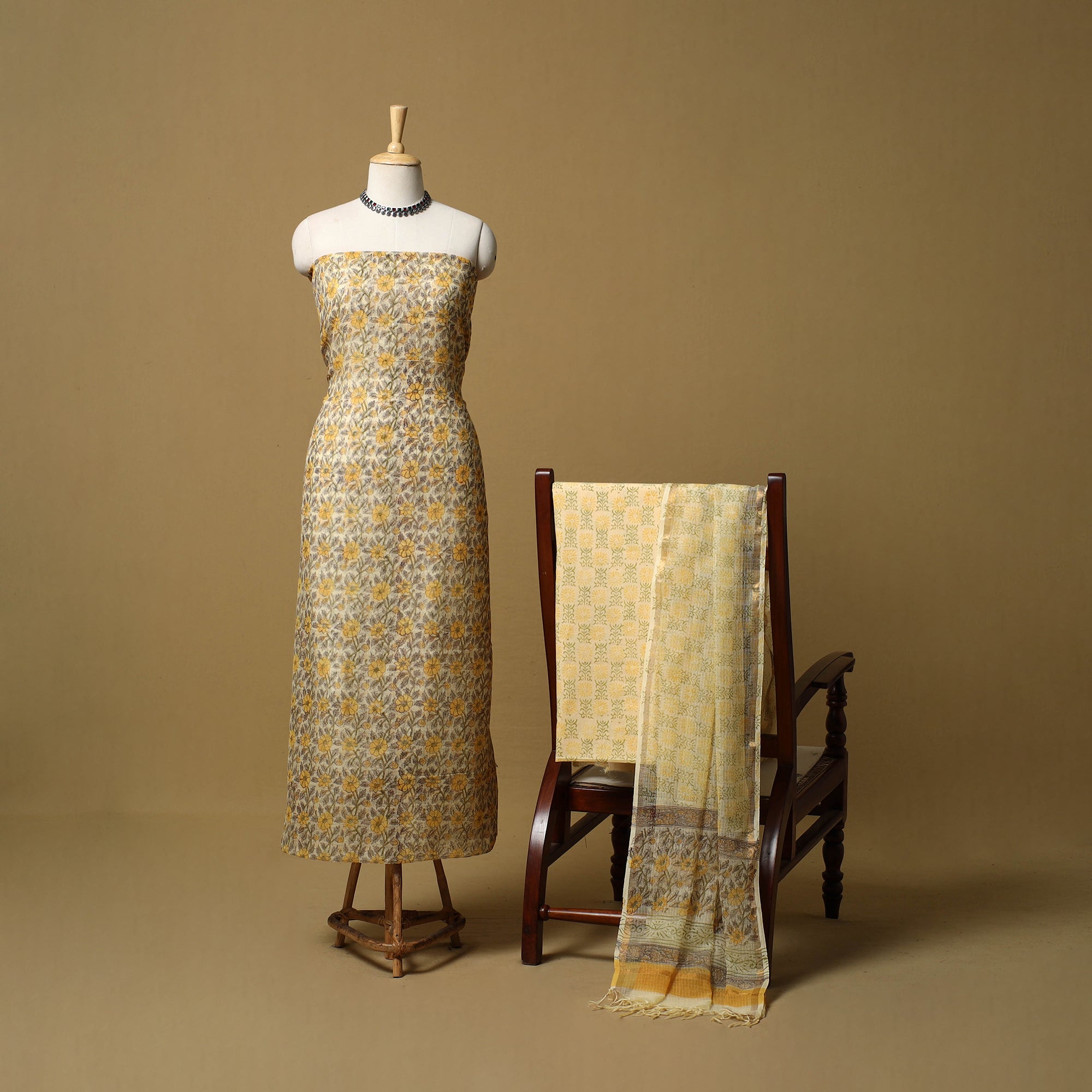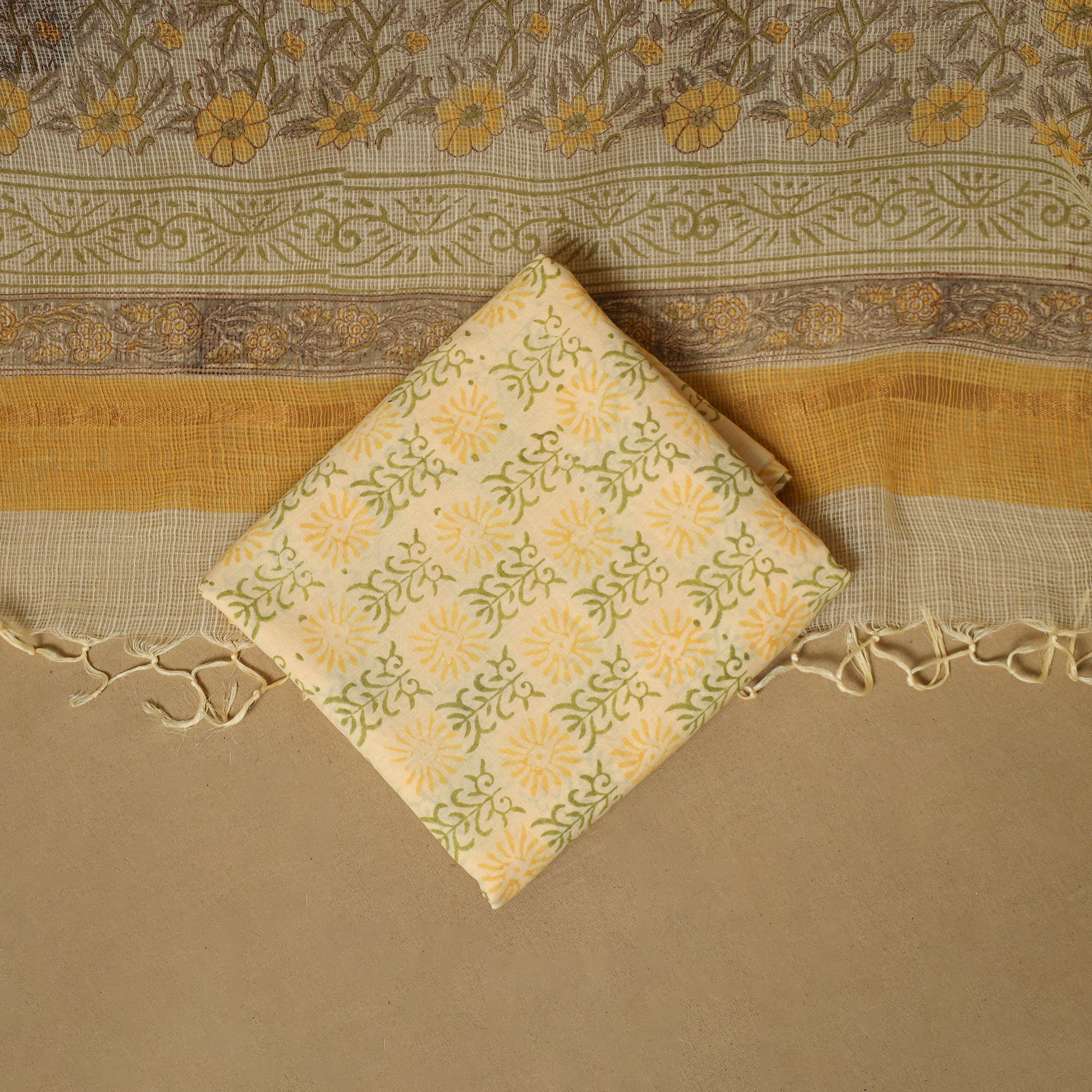 Yellow 3pc sanganeri dress material set blends comfort with traditional Rajasthani artistry. The kurta fabric and dupatta are made from airy Kota Doria, while the bottom is cotton for easy wear. Featuring classic sanganeri block prints, the fabric is printed by skilled artisans from Rajasthan using hand-carved wooden blocks, creating a graceful look suitable for everyday wear and light festive occasions.