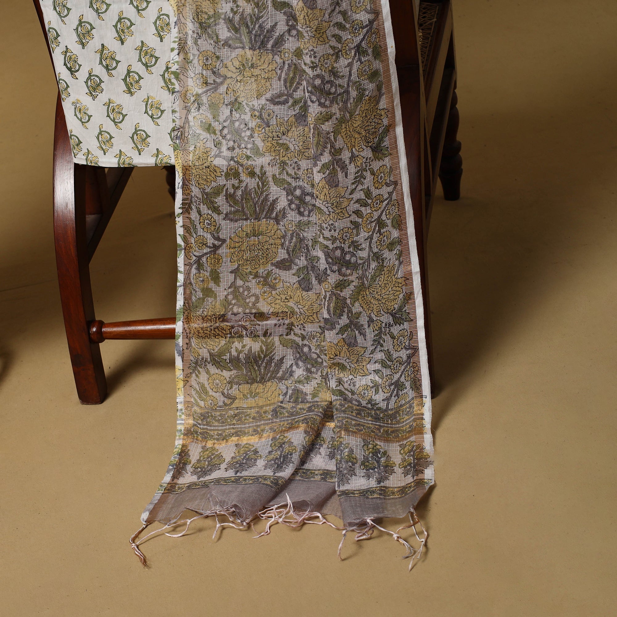 3pc sanganeri dress material set blends comfort with traditional Rajasthani artistry. The kurta fabric and dupatta are made from airy Kota Doria, while the bottom is cotton for easy wear. Featuring classic sanganeri block prints, the fabric is printed by skilled artisans from Rajasthan using hand-carved wooden blocks, creating a graceful look suitable for everyday wear and light festive occasions.
