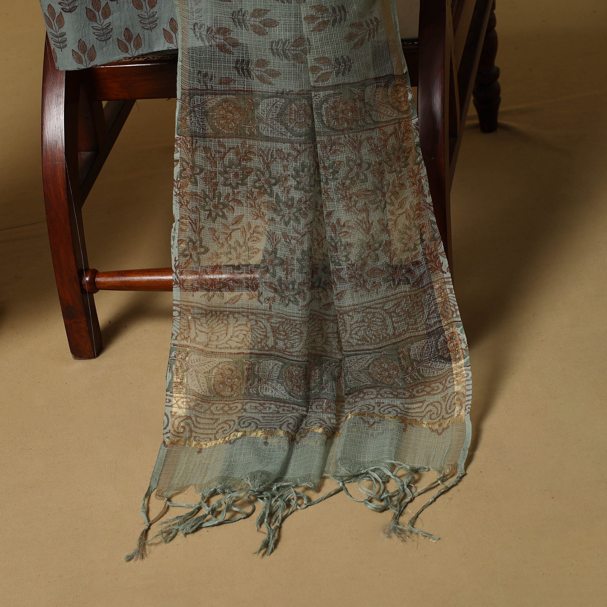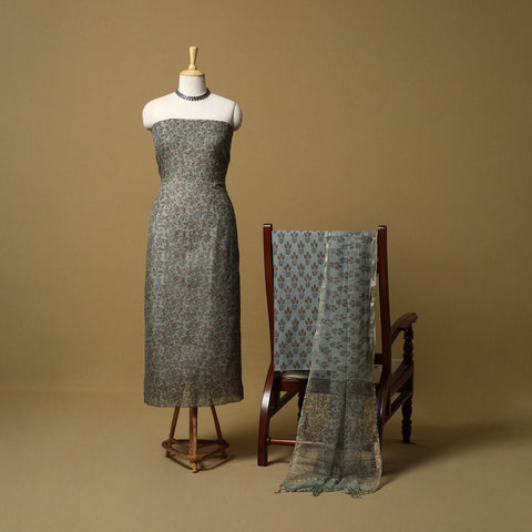 Green 3pc sanganeri dress material set blends comfort with traditional Rajasthani artistry. The kurta fabric and dupatta are made from airy Kota Doria, while the bottom is cotton for easy wear. Featuring classic sanganeri block prints, the fabric is printed by skilled artisans from Rajasthan using hand-carved wooden blocks, creating a graceful look suitable for everyday wear and light festive occasions.