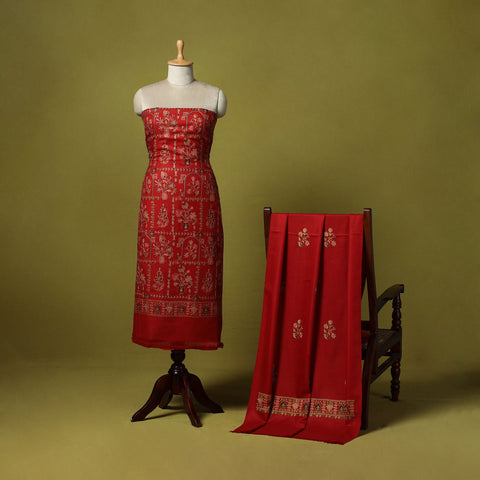 Red 3pc chain stitch aari embroidered merino wool unstitched dress material is perfect for elegant winter wear. Made from fine merino wool, it offers warmth, comfort and a rich texture. The set includes fabric for the top, bottom and dupatta is beautifully detailed with intricate aari embroidery. Ideal for stitching into stylish suits for casual or festive occasions, it’s a graceful and cozy choice for the winter season.