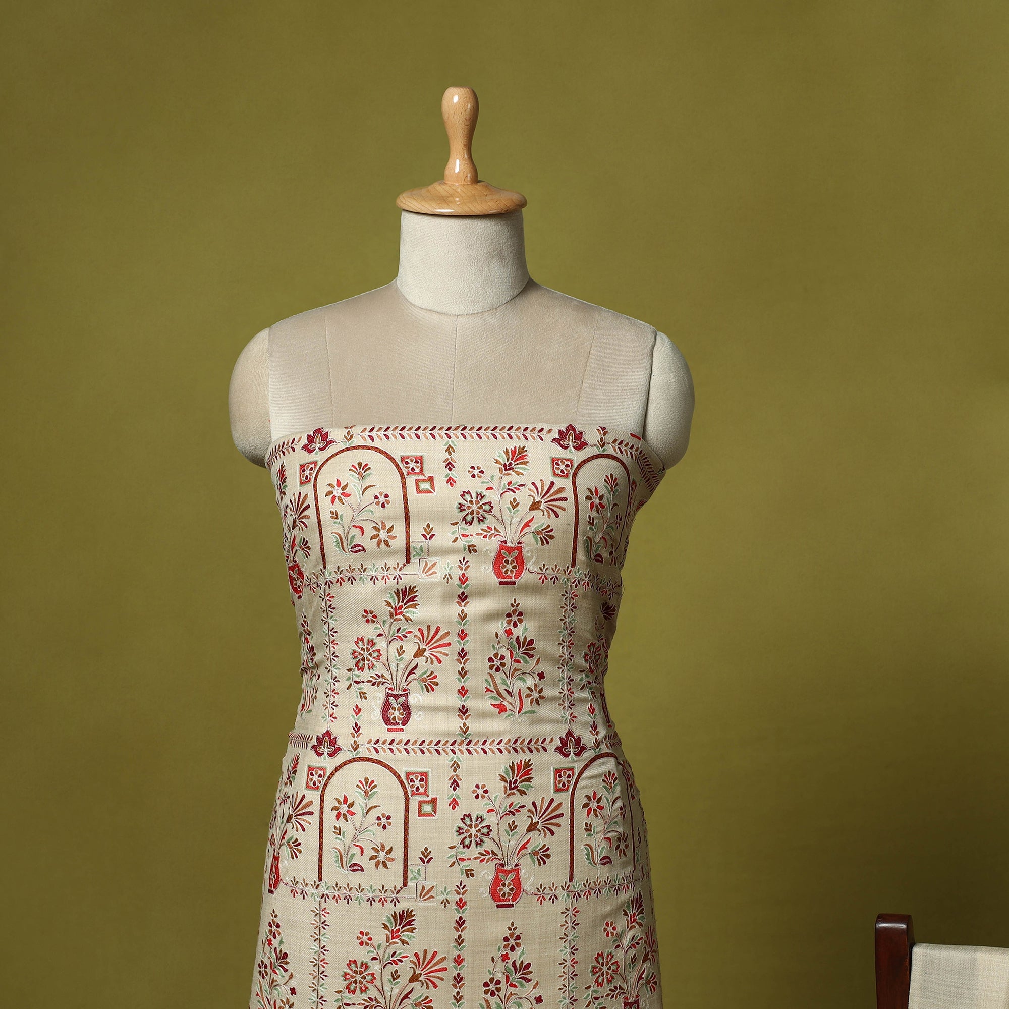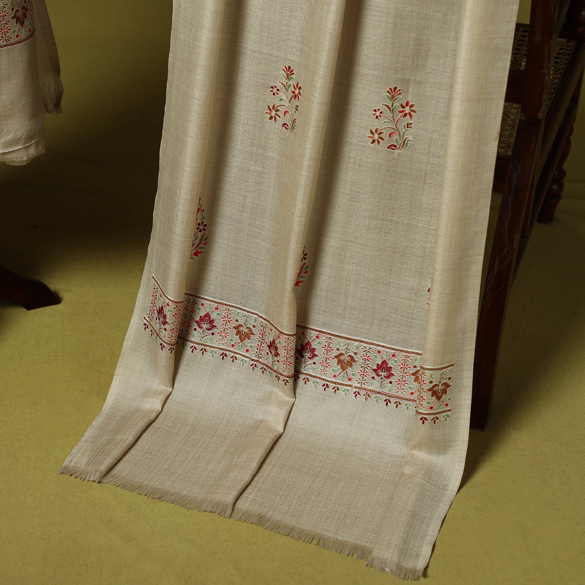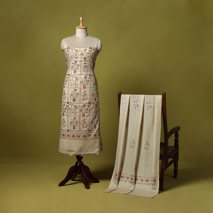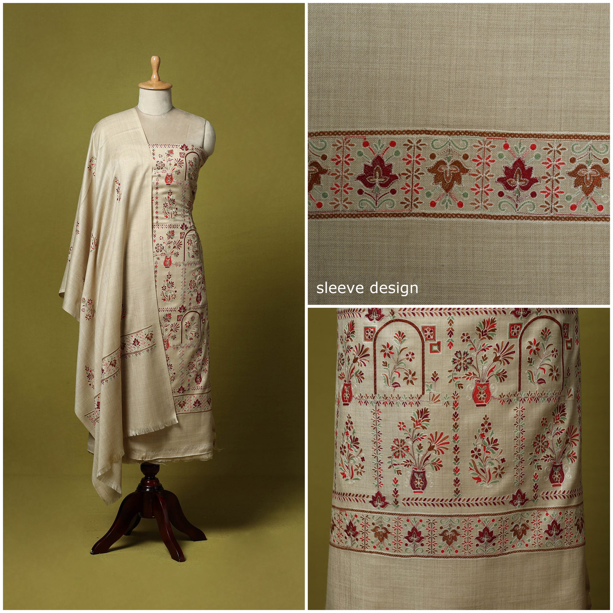 Beige 3pc chain stitch aari embroidered merino wool unstitched dress material is perfect for elegant winter wear. Made from fine merino wool, it offers warmth, comfort and a rich texture. The set includes fabric for the top, bottom and dupatta is beautifully detailed with intricate aari embroidery. Ideal for stitching into stylish suits for casual or festive occasions, it’s a graceful and cozy choice for the winter season.