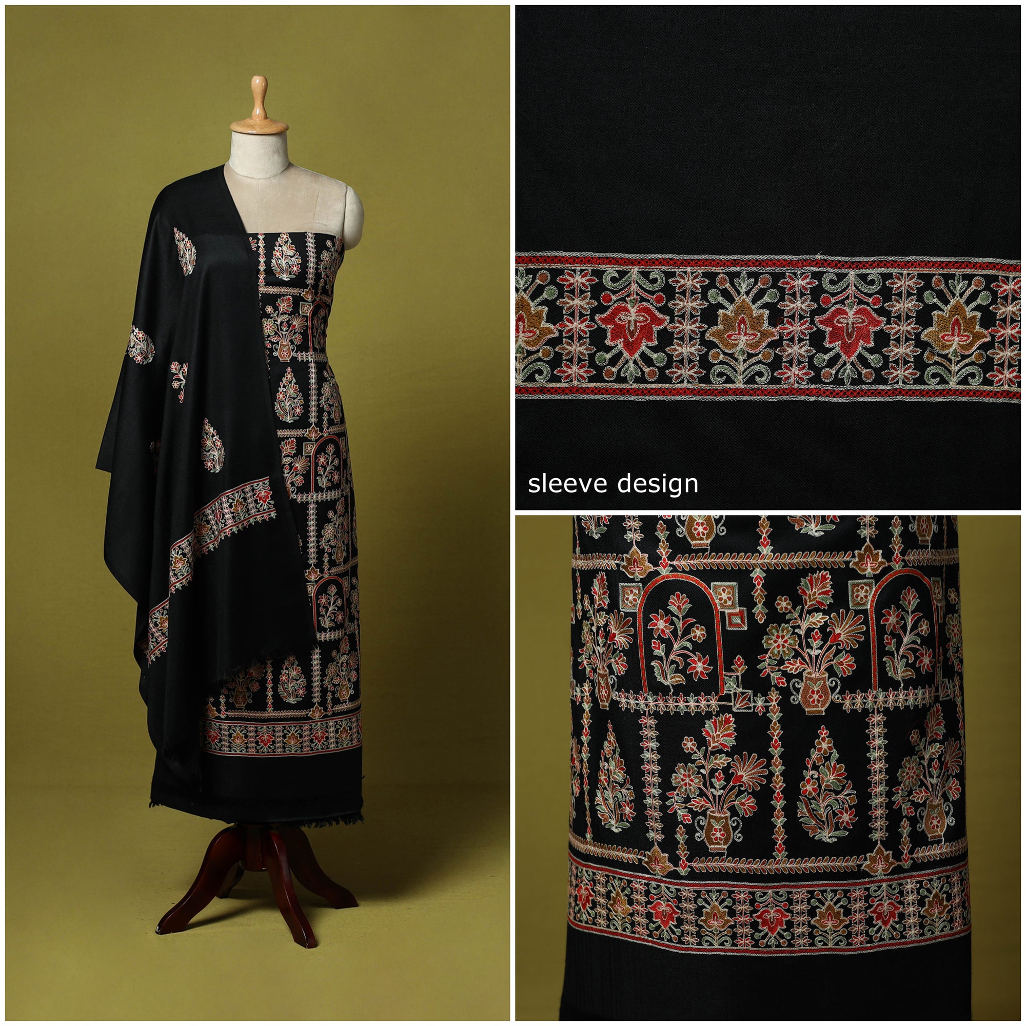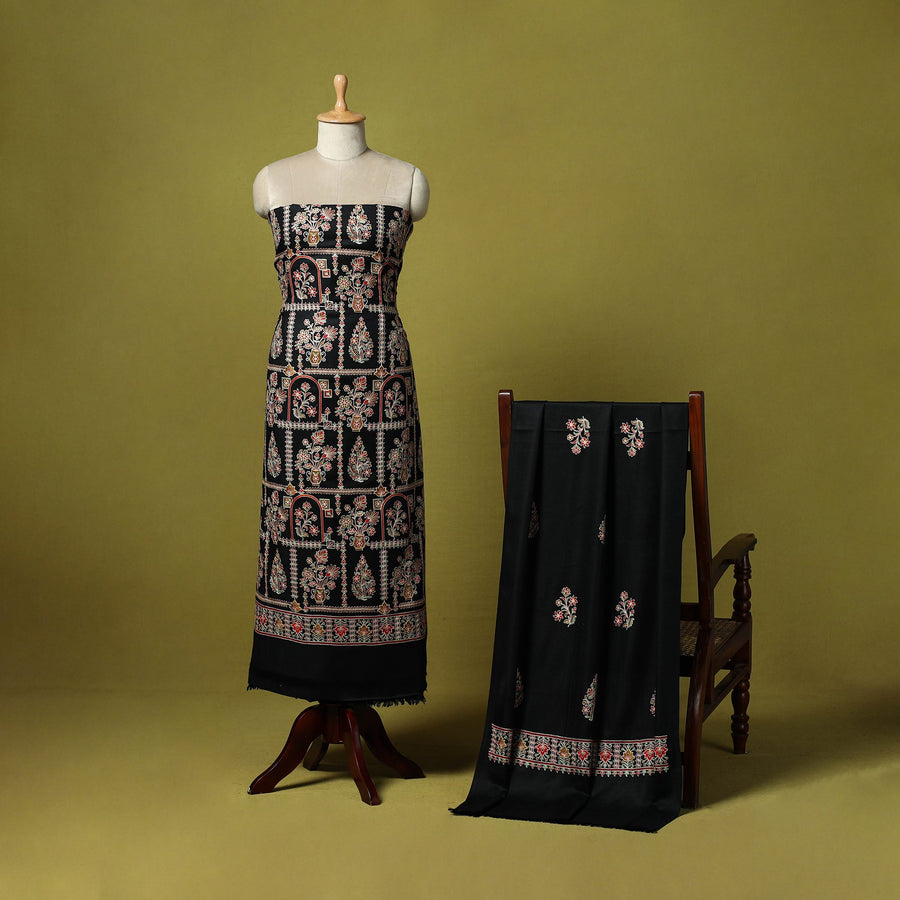 Black 3pc chain stitch aari embroidered merino wool unstitched dress material is perfect for elegant winter wear. Made from fine merino wool, it offers warmth, comfort and a rich texture. The set includes fabric for the top, bottom and dupatta is beautifully detailed with intricate aari embroidery. Ideal for stitching into stylish suits for casual or festive occasions, it’s a graceful and cozy choice for the winter season.