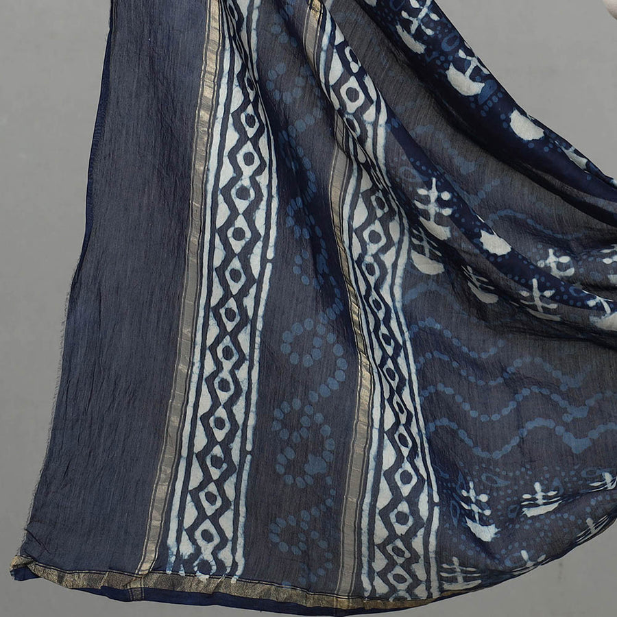 Blue 3pc chanderi silk indigo bagru print dress material with zari border. Featuring intricate hand-block prints made using natural dyes, this set reflects the traditional mud-resist techniques of Rajasthan. it comes with a cotton bottom, making it perfect for any occasion.
