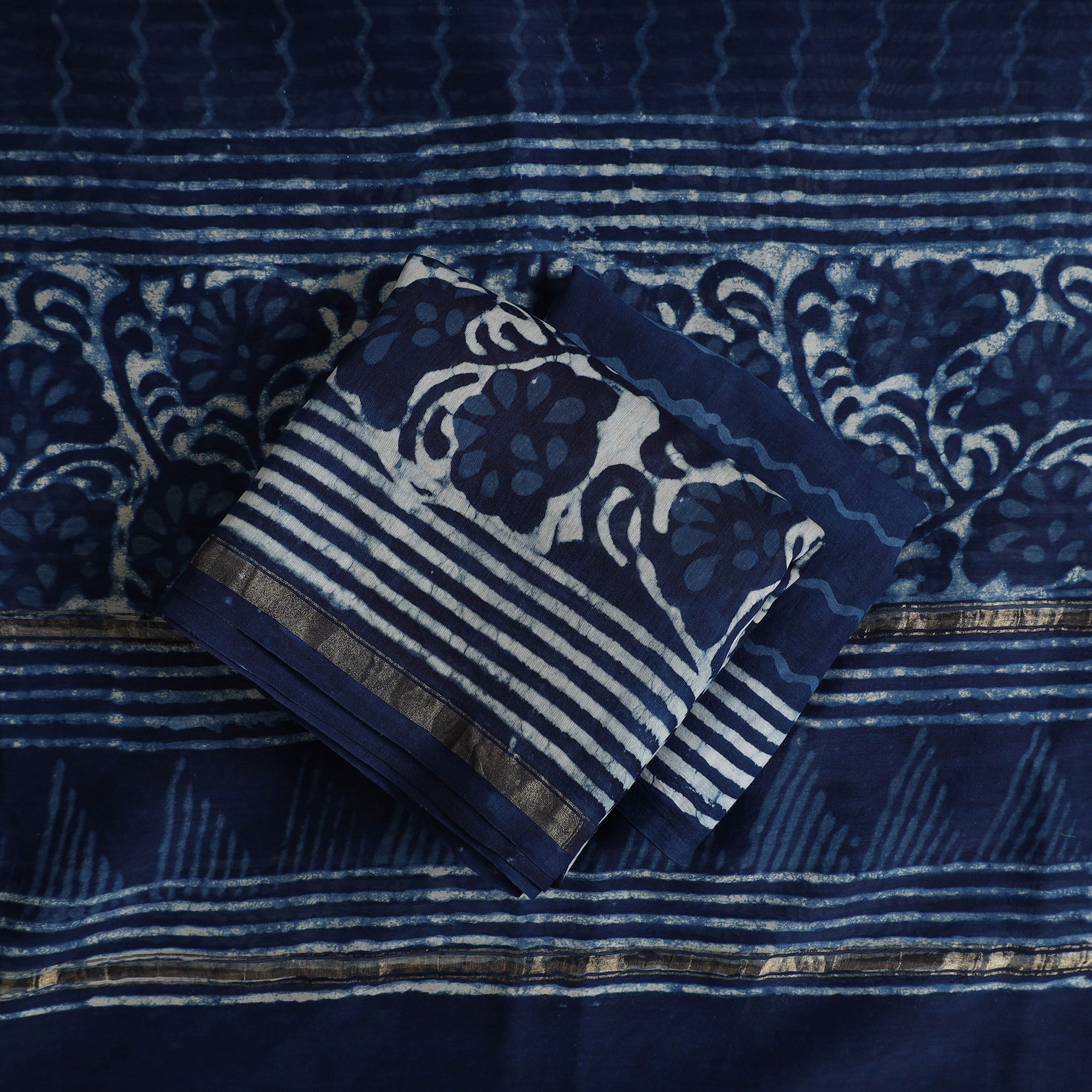 Blue 3pc chanderi silk indigo bagru print dress material with zari border. Featuring intricate hand-block prints made using natural dyes, this set reflects the traditional mud-resist techniques of Rajasthan. it comes with a cotton bottom, making it perfect for any occasion.