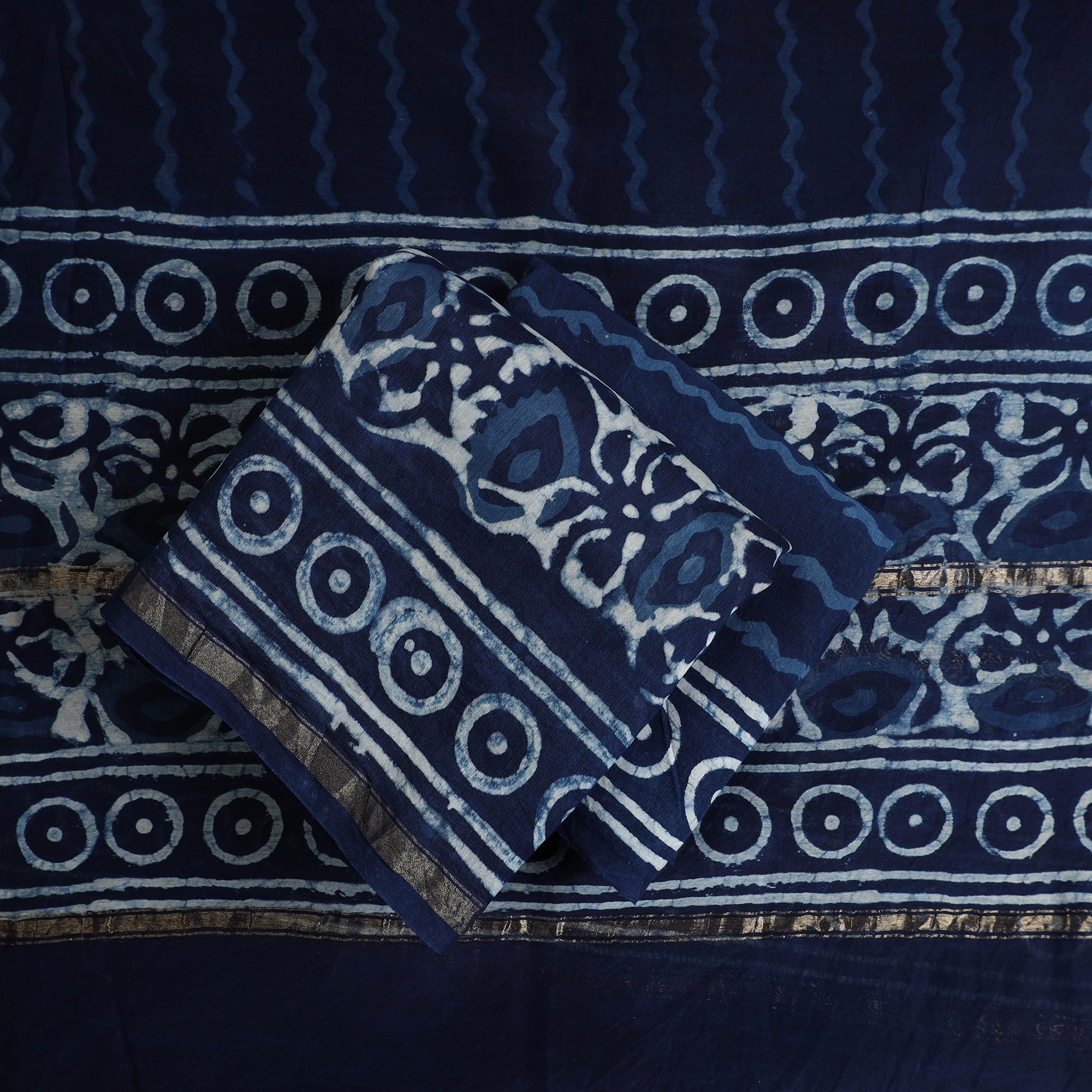 Material Blue 3pc chanderi silk indigo bagru print dress material with zari border. Featuring intricate hand-block prints made using natural dyes, this set reflects the traditional mud-resist techniques of Rajasthan. it comes with a cotton bottom, making it perfect for any occasion.