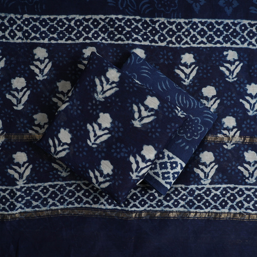 Blue 3pc chanderi silk indigo bagru print dress material with zari border. Featuring intricate hand-block prints made using natural dyes, this set reflects the traditional mud-resist techniques of Rajasthan. it comes with a cotton bottom, making it perfect for any occasion.