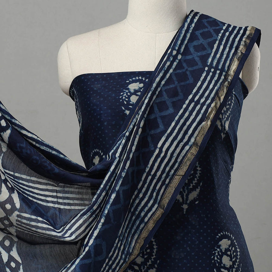 Blue 3pc chanderi silk indigo bagru print dress material with zari border. Featuring intricate hand-block prints made using natural dyes, this set reflects the traditional mud-resist techniques of Rajasthan. it comes with a cotton bottom, making it perfect for any occasion.