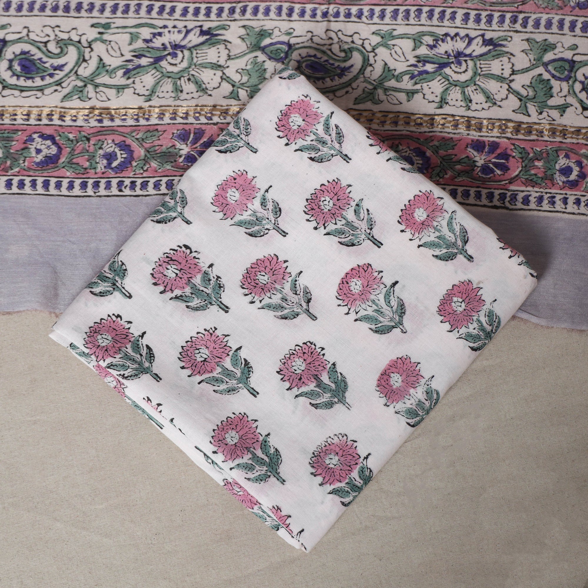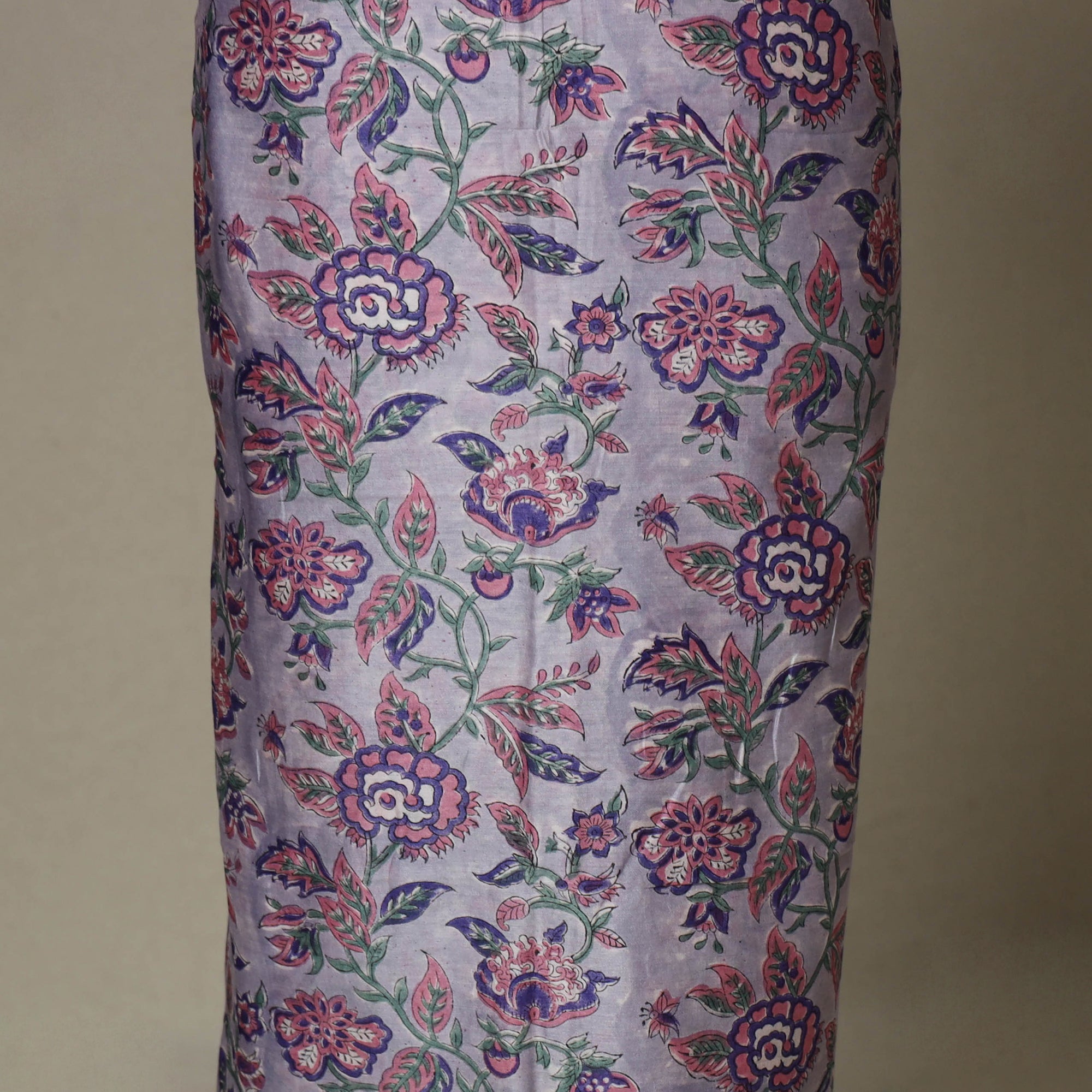 Infuse your wardrobe with timeless elegance through this purple 3pc sanganeri block print dress material set in chanderi silk-cotton. Known for its intricate hand block motifs made using VAT dyes, this set captures the soul of Rajasthani artistry. The sheer Chanderi fabric, woven in Madhya Pradesh, lends a graceful drape. Highlighted with a refined zari border, the kurta and dupatta pair beautifully with a breathable cotton bottom for day-long ease.
