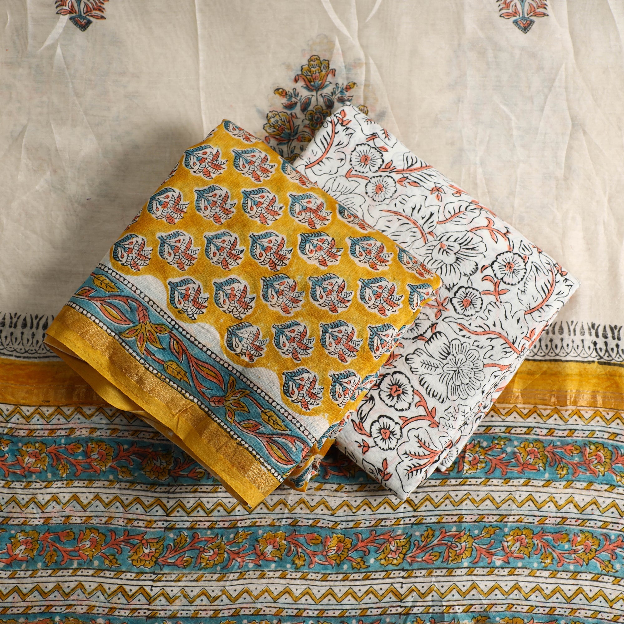 Hand-stamped block prints crafted by artisans using age-old techniques.
