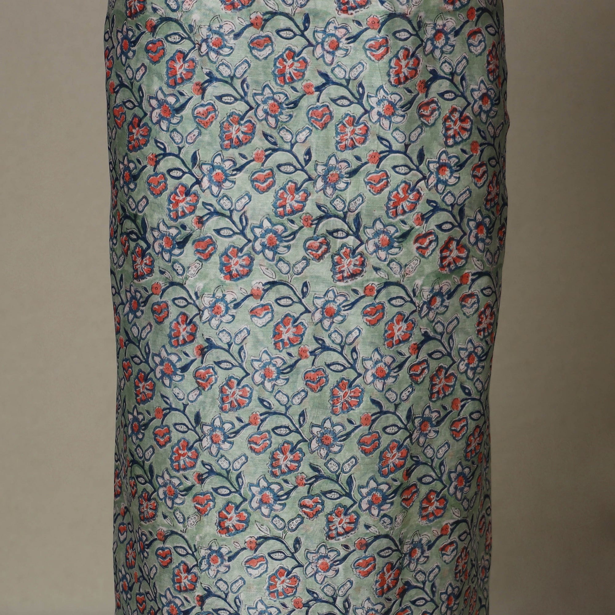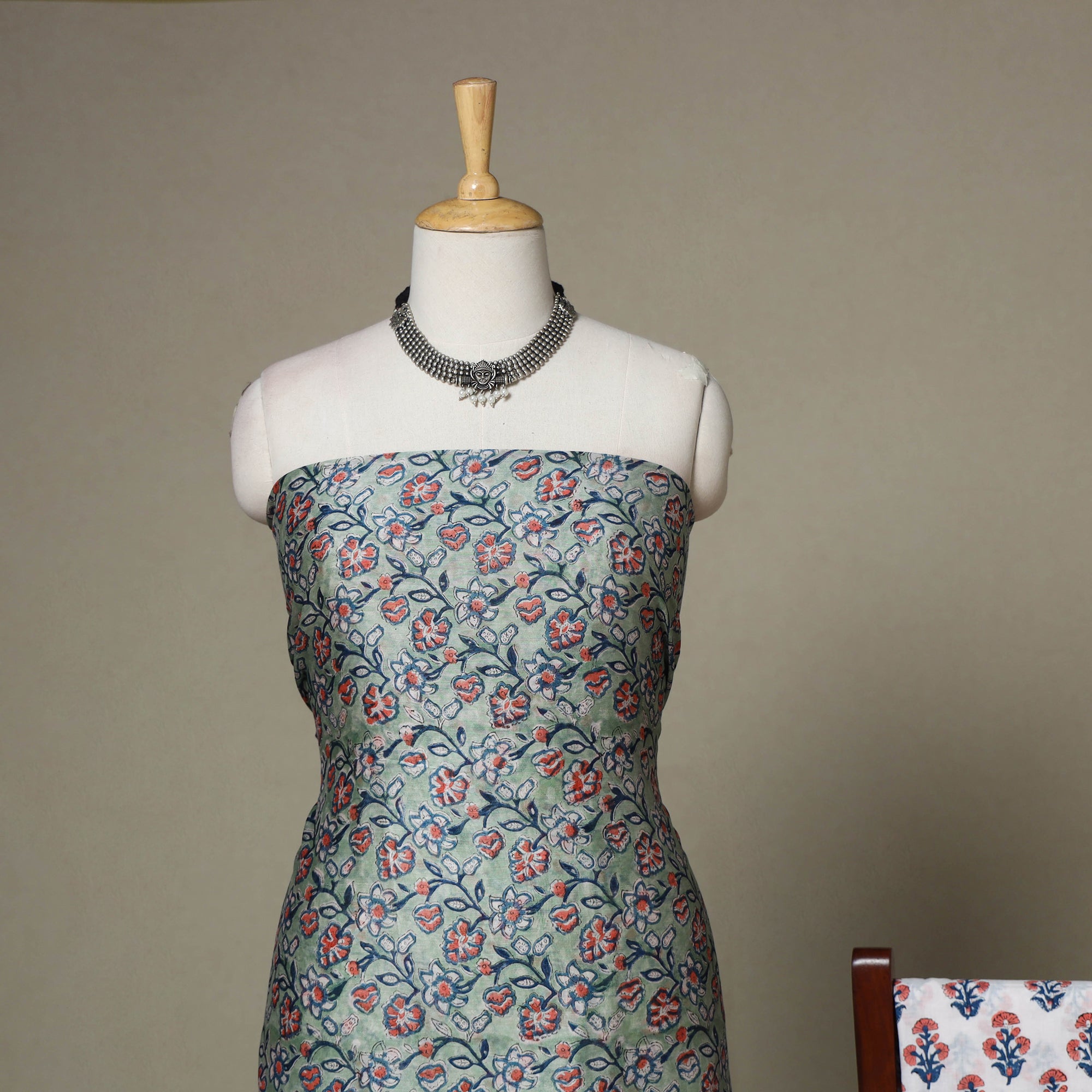 Infuse your wardrobe with timeless elegance through this green 3pc sanganeri block print dress material set in chanderi silk-cotton. Known for its intricate hand block motifs made using VAT dyes, this set captures the soul of Rajasthani artistry. The sheer Chanderi fabric, woven in Madhya Pradesh, lends a graceful drape. Highlighted with a refined zari border, the kurta and dupatta pair beautifully with a breathable cotton bottom for day-long ease.