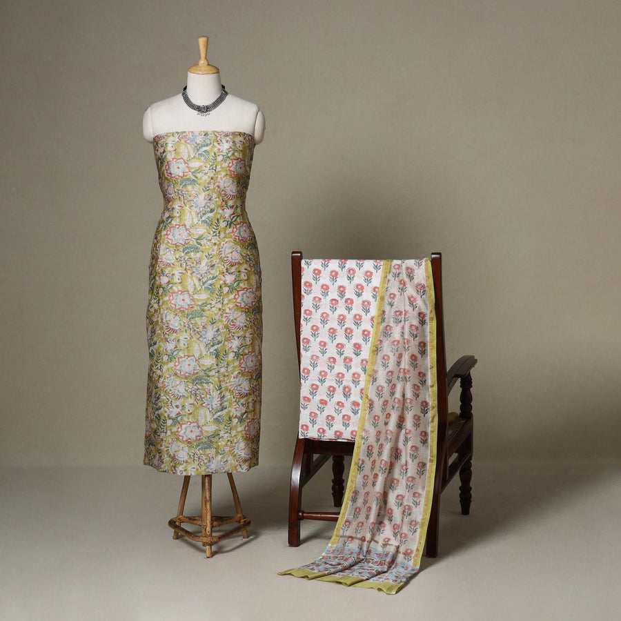Infuse your wardrobe with timeless elegance through this green 3pc sanganeri block print dress material set in chanderi silk-cotton. Known for its intricate hand block motifs made using VAT dyes, this set captures the soul of Rajasthani artistry. The sheer Chanderi fabric, woven in Madhya Pradesh, lends a graceful drape. Highlighted with a refined zari border, the kurta and dupatta pair beautifully with a breathable cotton bottom for day-long ease.