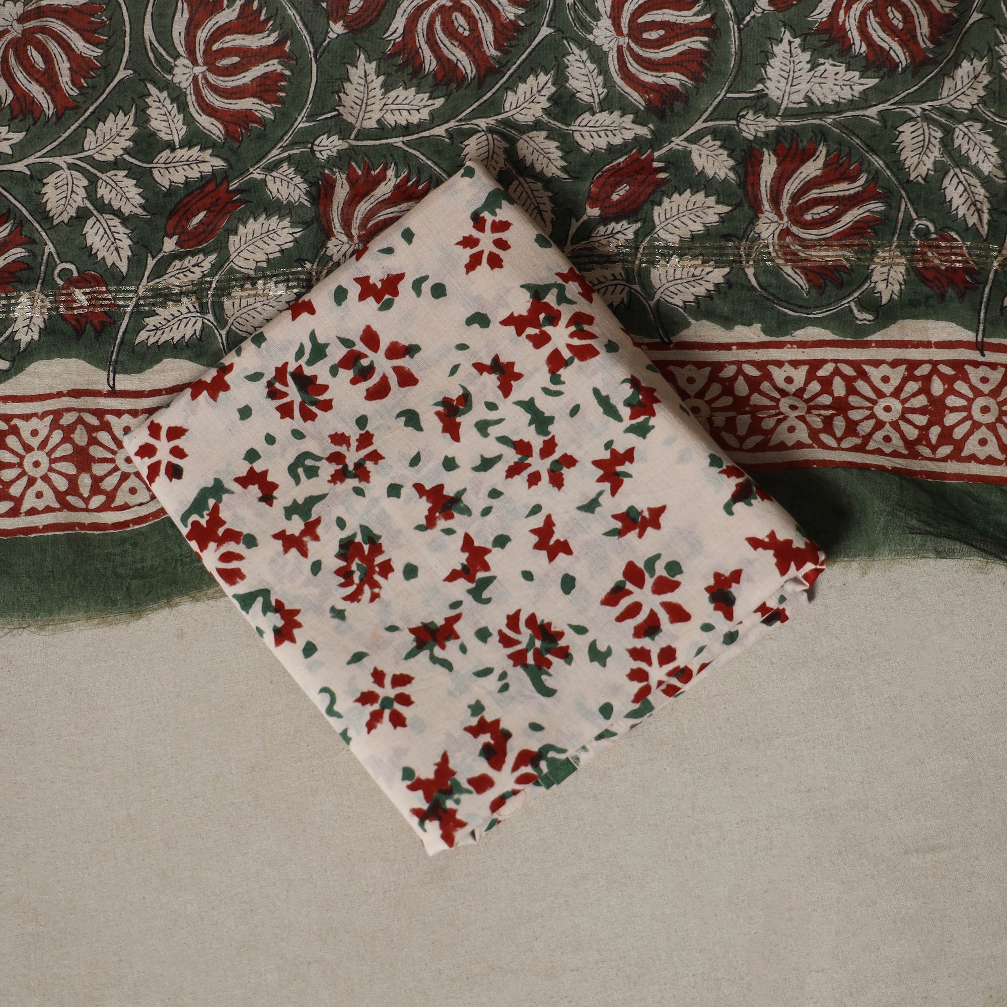 Infuse your wardrobe with timeless elegance through this green 3pc sanganeri block print dress material set in chanderi silk-cotton. Known for its intricate hand block motifs made using VAT dyes, this set captures the soul of Rajasthani artistry. The sheer Chanderi fabric, woven in Madhya Pradesh, lends a graceful drape. Highlighted with a refined zari border, the kurta and dupatta pair beautifully with a breathable cotton bottom for day-long ease.