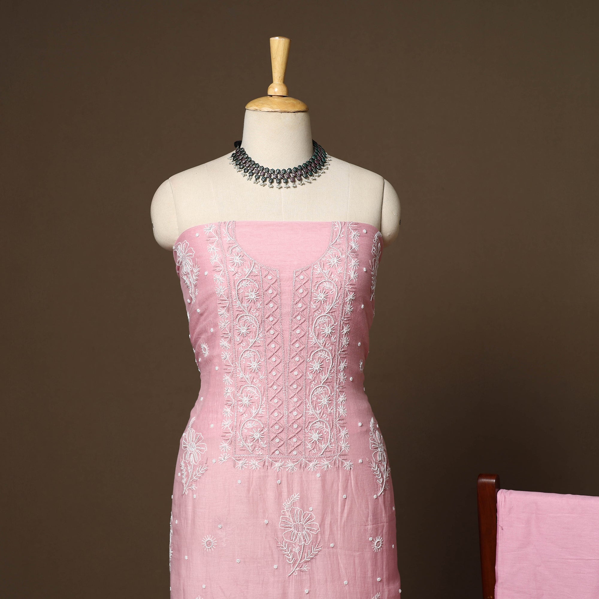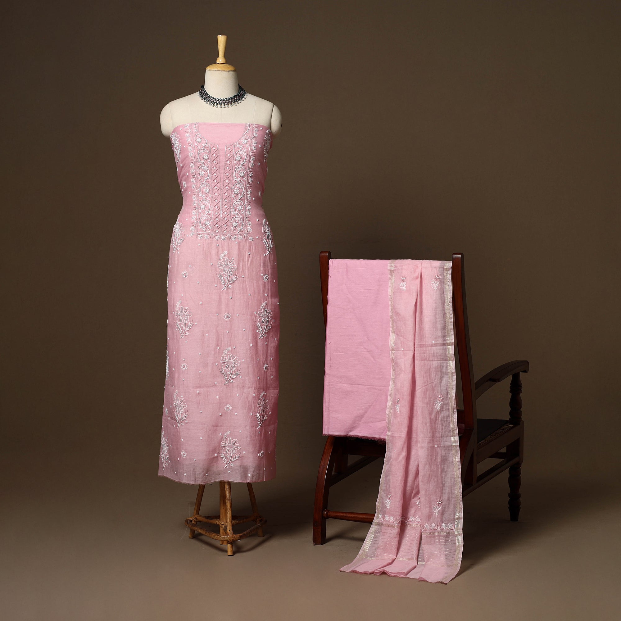 Intricately and artfully crafted, this pink heavy chikankari handloom chanderi silk cotton unstitched 3pc dress material celebrates the heritage handwork of Lucknow, Uttar Pradesh. Known for its delicate thread motifs and subtle elegance, Chikankari features meticulously hand-embroidered designs made with soft pastel threads that form graceful floral and paisley patterns. Traditional stitches such as bakhiya, murri, pechni and hool enhance its artistry. The beads, sequins and cutdana detailing add a refined touch, making it perfect for weddings, festive celebrations, cultural gatherings, and elegant evening occasions. The set includes fabric for kurta, plain bottom and dupatta.