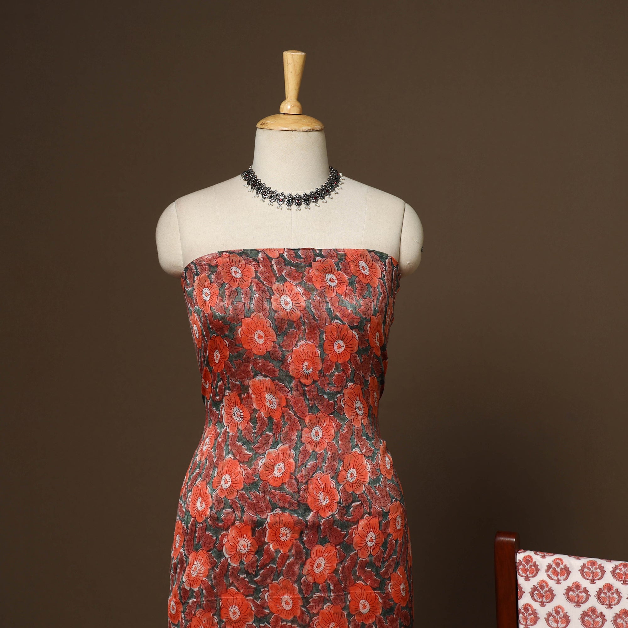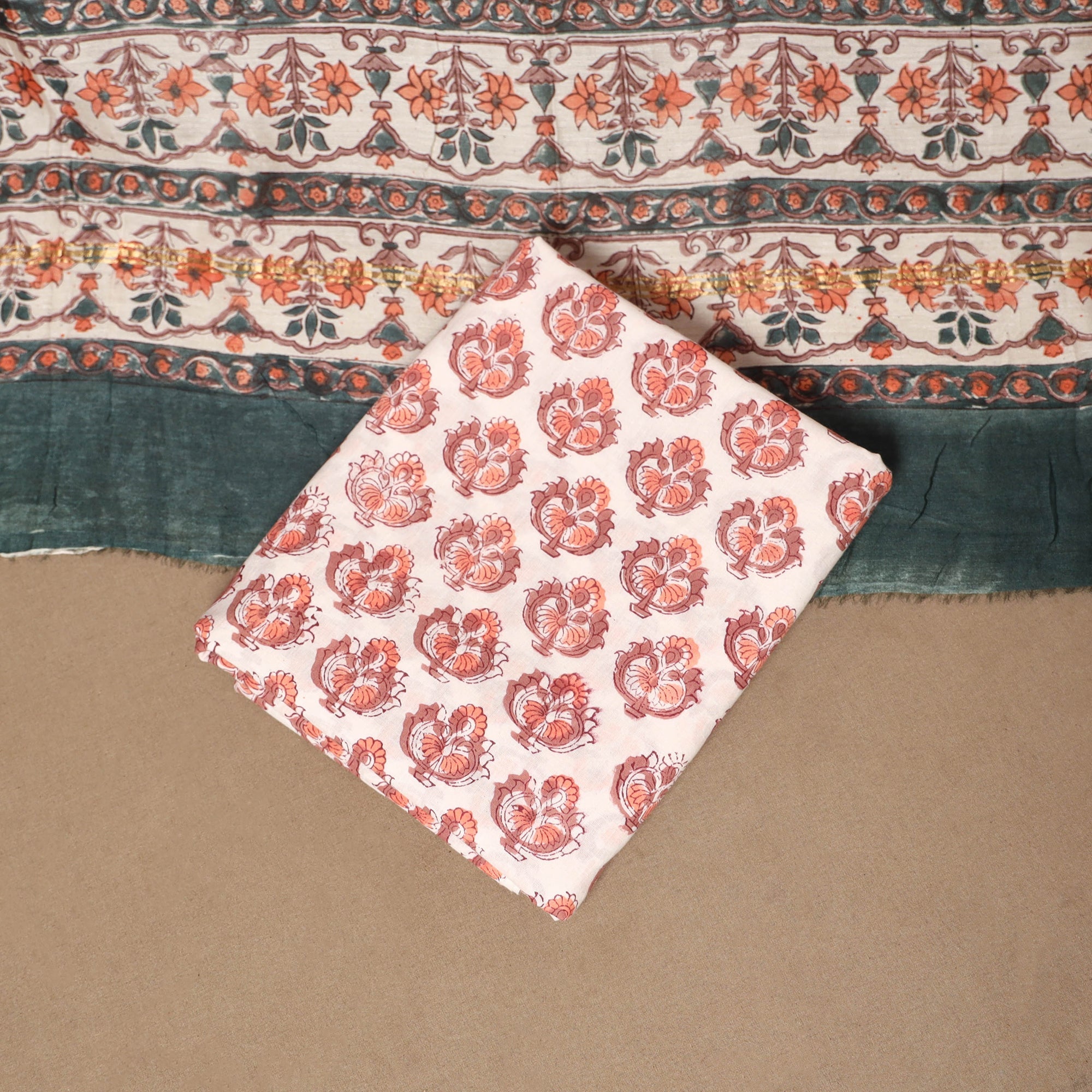 Orange 3pc sanganeri hand block print dress material is crafted from chanderi silk-cotton fabric and includes a kurta, a matching dupatta and a cotton bottom. Adorned with fine floral motifs from Rajasthan, each piece is made using the traditional hand block printing technique, where artisans use hand-carved wooden blocks dipped in VAT dyes to imprint intricate designs perfect for festive and everyday elegance.