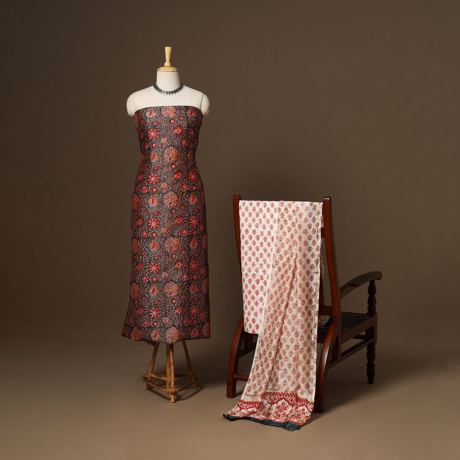 Green 3pc sanganeri hand block print dress material is crafted from chanderi silk-cotton fabric and includes a kurta, a matching dupatta and a cotton bottom. Adorned with fine floral motifs from Rajasthan, each piece is made using the traditional hand block printing technique, where artisans use hand-carved wooden blocks dipped in VAT dyes to imprint intricate designs perfect for festive and everyday elegance.