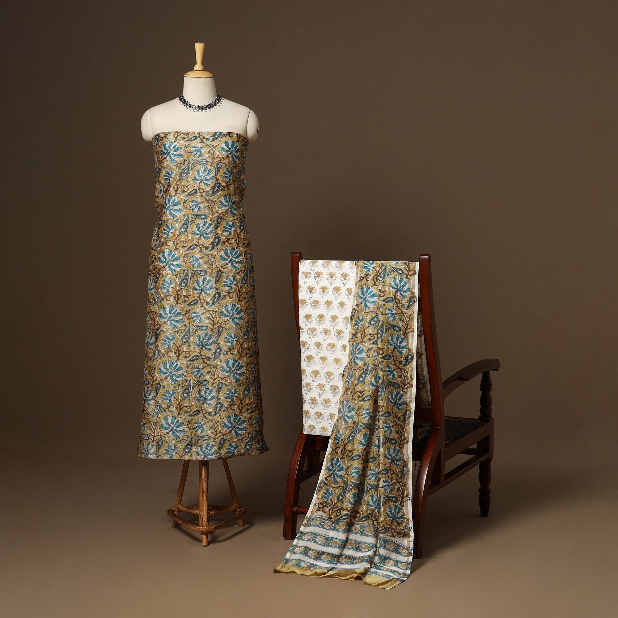Yellow 3pc sanganeri hand block print dress material is crafted from chanderi silk-cotton fabric and includes a kurta, a matching dupatta and a cotton bottom. Adorned with fine floral motifs from Rajasthan, each piece is made using the traditional hand block printing technique, where artisans use hand-carved wooden blocks dipped in VAT dyes to imprint intricate designs perfect for festive and everyday elegance.