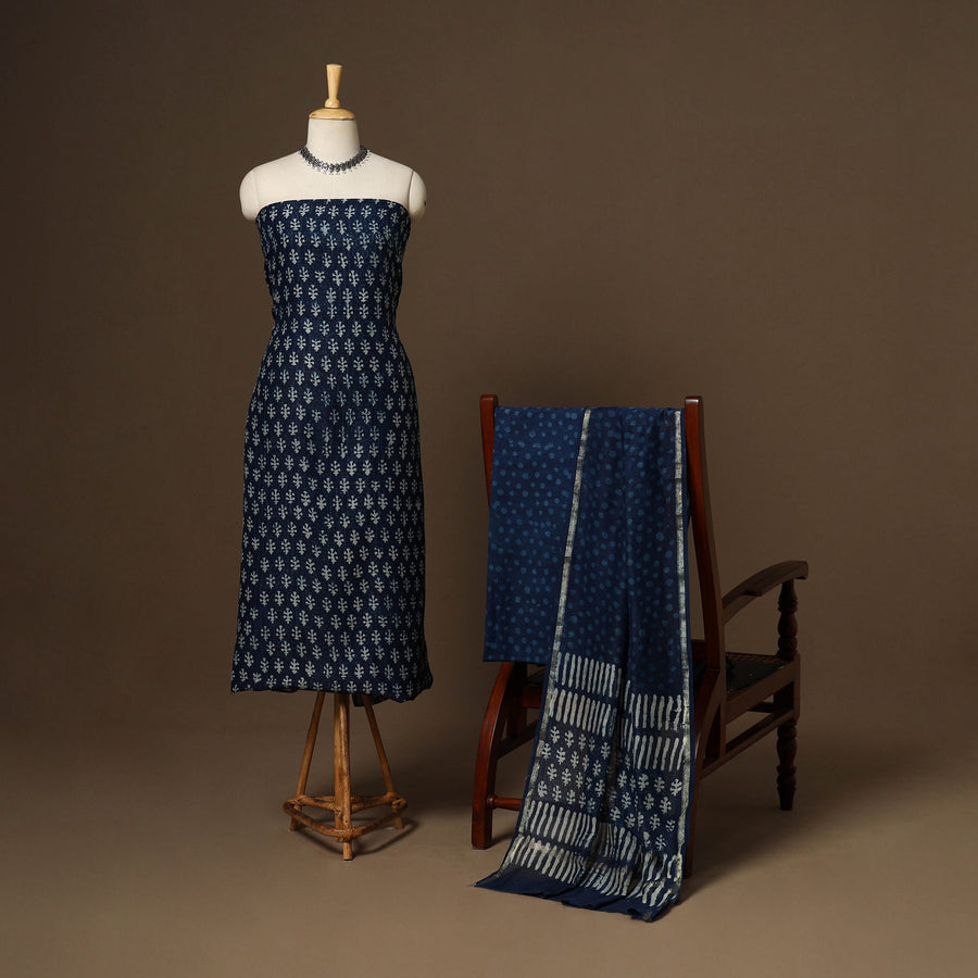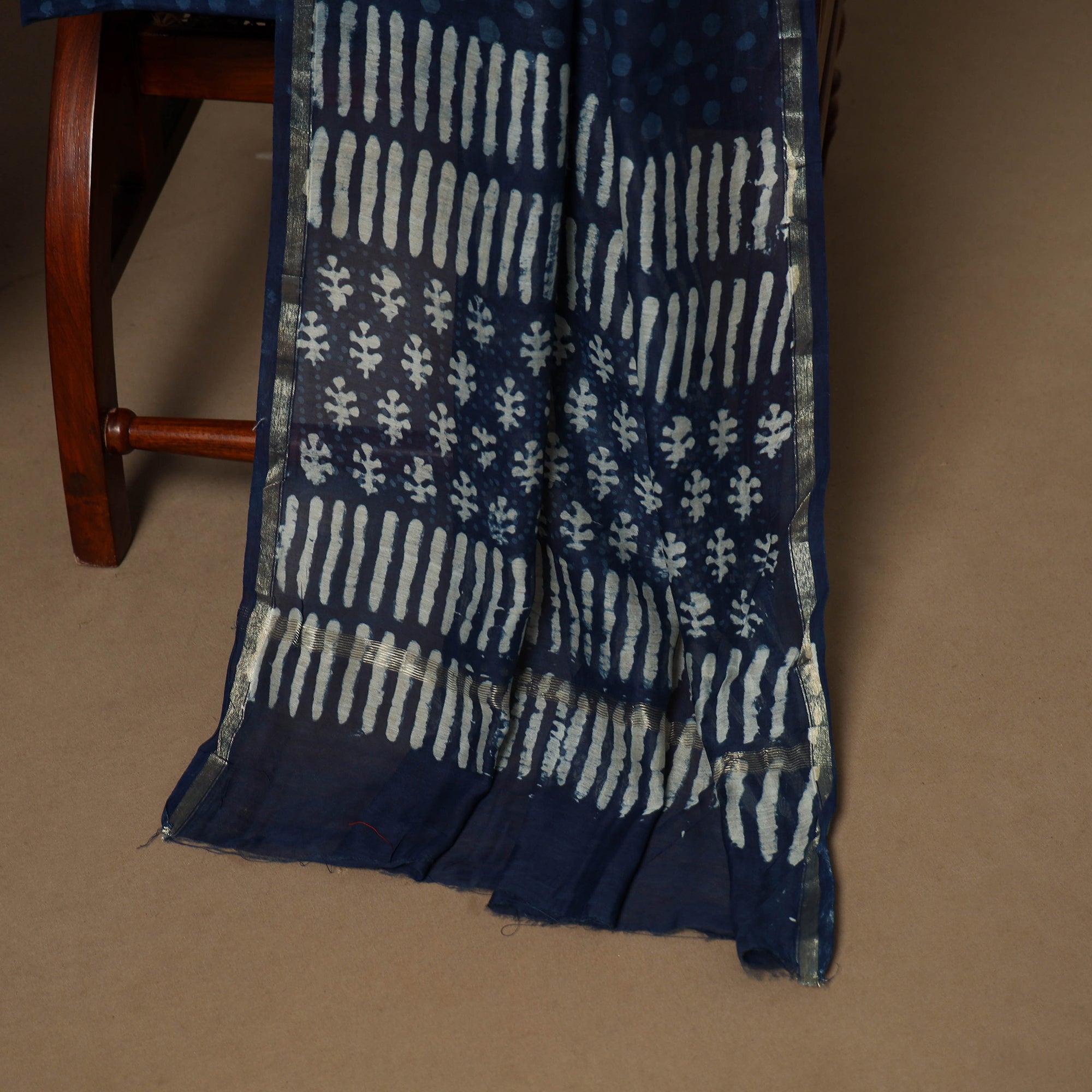 3pc indigo bagru hand block print dress material is crafted from chanderi silk-cotton fabric and includes a kurta a matching dupatta and a cotton bottom. Adorned with fine motifs from Rajasthan, each piece is made using the traditional hand block printing technique, where artisans use hand-carved wooden blocks dipped in natural dyes to imprint intricate designs perfect for festive and everyday elegance.