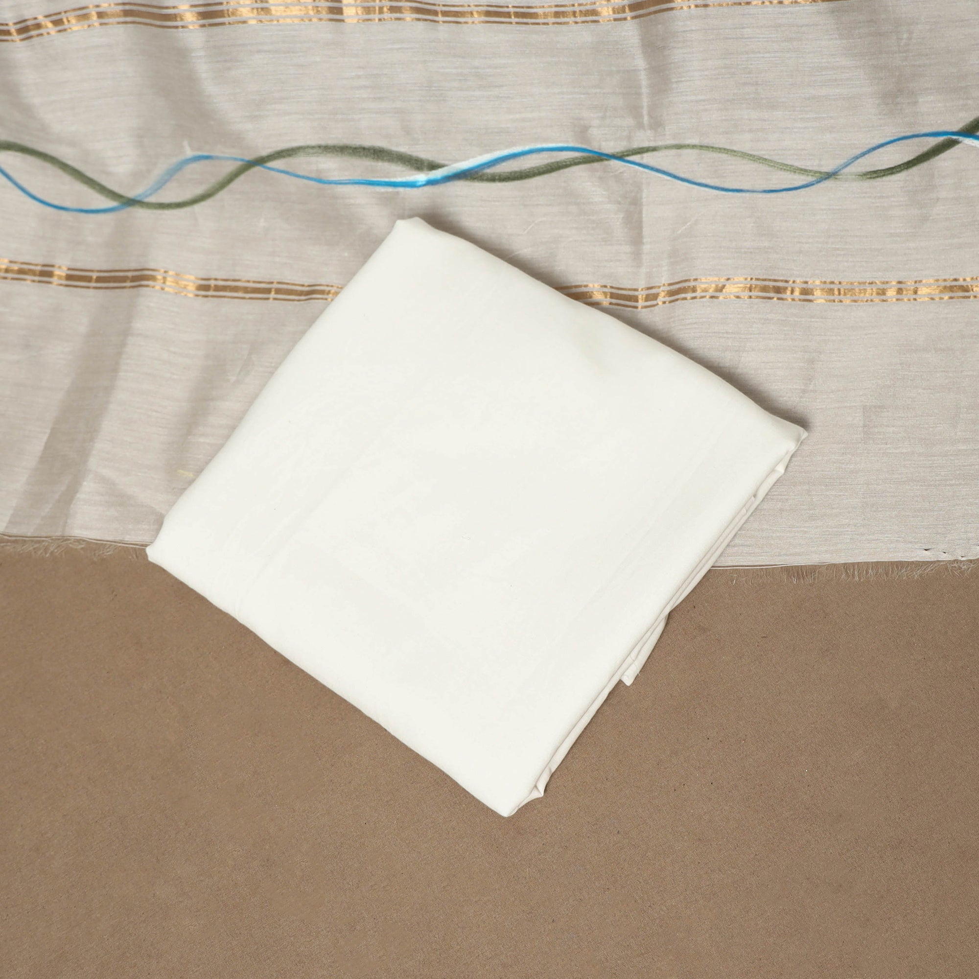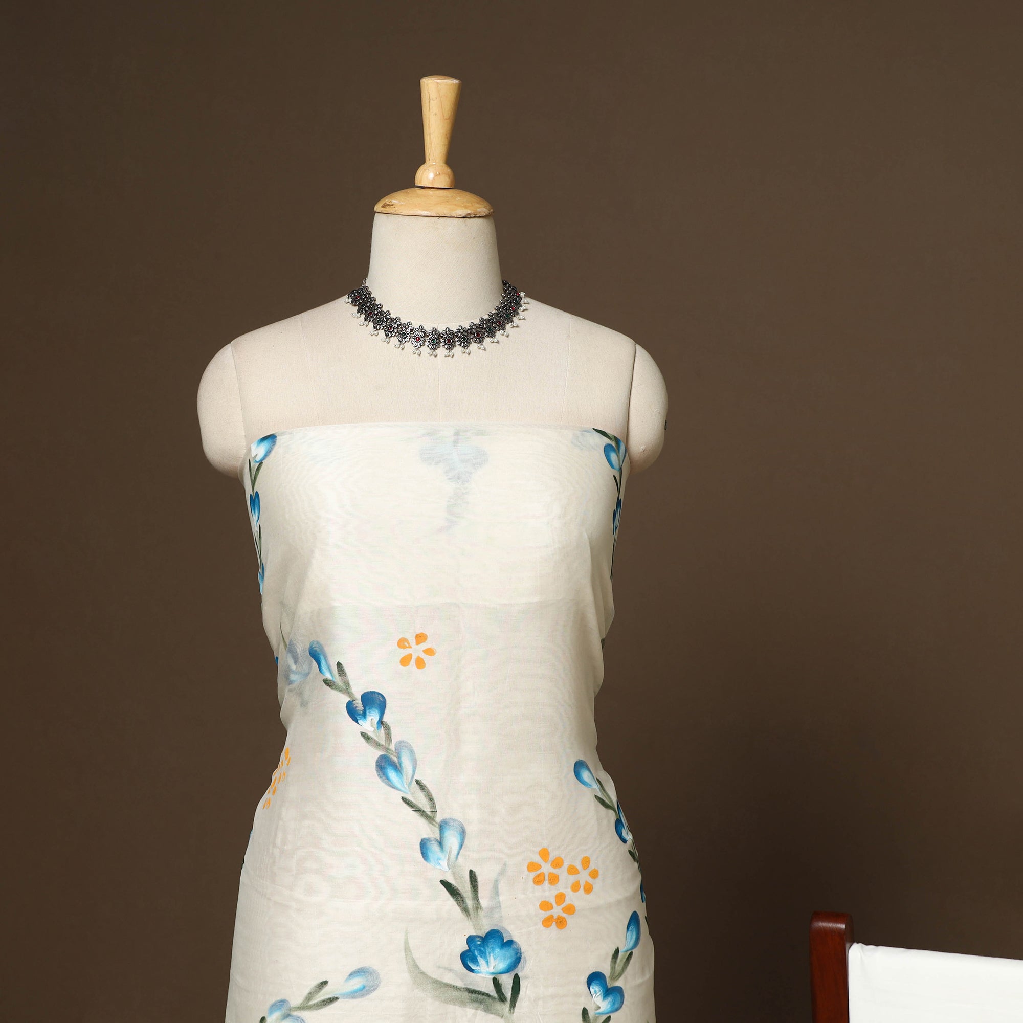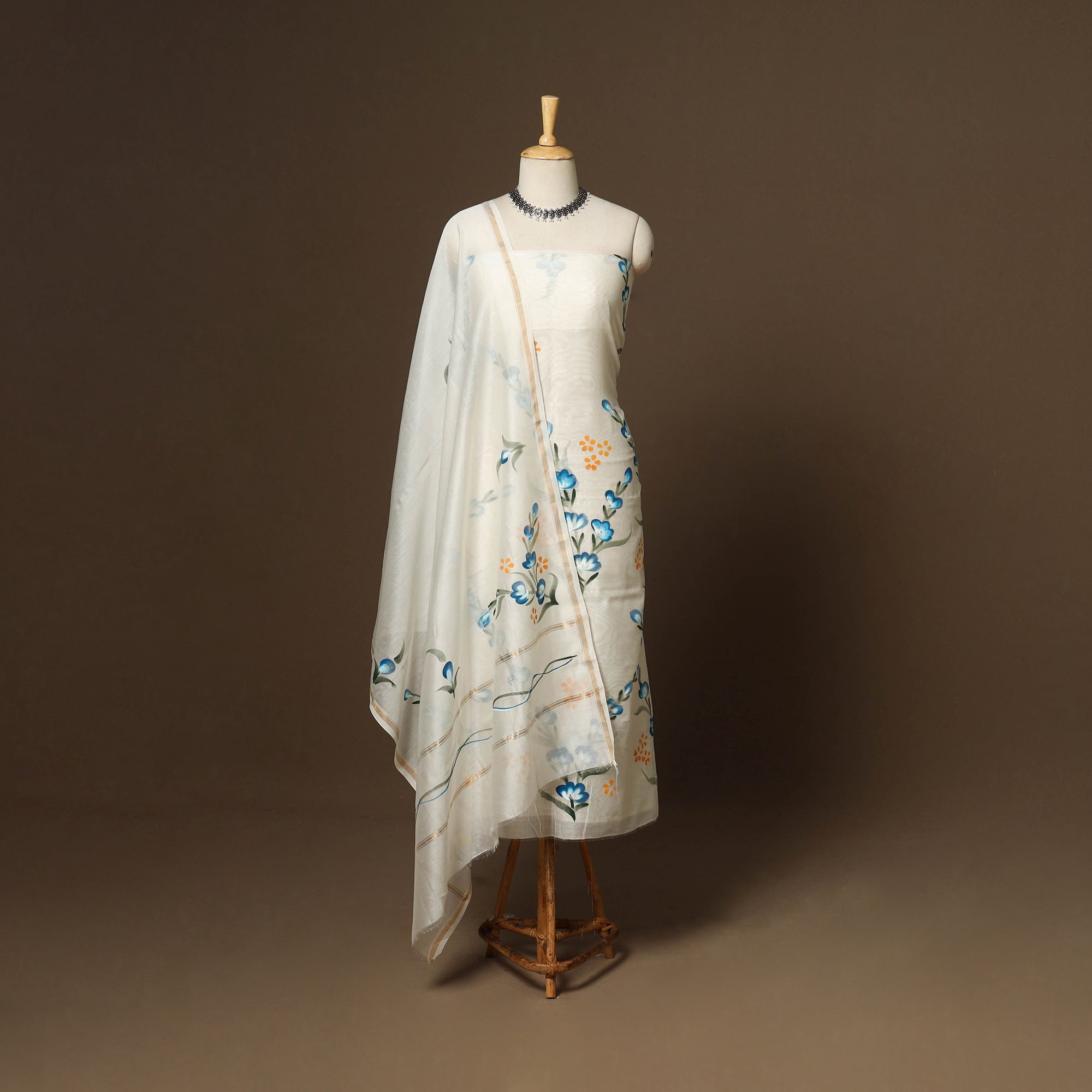 White 3pc chanderi silk cotton unstitched jaipur print dress material includes a kurta, matching dupatta and cotton bottom. The fabric features traditional jaipur prints known for their vibrant colors and detailed motifs. Soft, lightweight and versatile it brings a perfect balance of comfort and style, making it suitable for festive occasions or casual ethnic wear.