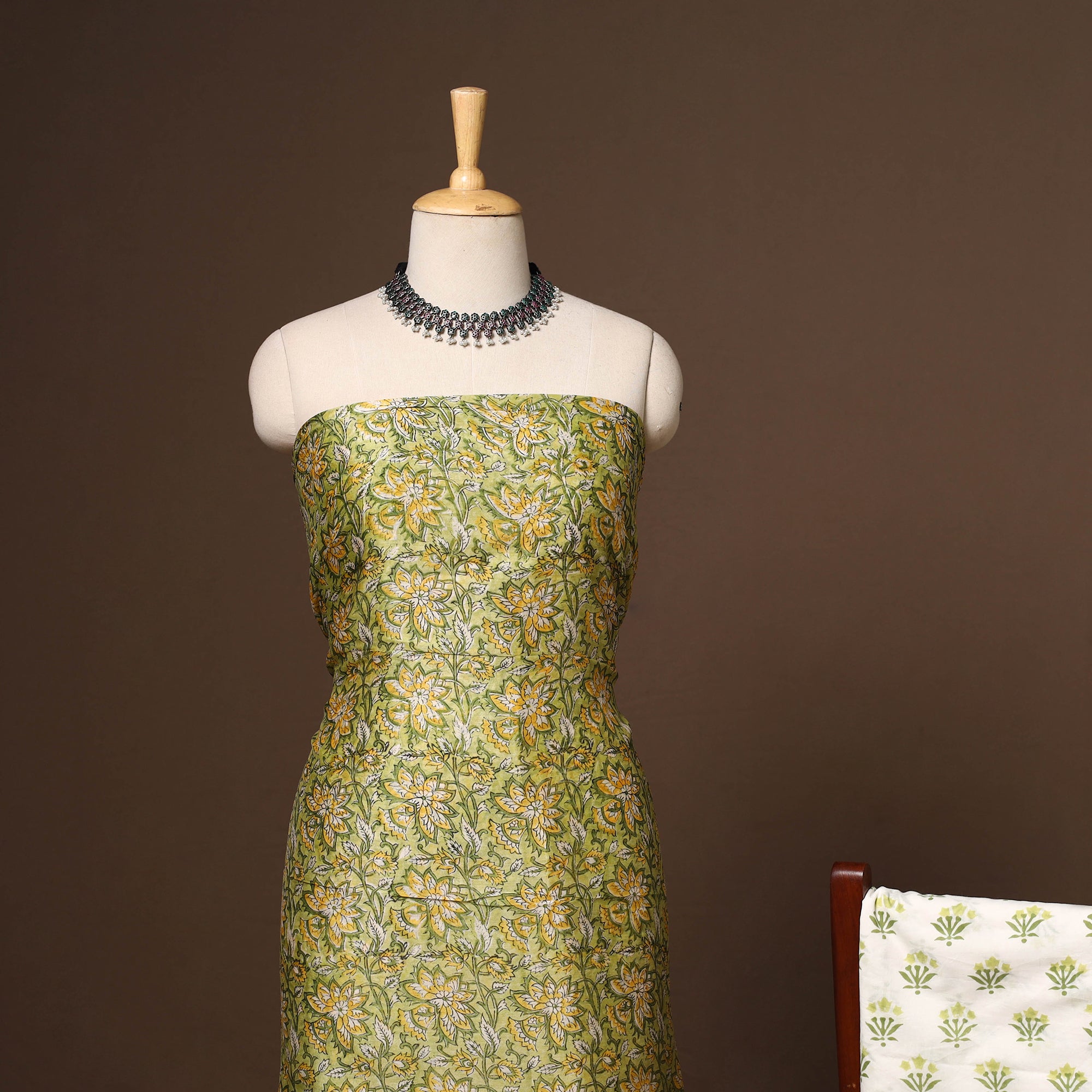 This elegant green 3pc sanganeri block print dress material includes a beautifully designed kurta, a matching dupatta, and a comfortable cotton bottom. Made from chanderi silk-cotton, it features intricate floral motifs created using traditional VAT dyes. The subtle zari border adds a refined touch, making it a perfect blend of Rajasthani elegance and everyday comfort.
