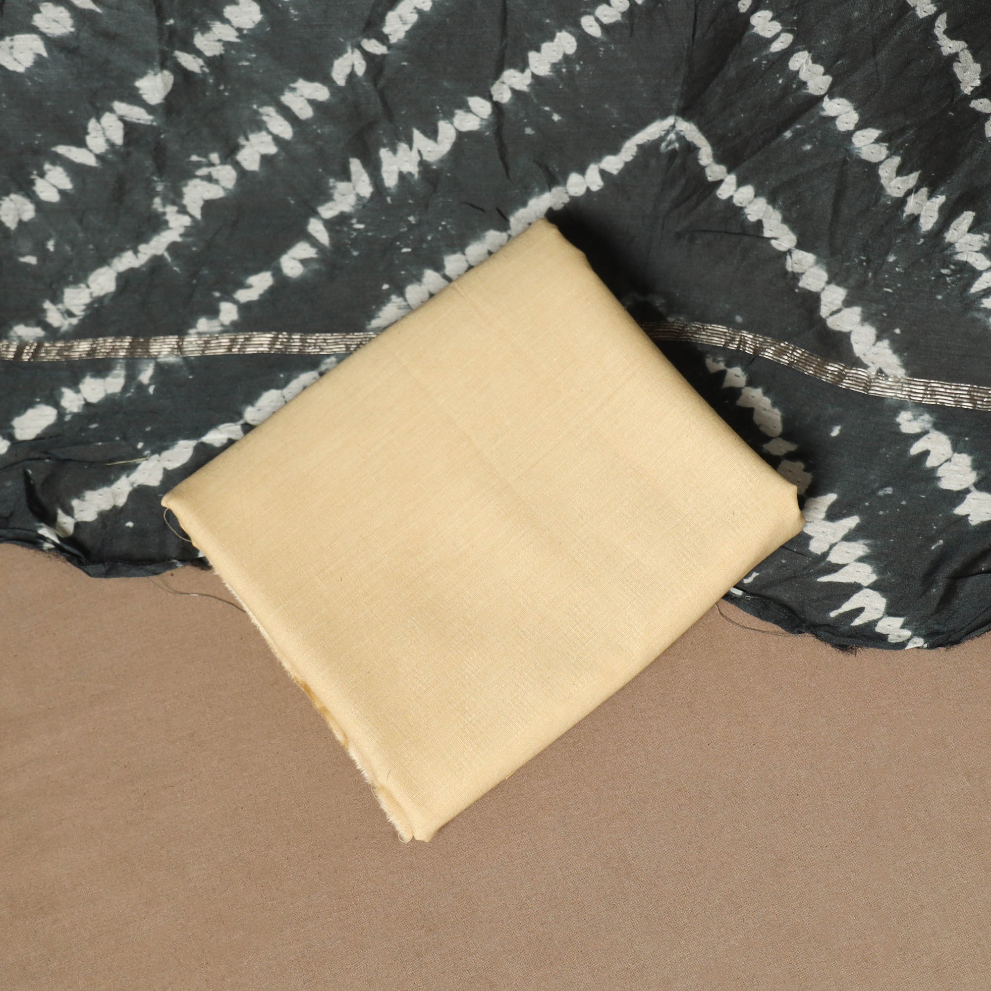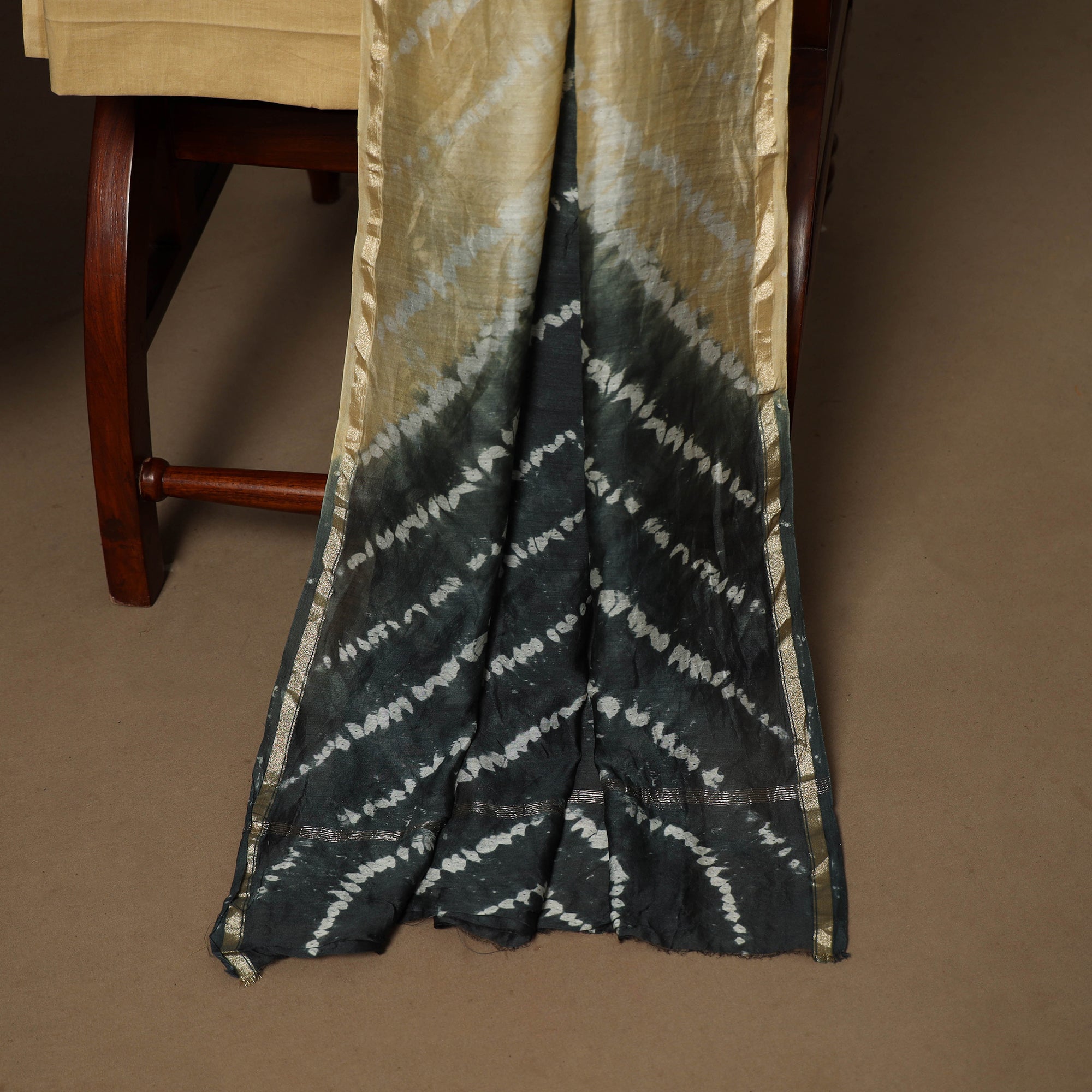 Black 3pc tie-dye shibori dress material is made from chanderi silk-cotton fabric and includes a kurta, matching dupatta and cotton bottom. Shibori is a traditional tie-dye technique where the fabric is carefully tied and dyed to create unique patterns and textures. Each piece reflects Rajasthani artistry, offering a perfect mix of graceful style and everyday comfort for any occasion.