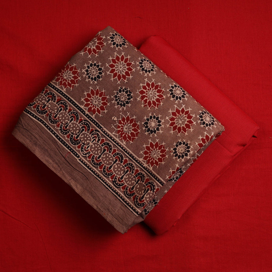 This 3pc cotton brown ajrakh print kurta with a plain dupatta is a perfect blend of tradition and elegance. The kurta features authentic Ajrakh hand block printing from Kutch, Gujarat, crafted using natural dyes and intricate motifs. Paired with a plain cotton dupatta and a matching bottom fabric, this set offers ethnic charm, making it perfect for any occasion.