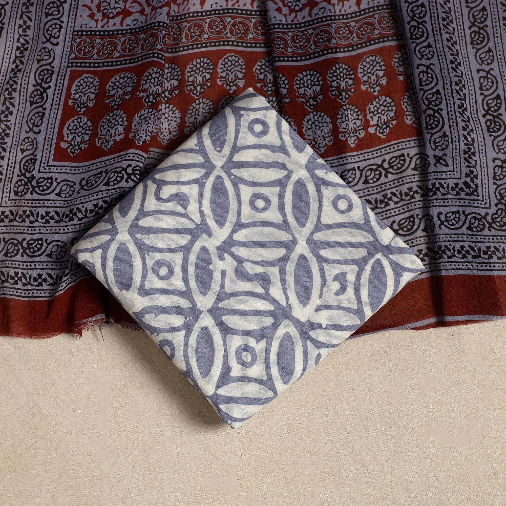 This gray 3-piece cotton set, crafted in Madhya Pradesh, celebrates the richness of India’s age-old textile traditions. The kurta showcases bagh screen printing, known for its classic paisley motifs. The bottom complements it with traditional hand batik work, a wax-resist dyeing technique passed down through generations. The mul cotton dupatta brings both crafts together in one harmonious piece. Ideal for festive gatherings or everyday traditional wear.