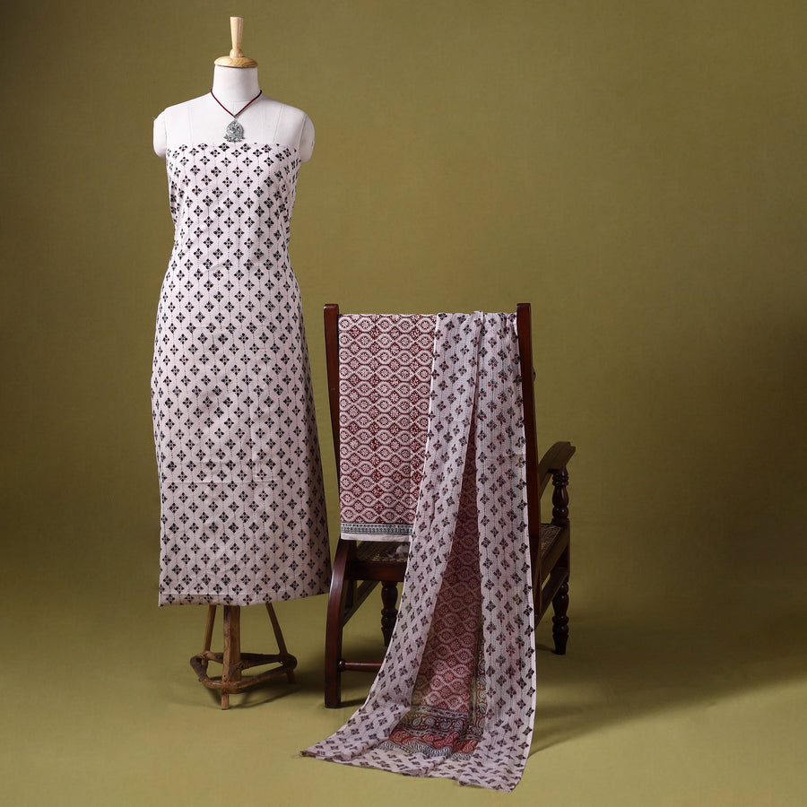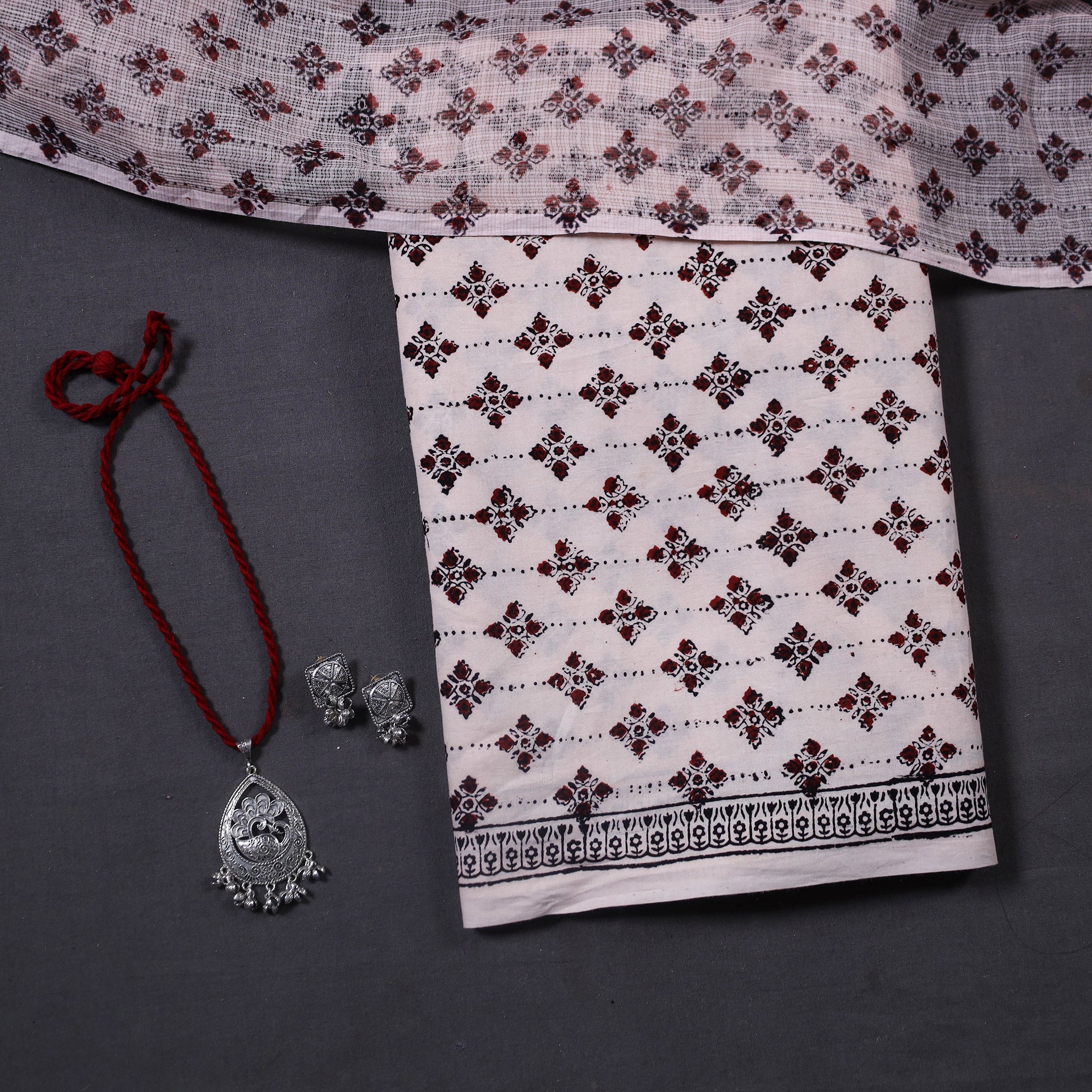 Elevate your wardrobe with this 3pc beige bagh print dress material set, handcrafted in Madhya Pradesh. Made using traditional hand block printing and natural dyes, the set features intricate patterns. The kurta and bottom are crafted from breathable cotton for all-day comfort, and it comes with a lightweight kota doria dupatta. The set also includes a matching necklace and earrings to complete your look. ideal for casual gatherings, workwear, or relaxed weekend dressing.