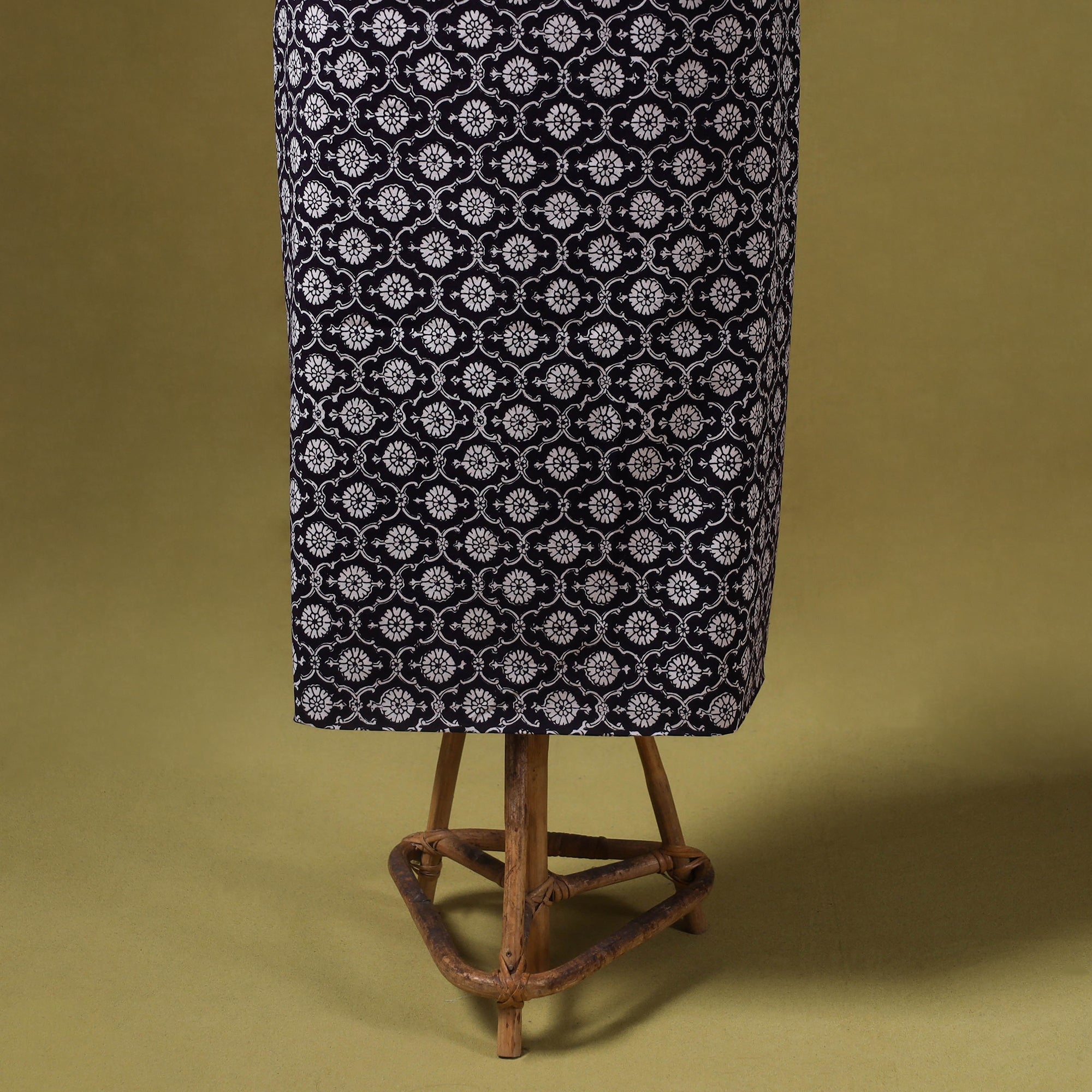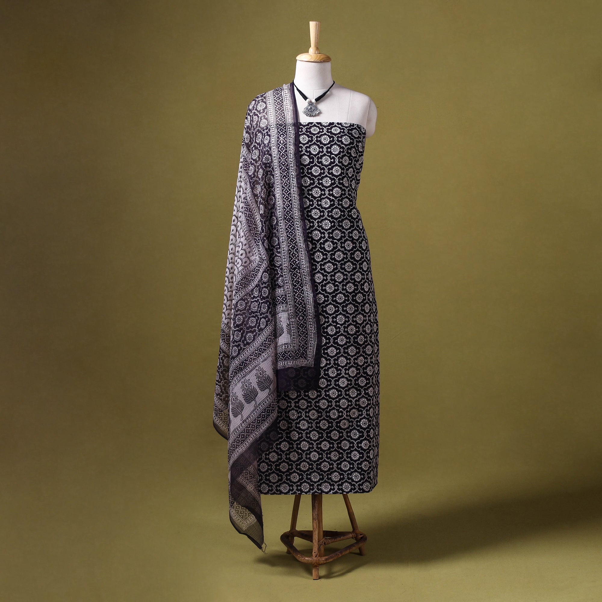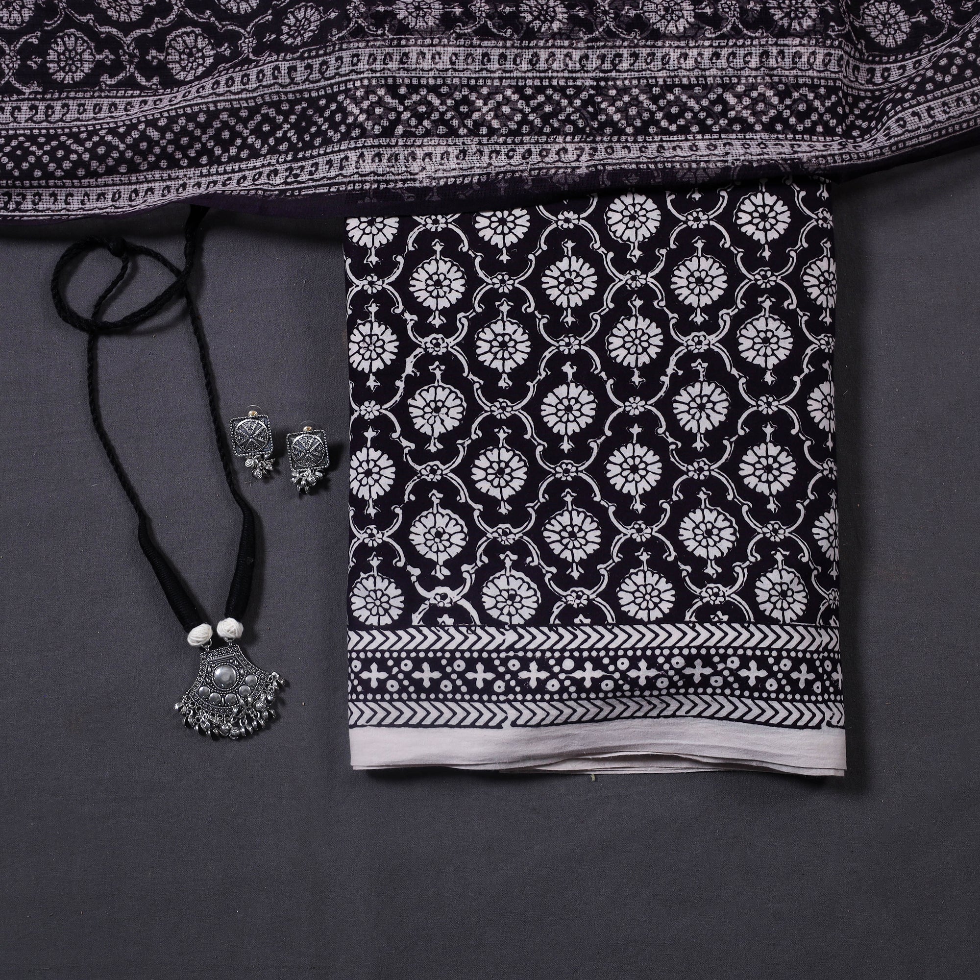 Elevate your wardrobe with this 3pc black bagh print dress material set, handcrafted in Madhya Pradesh. Made using traditional hand block printing and natural dyes, the set features intricate patterns. The kurta and bottom are crafted from breathable cotton for all-day comfort, and it comes with a lightweight kota doria dupatta. The set also includes a matching necklace and earrings to complete your look. ideal for casual gatherings, workwear, or relaxed weekend dressing.