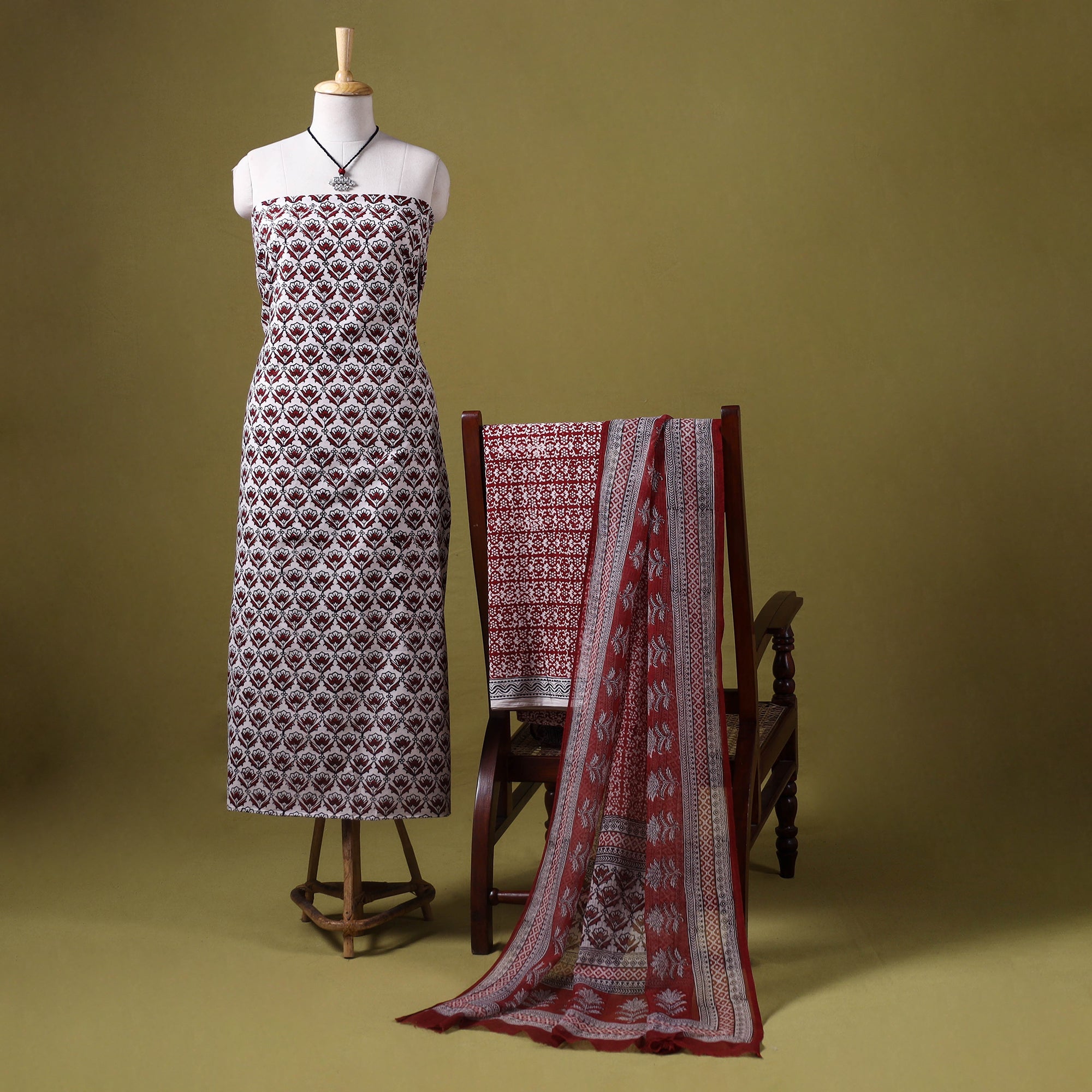 Elevate your wardrobe with this 3pc red bagh print dress material set, handcrafted in Madhya Pradesh. Made using traditional hand block printing and natural dyes, the set features intricate patterns. The kurta and bottom are crafted from breathable cotton for all-day comfort, and it comes with a lightweight kota doria dupatta. The set also includes a matching necklace and earrings to complete your look. ideal for casual gatherings, workwear, or relaxed weekend dressing.