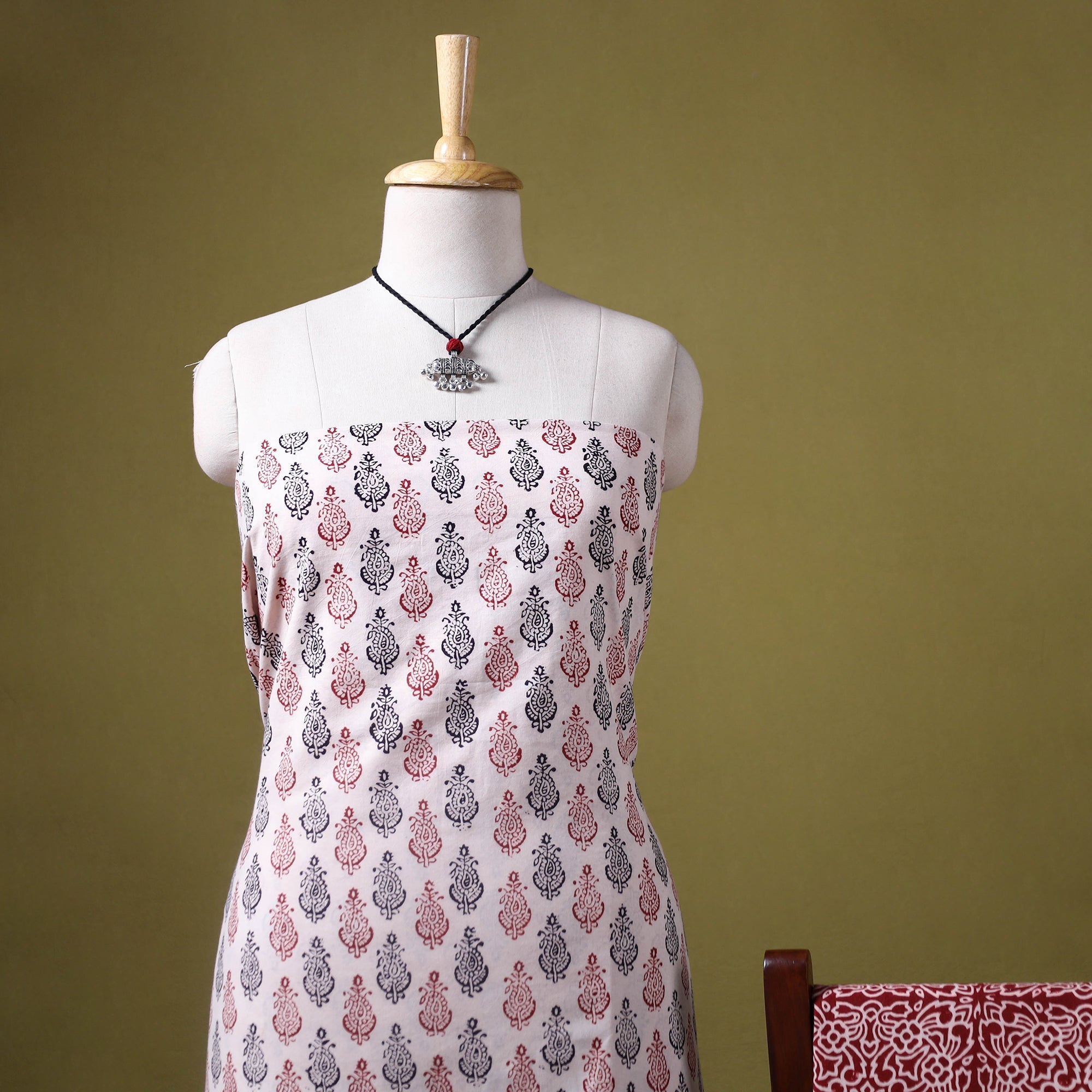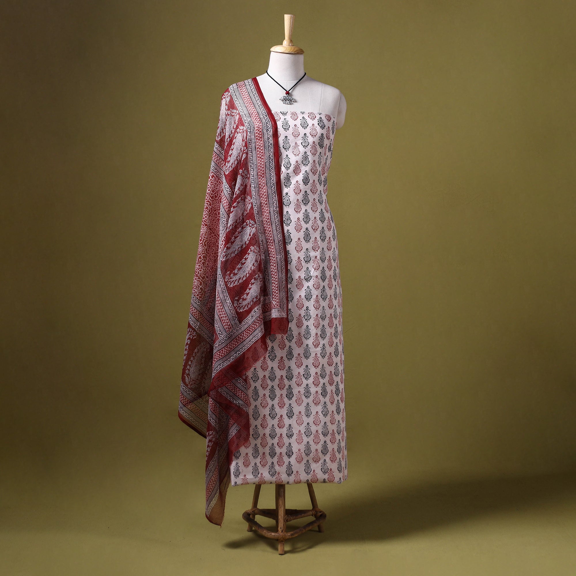 Elevate your wardrobe with this 3pc beige bagh print dress material set, handcrafted in Madhya Pradesh. Made using traditional hand block printing and natural dyes, the set features intricate patterns. The kurta and bottom are crafted from breathable cotton for all-day comfort, and it comes with a lightweight kota doria dupatta. The set also includes a matching necklace and earrings to complete your look. ideal for casual gatherings, workwear, or relaxed weekend dressing.