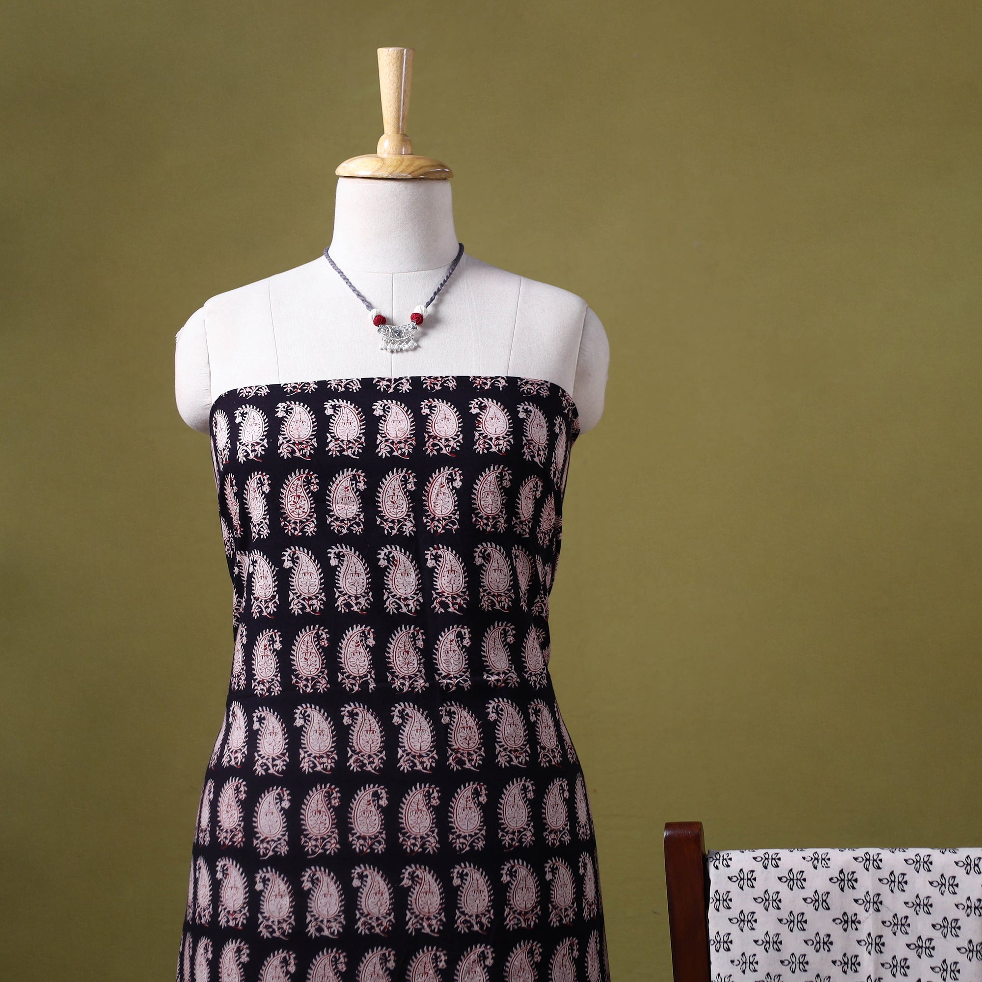 Elevate your wardrobe with this 3pc black bagh print dress material set, handcrafted in Madhya Pradesh. Made using traditional hand block printing and natural dyes, the set features intricate patterns. The kurta and bottom are crafted from breathable cotton for all-day comfort, and it comes with a lightweight kota doria dupatta. The set also includes a matching necklace and earrings to complete your look. ideal for casual gatherings, workwear, or relaxed weekend dressing.