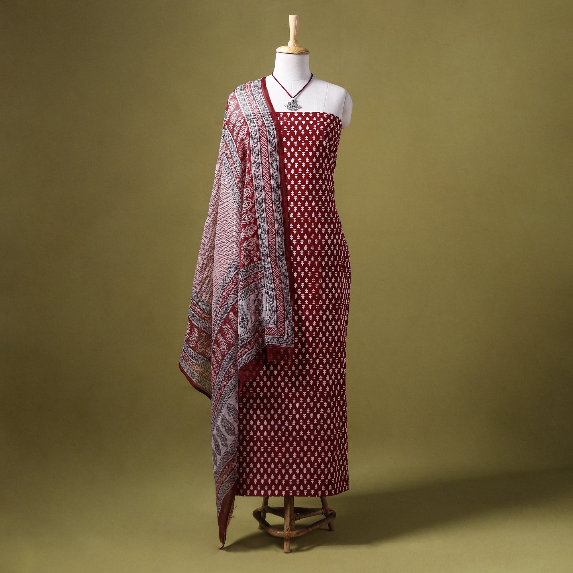 Elevate your wardrobe with this 3pc red bagh print dress material set, handcrafted in Madhya Pradesh. Made using traditional hand block printing and natural dyes, the set features intricate patterns. The kurta and bottom are crafted from breathable cotton for all-day comfort, and it comes with a lightweight kota doria dupatta. The set also includes a matching necklace and earrings to complete your look. ideal for casual gatherings, workwear, or relaxed weekend dressing.
