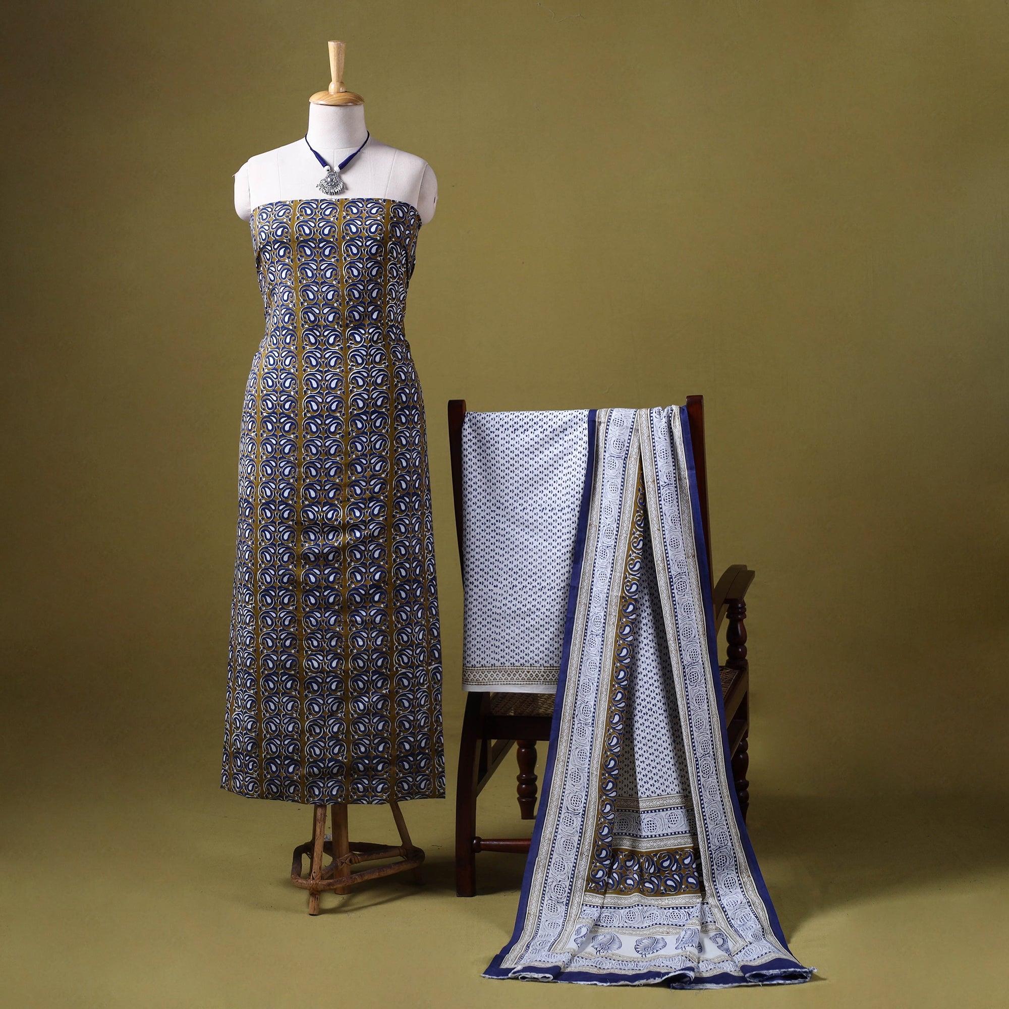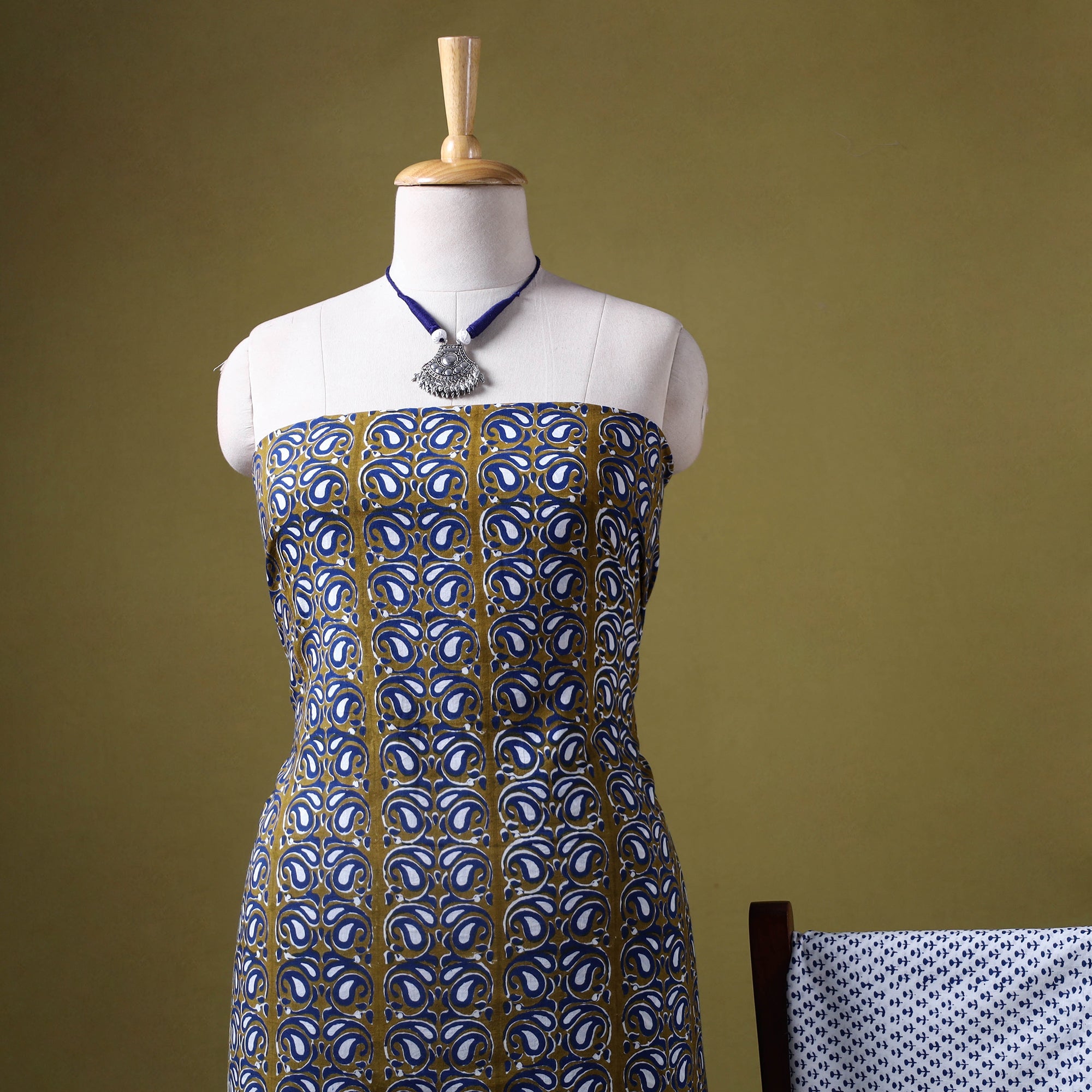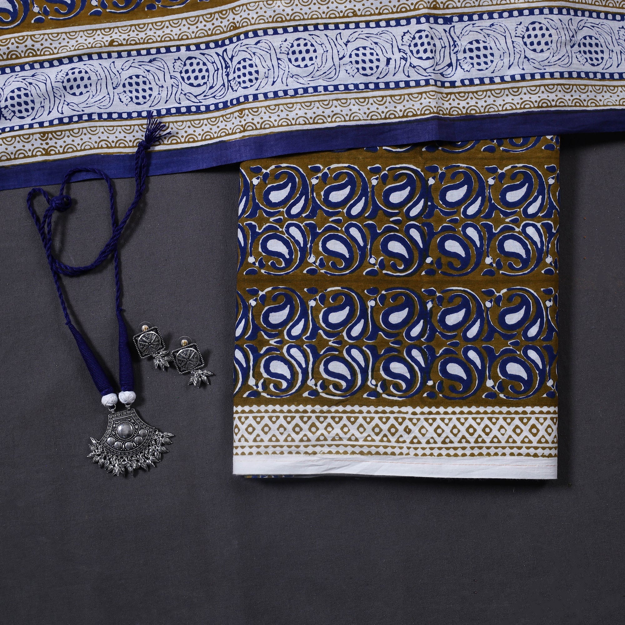 Elevate your wardrobe with this 3pc green bagh print dress material set, handcrafted in Madhya Pradesh. Made using traditional hand block printing and natural dyes, the set showcases intricate patterns. The kurta, bottom, and dupatta are crafted from breathable cotton for all-day comfort. It also comes with a matching necklace and earrings, adding a touch of handmade charm. Ideal for casual gatherings, workwear, or relaxed weekend dressing.