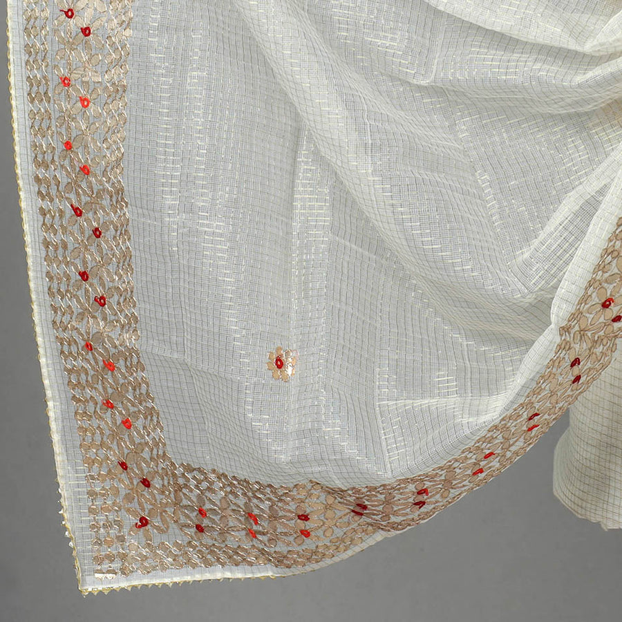 Embrace the elegance of traditional craftsmanship with our white 3pc cotton gota patti work kota doria dress material, Woven in Rajasthan. the Kota Doria fabric blends cotton and lustrous silk, giving it an iconic lightweight and sheer quality. This set includes a dupatta and kurta in fine Kota Doria fabric, along with a plain cotton bottom. Ideal for any occasion, this outfit captures India’s artisanal beauty.